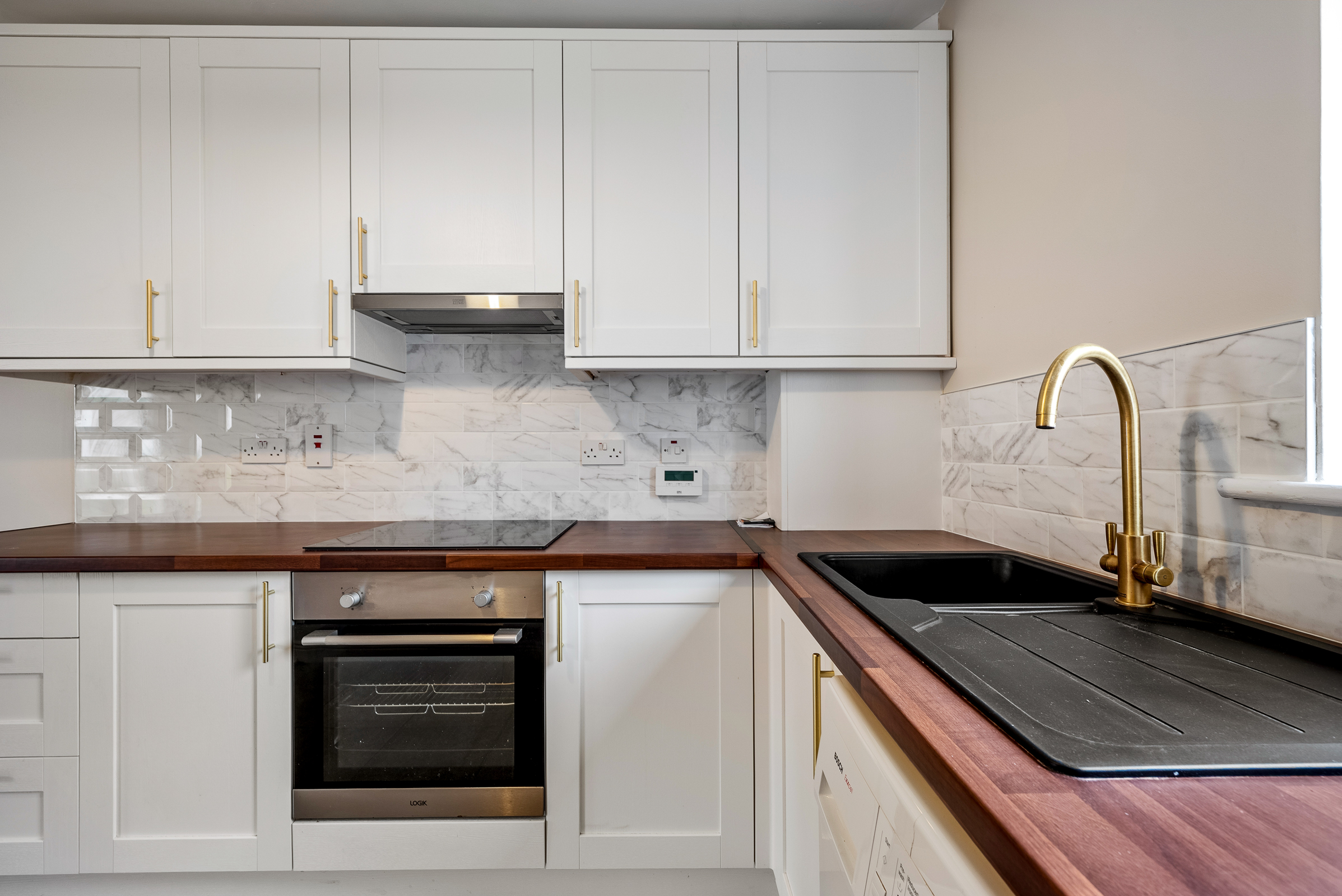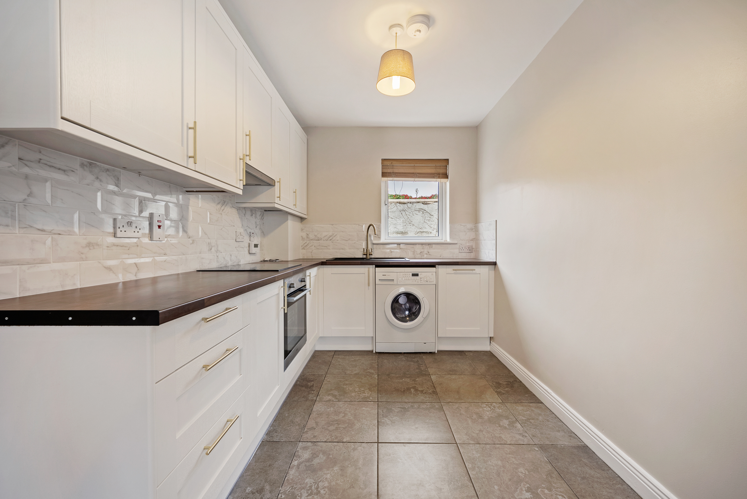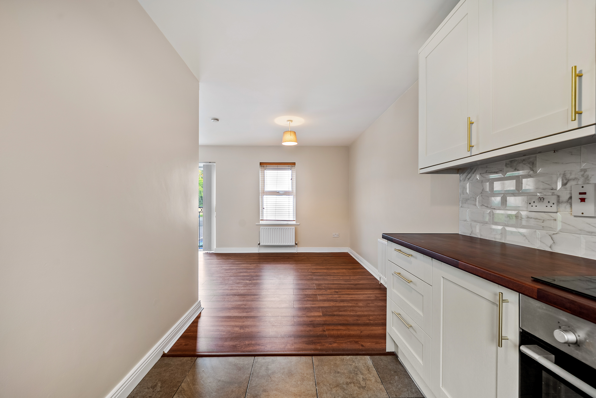 The living area has high quality wooden flooring, two light fittings, plenty of space for a suite of furniture, two radiators, and neutral décor. The kitchen features newly fitted units at eye and floor level with extensive worktop counter and new tiled splashback. The kitchen has attractive tiled flooring, centre light fitting, smoke alarm, integrated oven/hob/extractor fan, stainless steel sink, and plumbing for a washing machine.