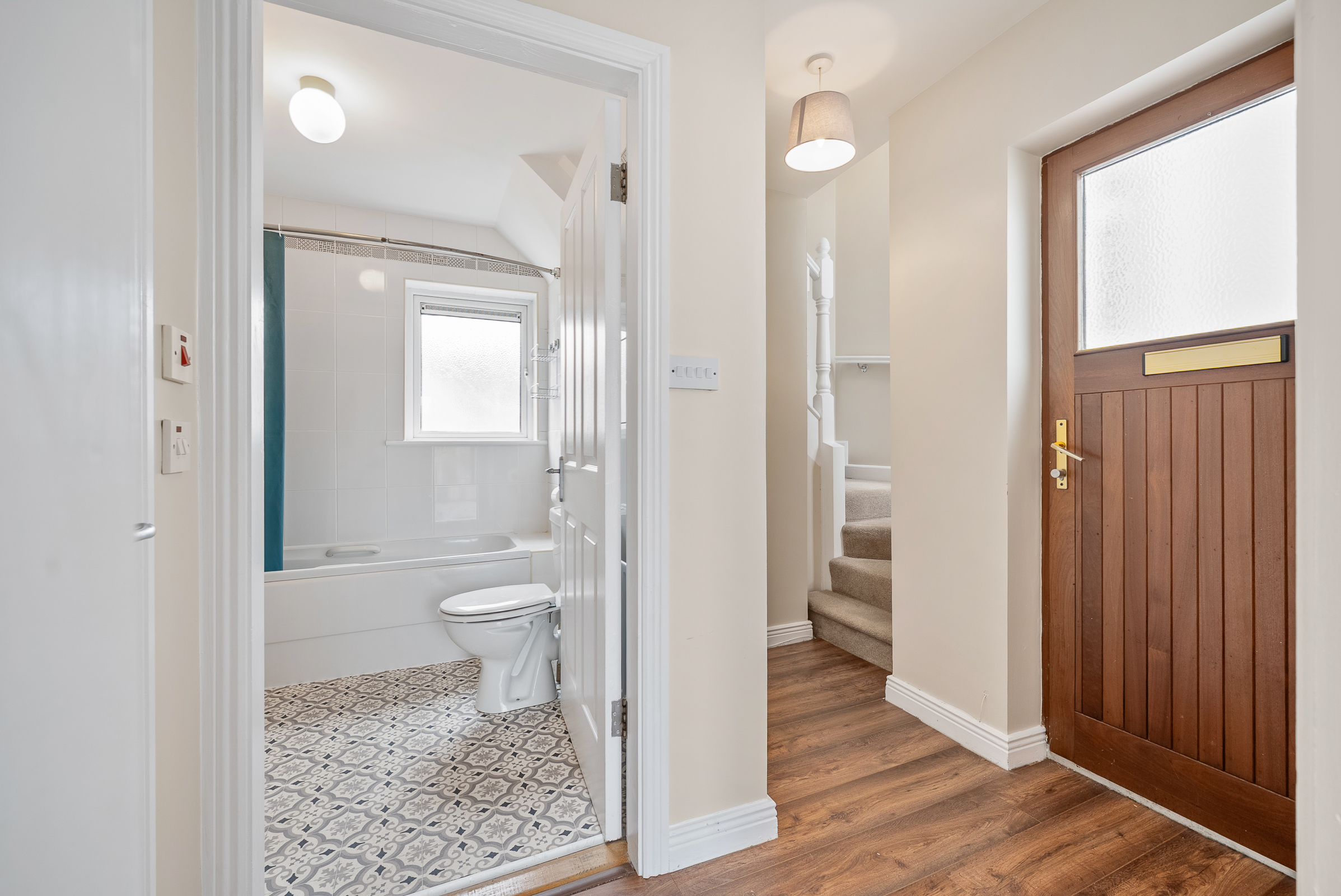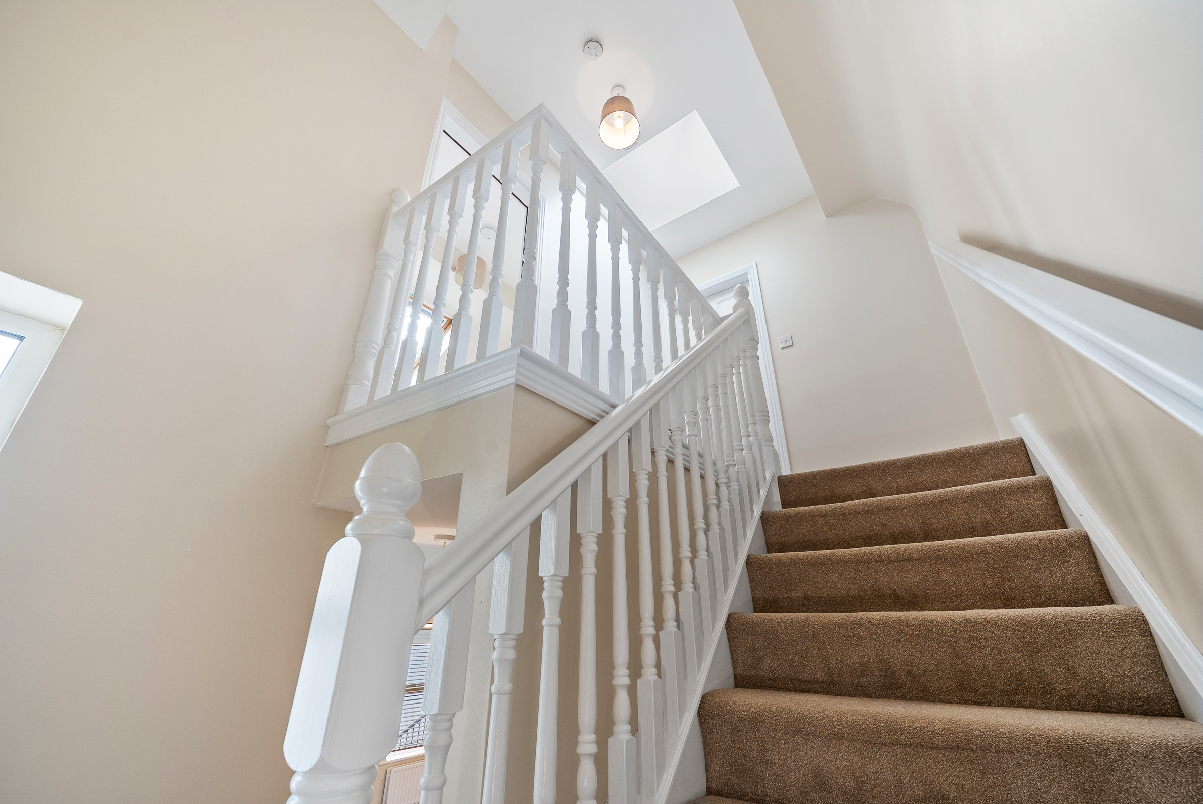 The stairs and landing are fitted with carpet flooring throughout. At the top of the landing there is a Velux window allowing in extensive natural light, attractive neutral décor, a radiator, and solid doors leading to both bedrooms.