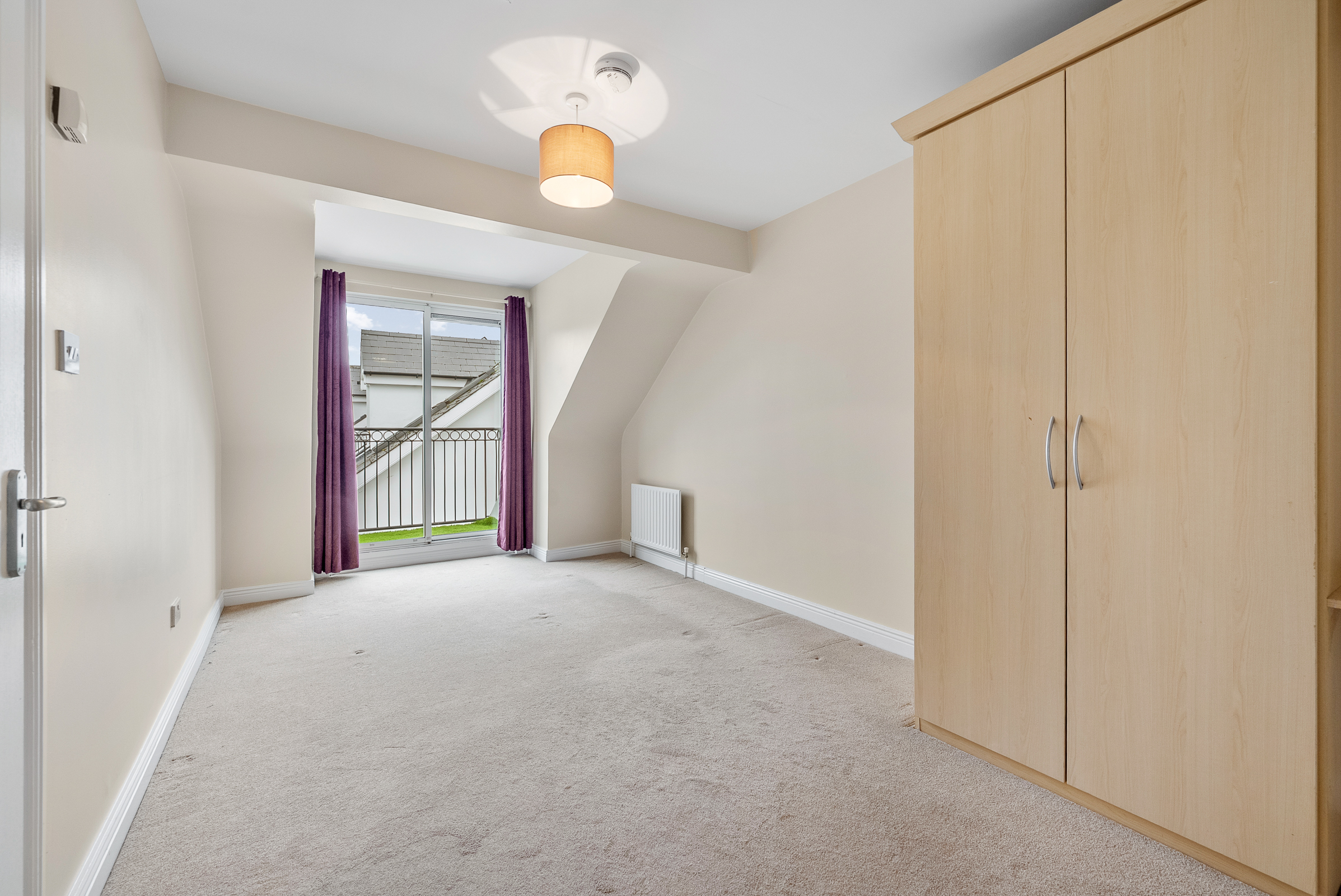 This spacious double bedroom has a sliding door to the front of the property, allowing access to a balcony area. The main bedroom has a built-in wardrobe unit for storage, centre light fitting, radiator, access into the eaves of the attic, neutral décor and carpet flooring,.