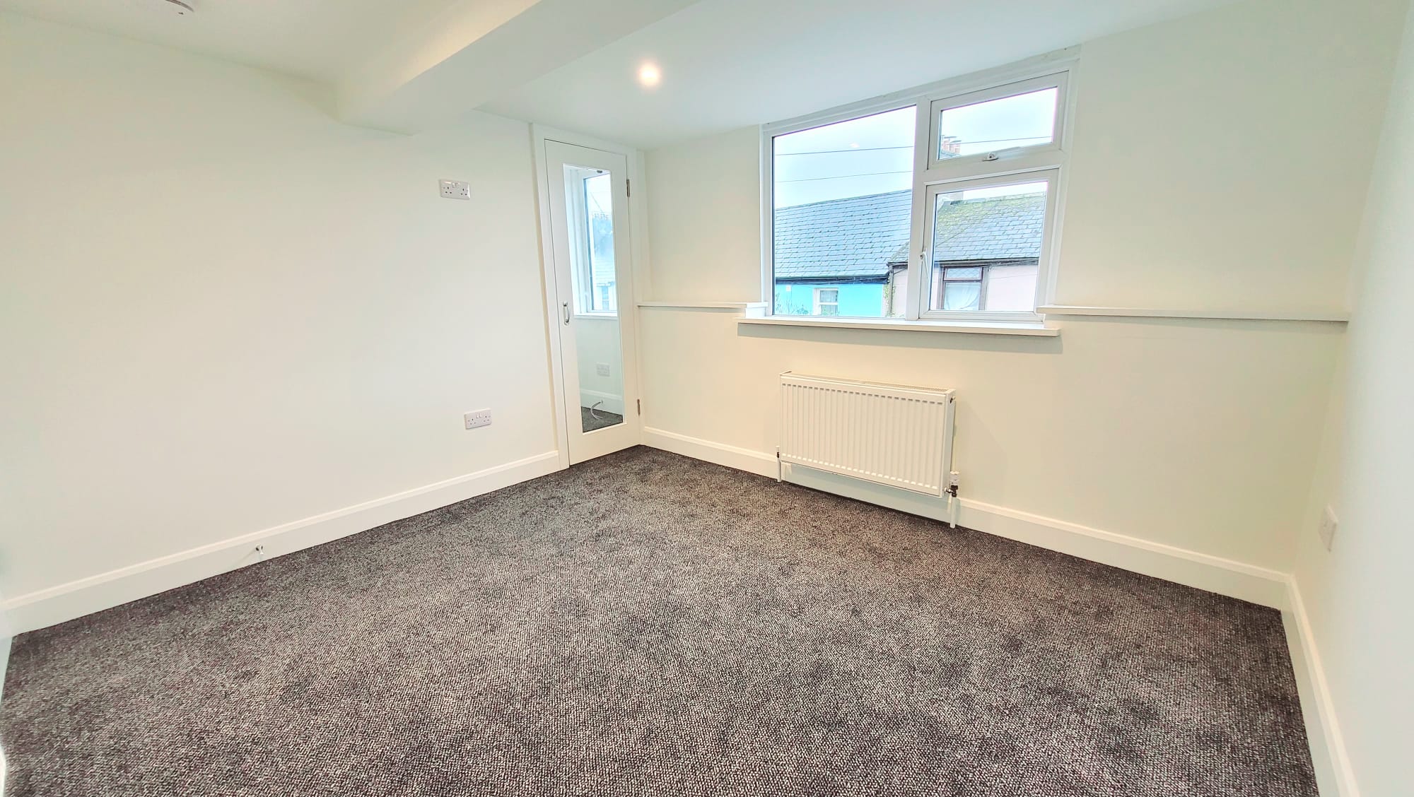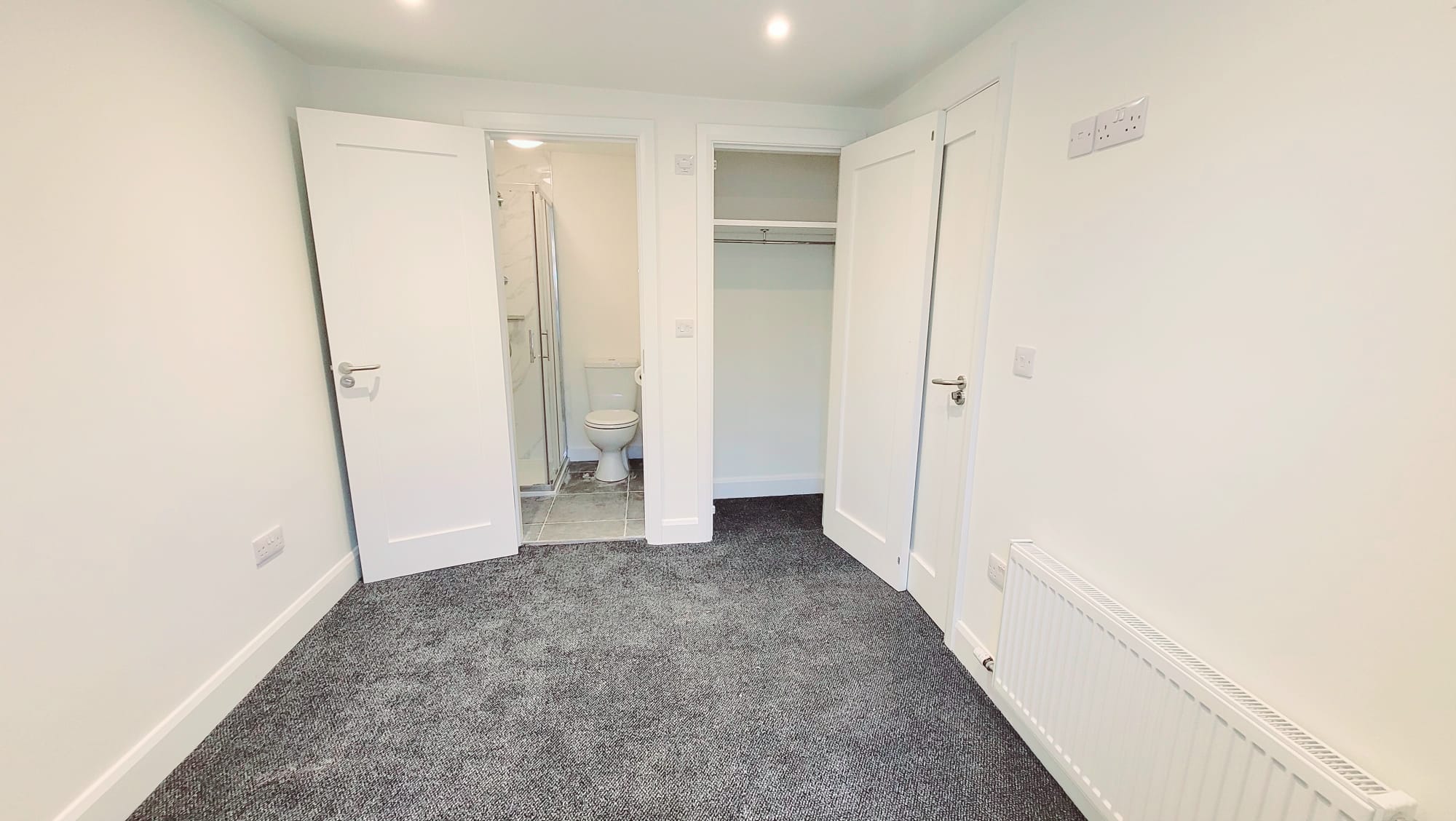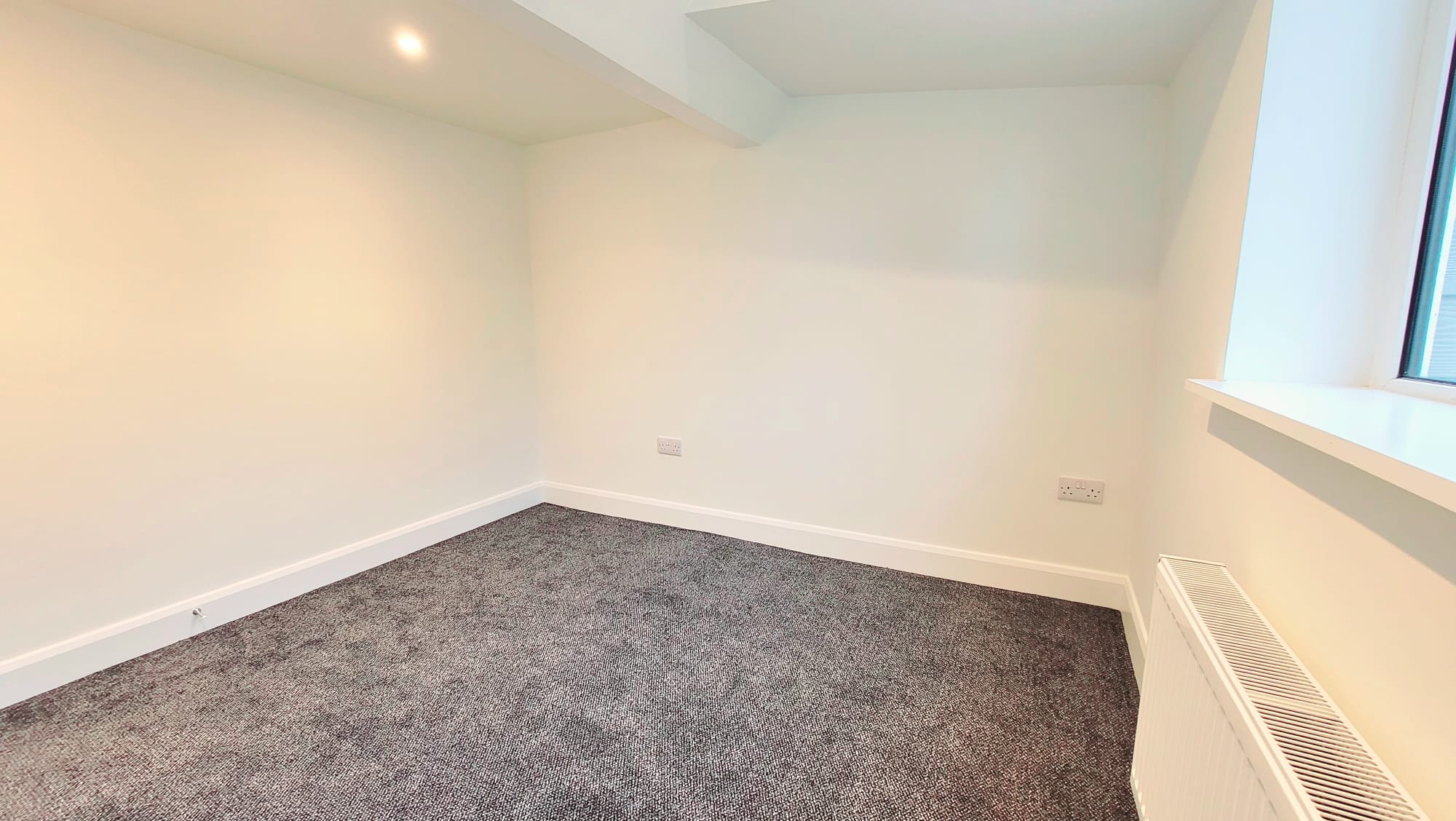 A spacious double bedroom has one window to the rear of the property, high quality new carpet flooring, recessed spot lighting, one large radiator, and eight power points.