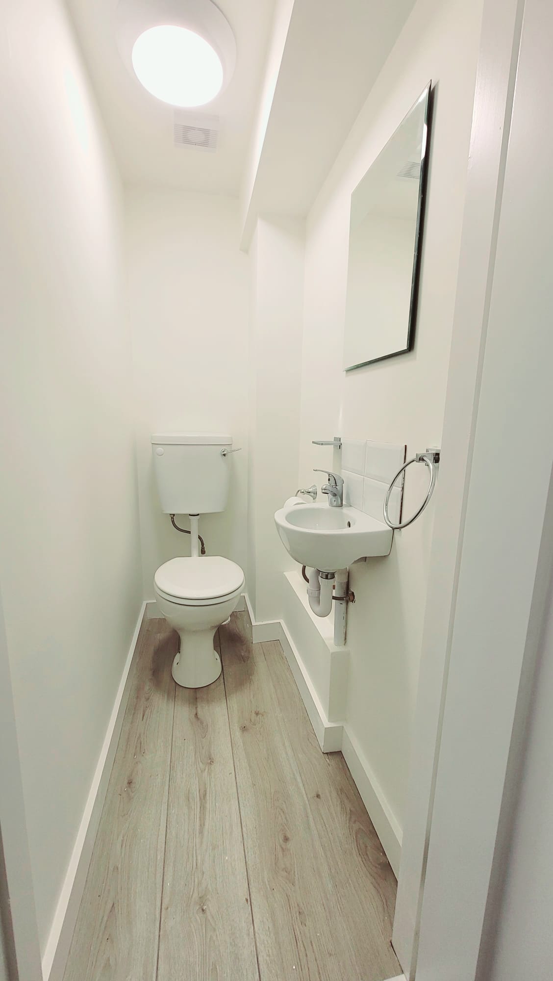 The guest w.c features a two piece suite, laminate timber flooring, tile splashback, one centre light piece, and one extractor fan.