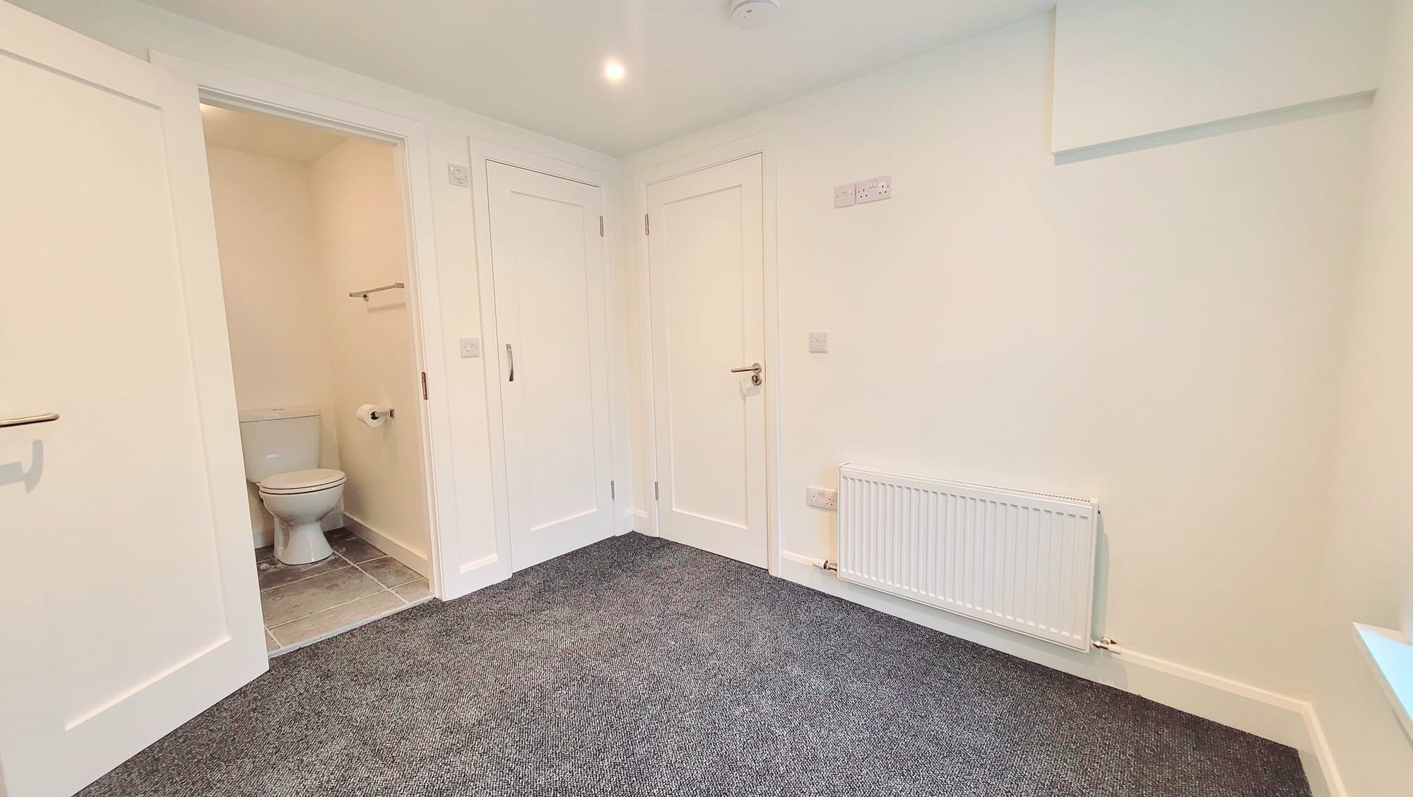 Located on the ground floor, this spacious double bedroom has one window to the front of the property, high quality new carpet flooring, recessed spot lighting, one radiator, one television point, and eight power points. Doors from the room allow access to the walk-in wardrobe space and the en suite bathroom.