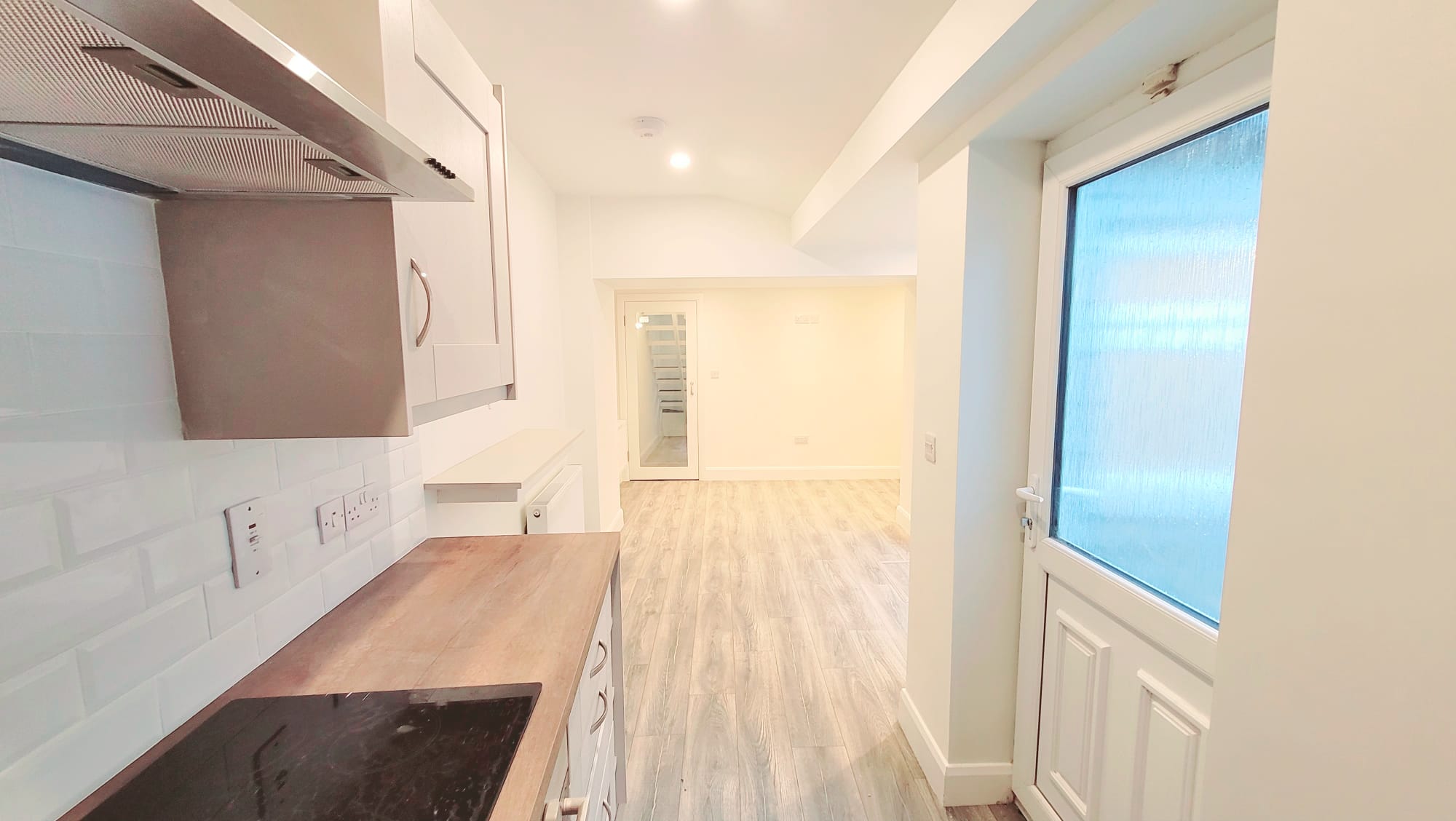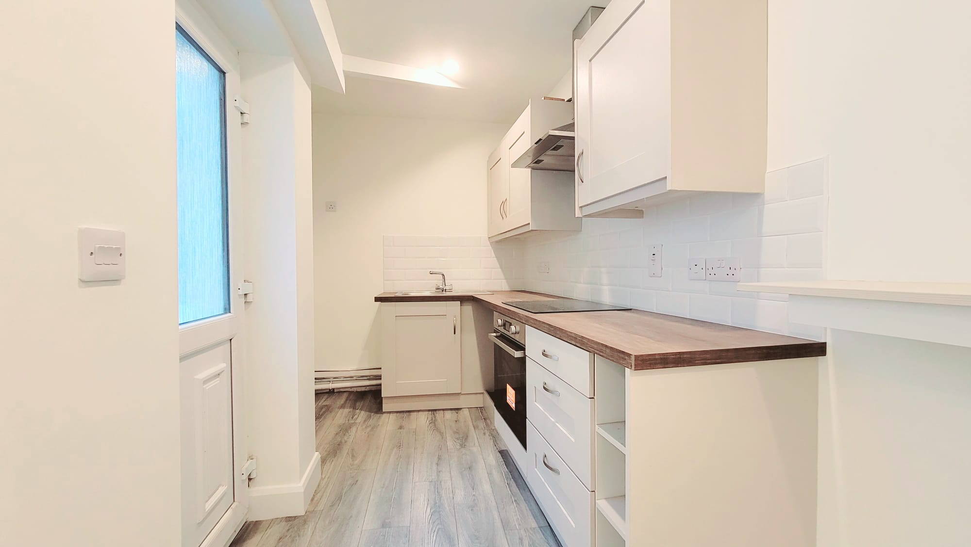 The kitchen features new high quality fitted units at eye and floor level in an L-shape with extensive worktop counter and tile splashback. The kitchen includes an integrated oven/hob/extractor fan, space for a dishwasher, space for a fridge freezer, and five power points. A door from the kitchen allows access to a utility space