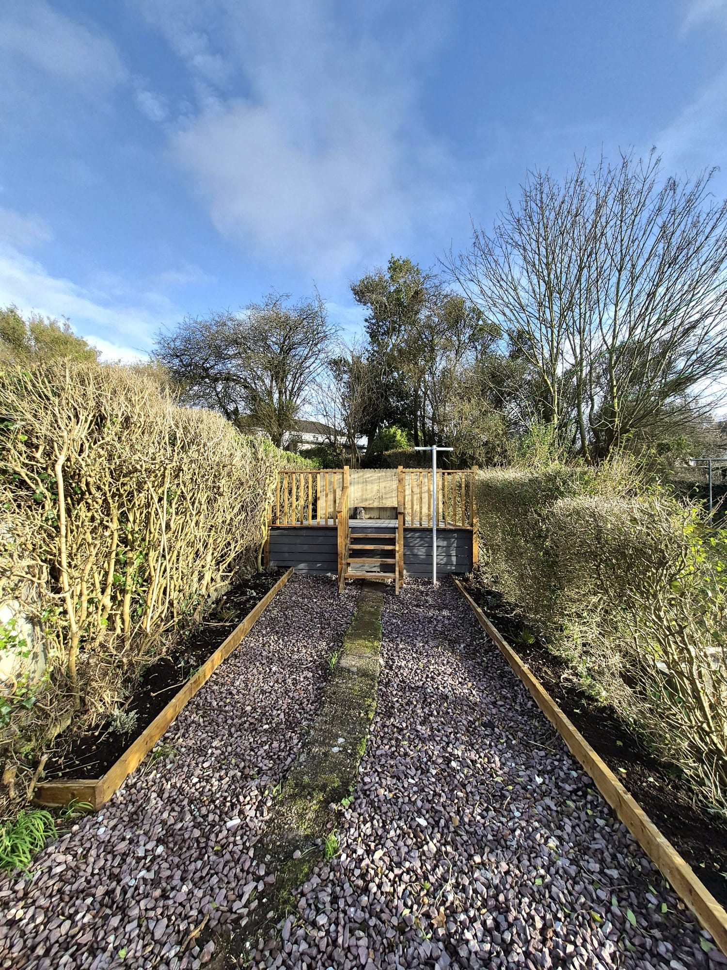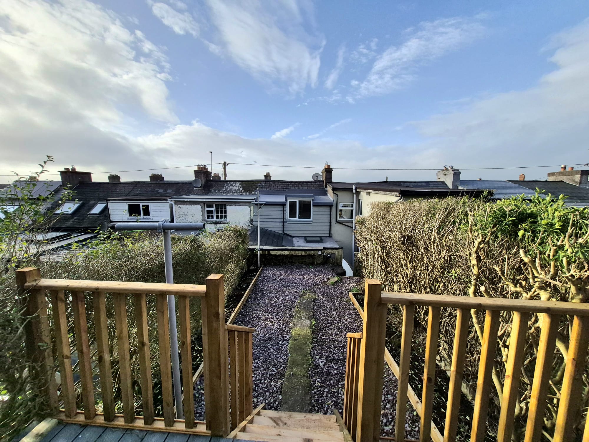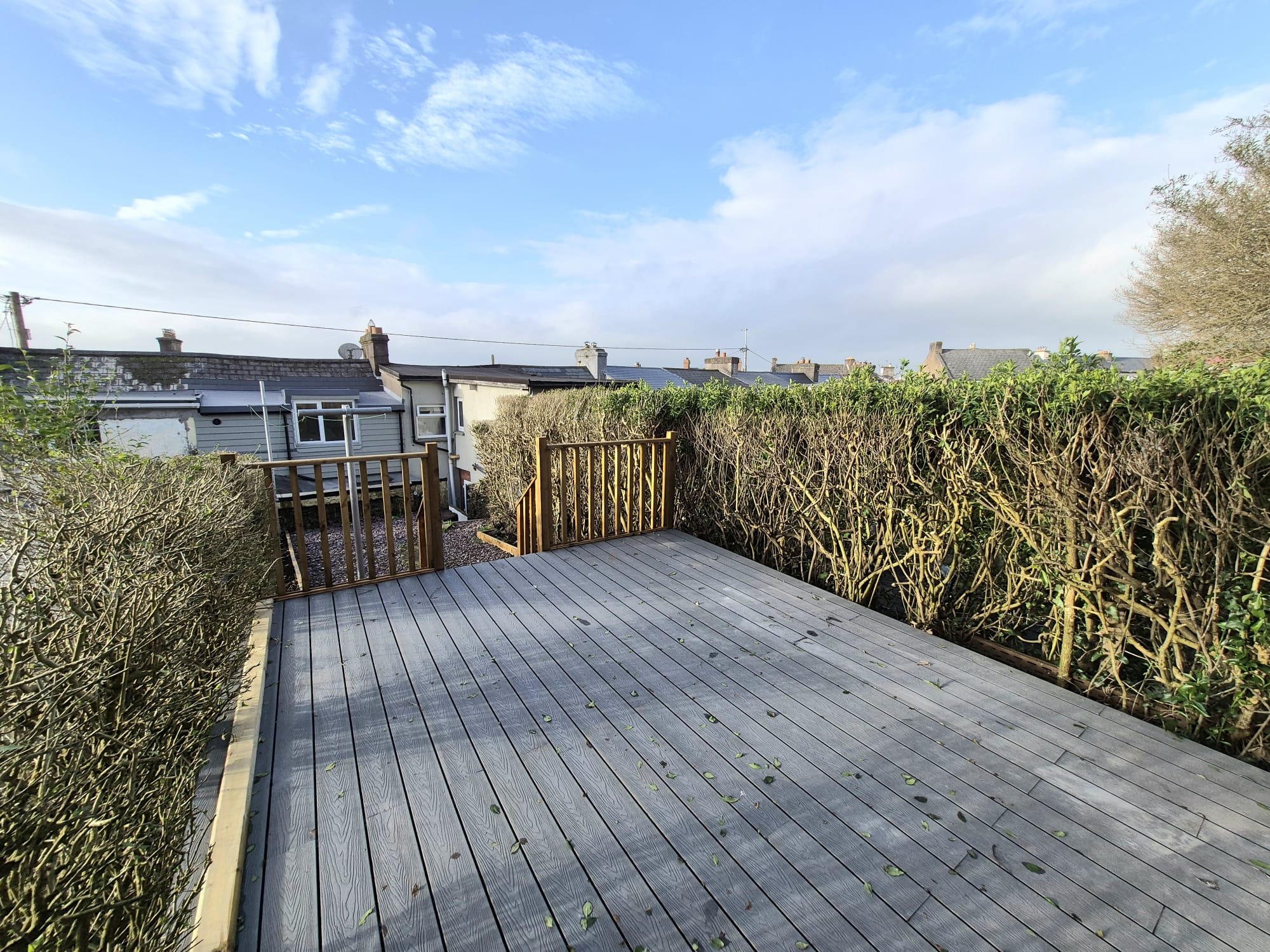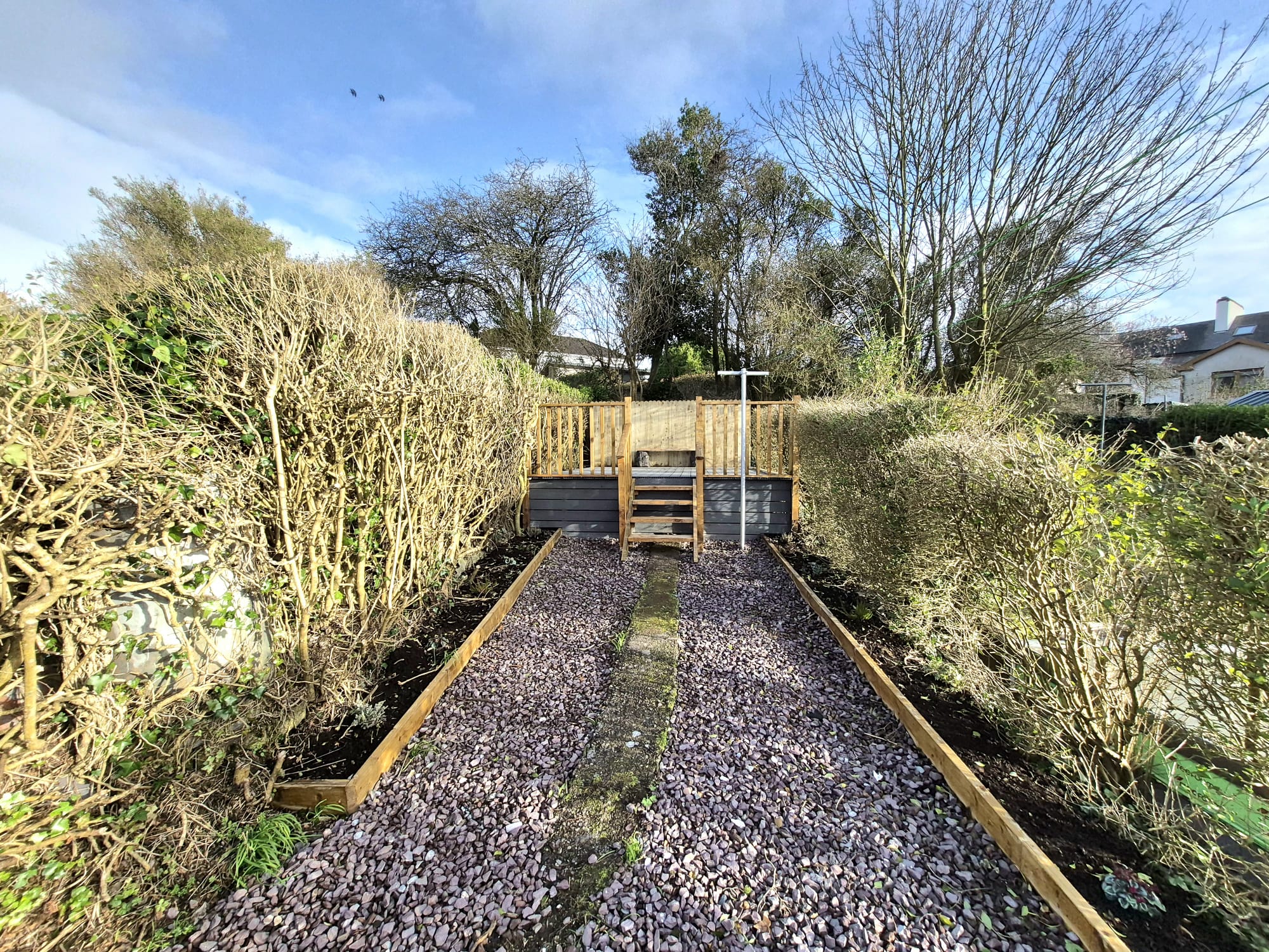 The rear of the property offers a large enclosed rear garden which is set across two levels. There is a maintenance free gravel area which leads to a magnificent raised decking space.