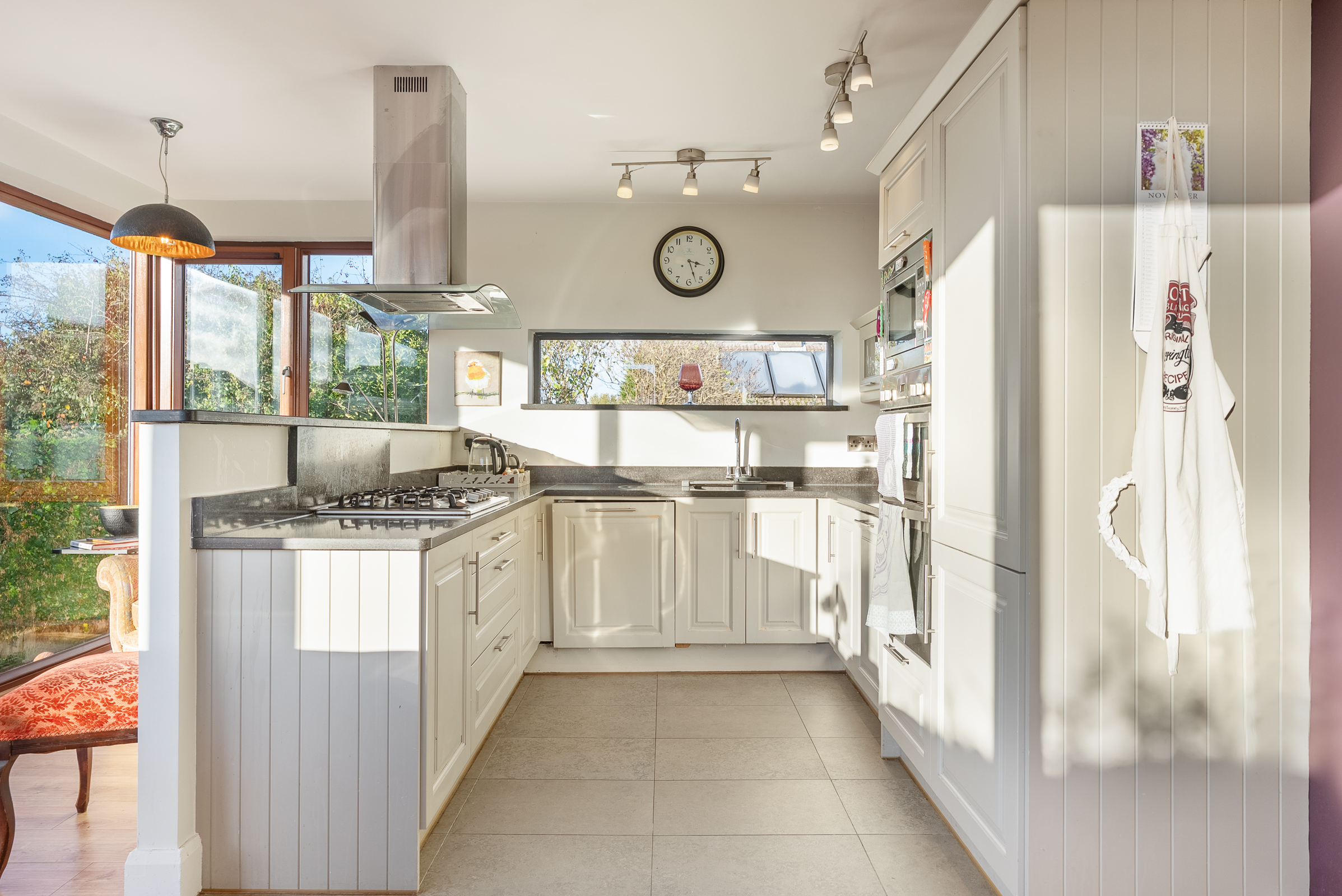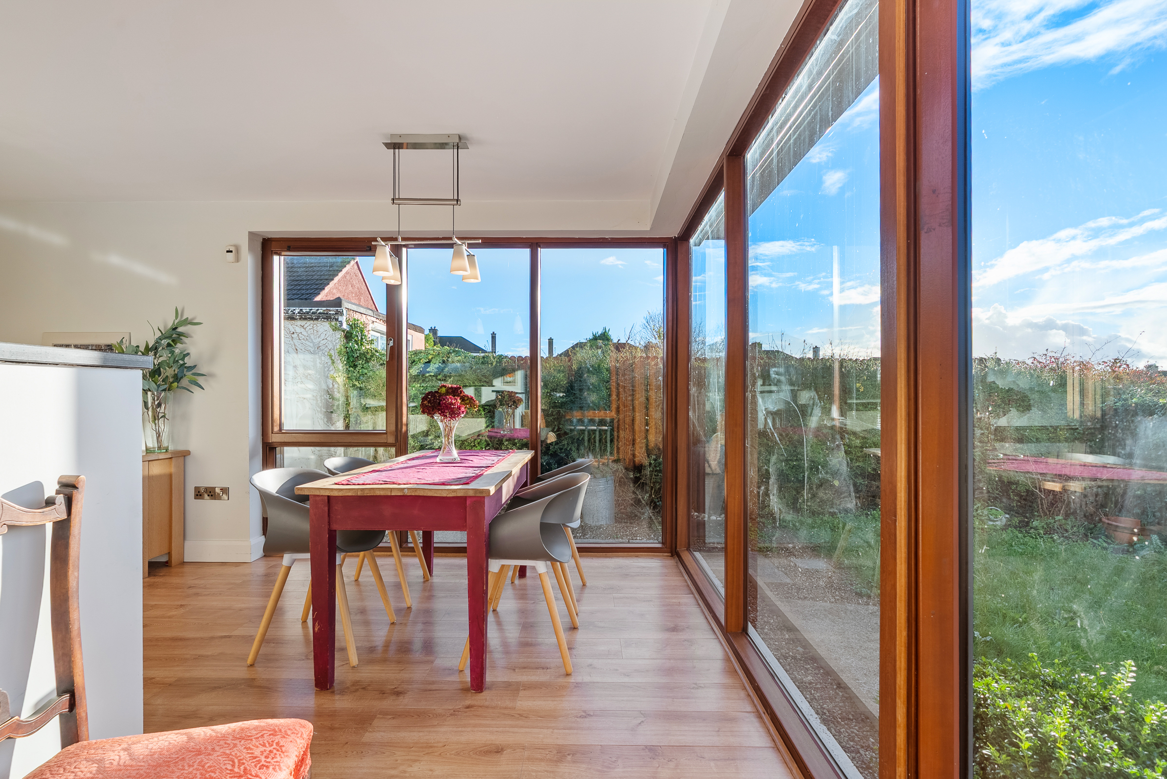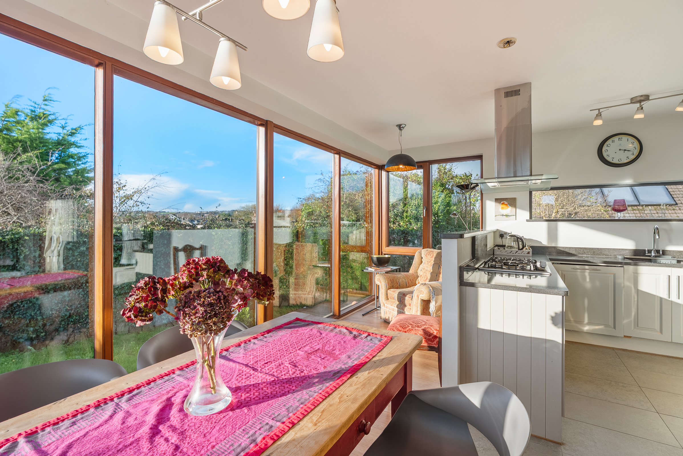 This is a fantastic, extended kitchen/dining space which is awash with natural light throughout. The area is triple aspect with floor to ceiling windows to the left, right, and rear, offering superb views across Cork city.