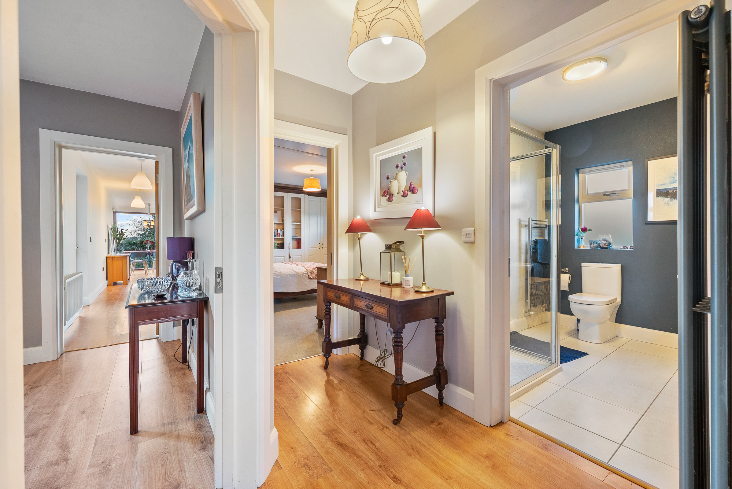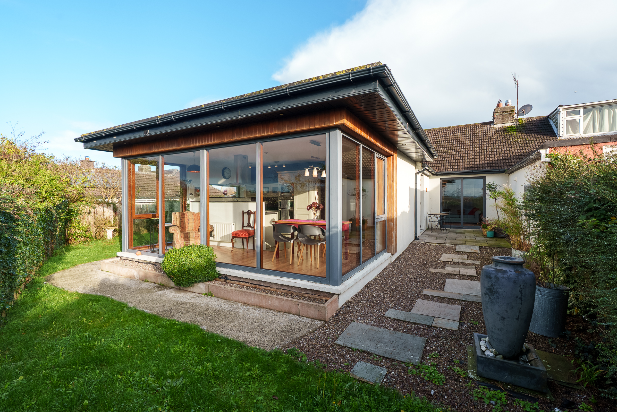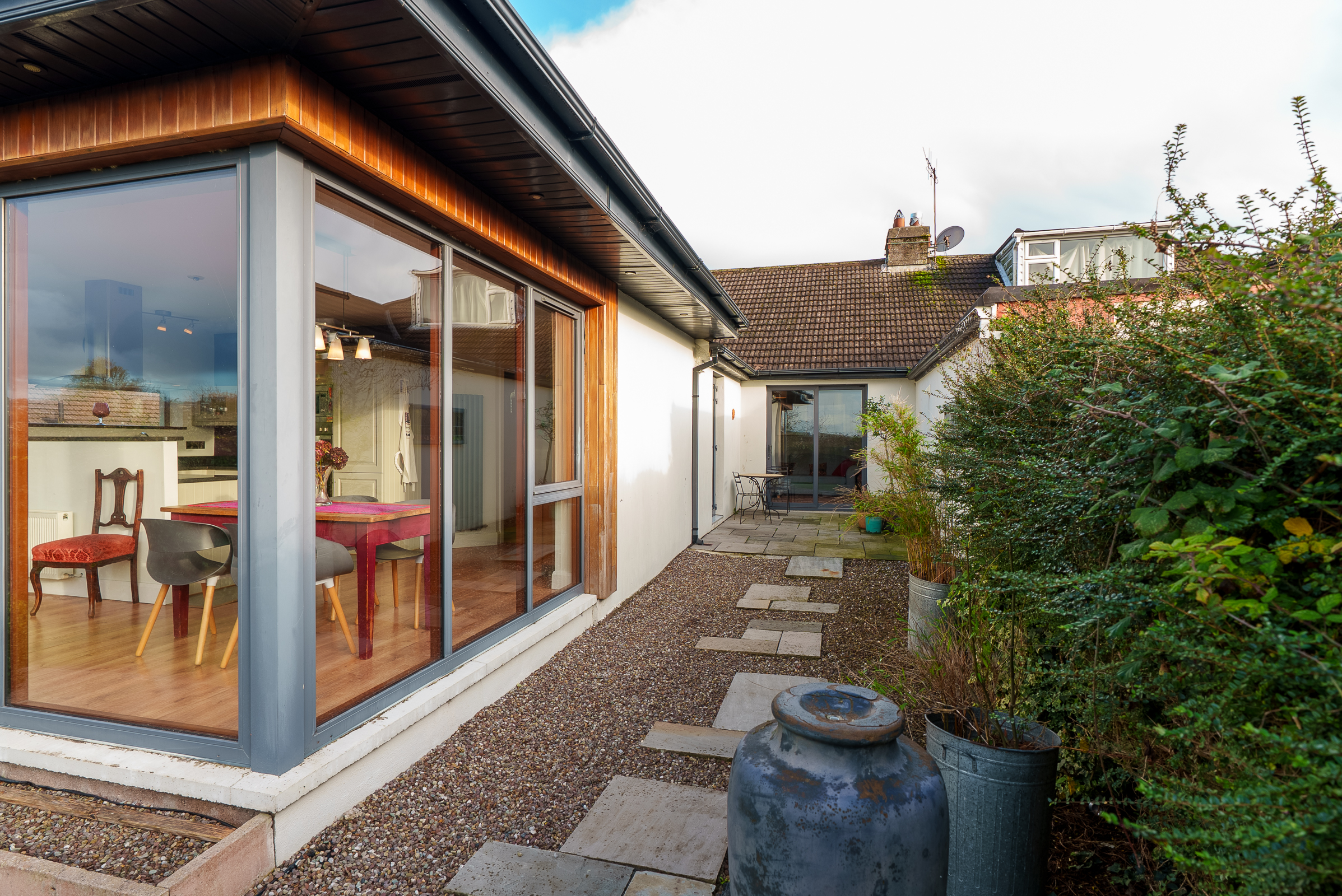 This is a fantastic, extended kitchen/dining space which is awash with natural light throughout. The area is triple aspect with floor to ceiling windows to the left, right, and rear, offering superb views across Cork city.