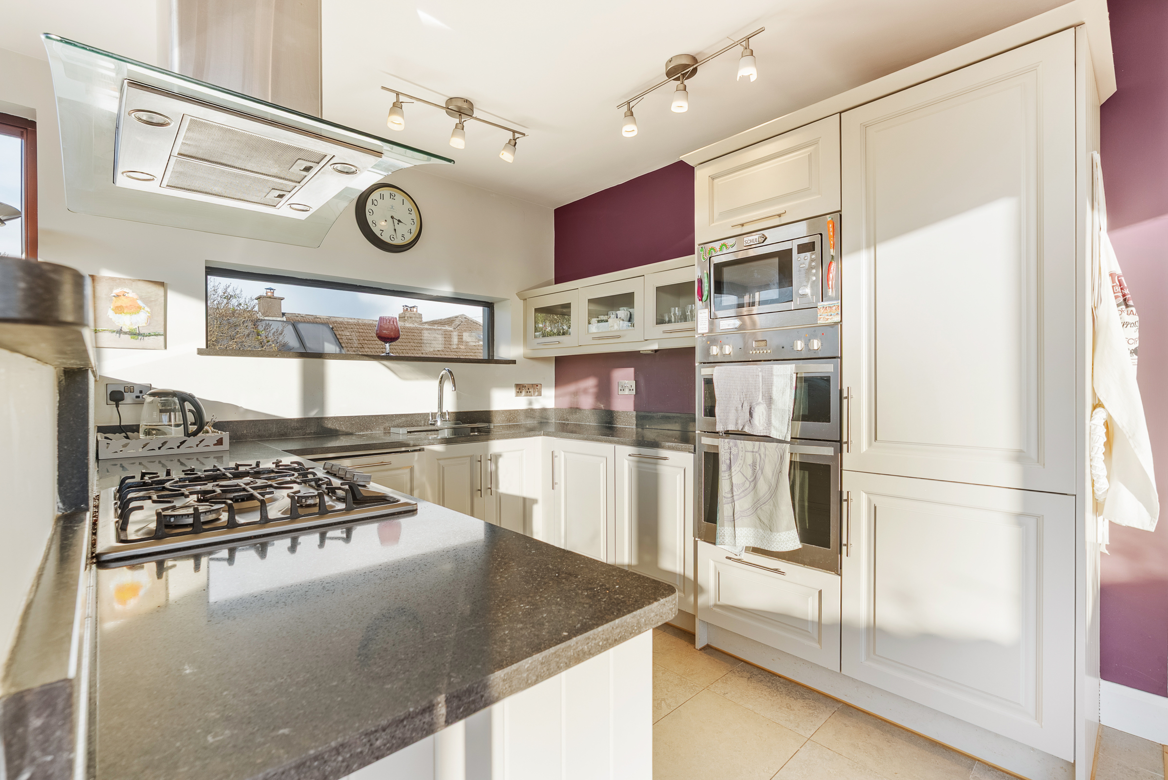 The kitchen features modern fitted units at eye and floor level in a U-shape with granite worktop counter and tile splashback. The kitchen includes a double oven, five ring hob, extractor fan, microwave, dishwasher, stainless steel sink, and an integrated fridge freezer. The area has tile flooring, one feature centre light piece, and ample power points.