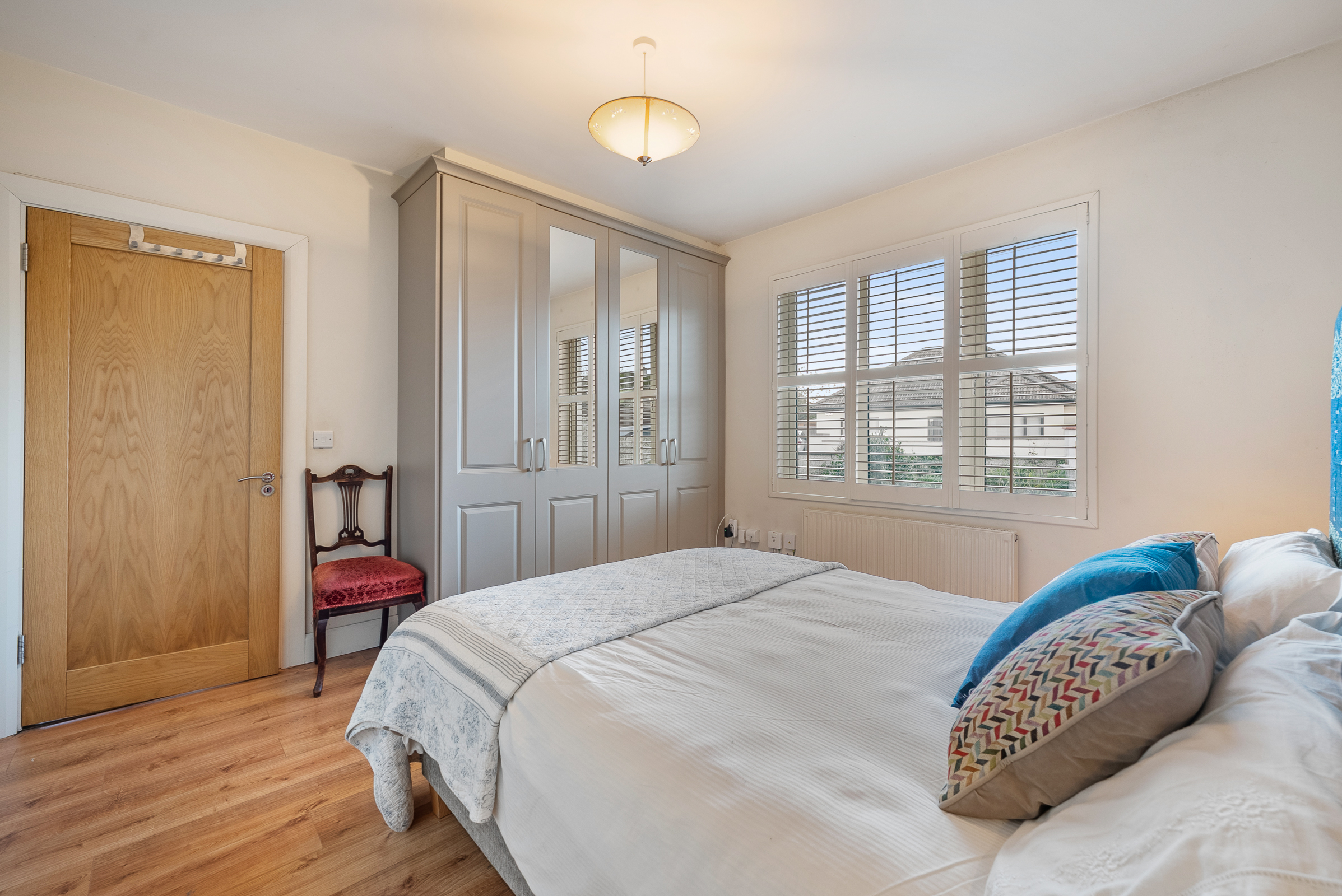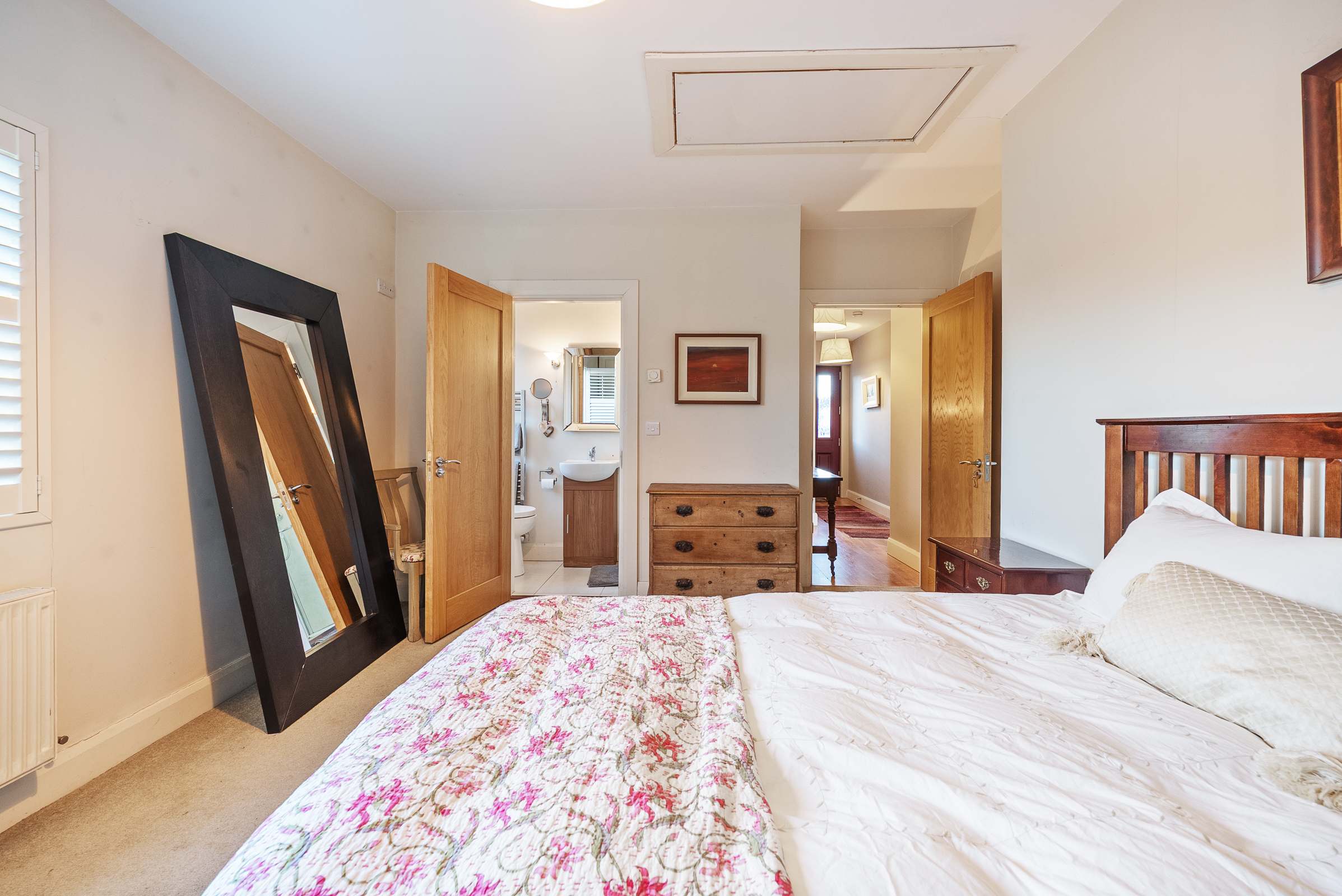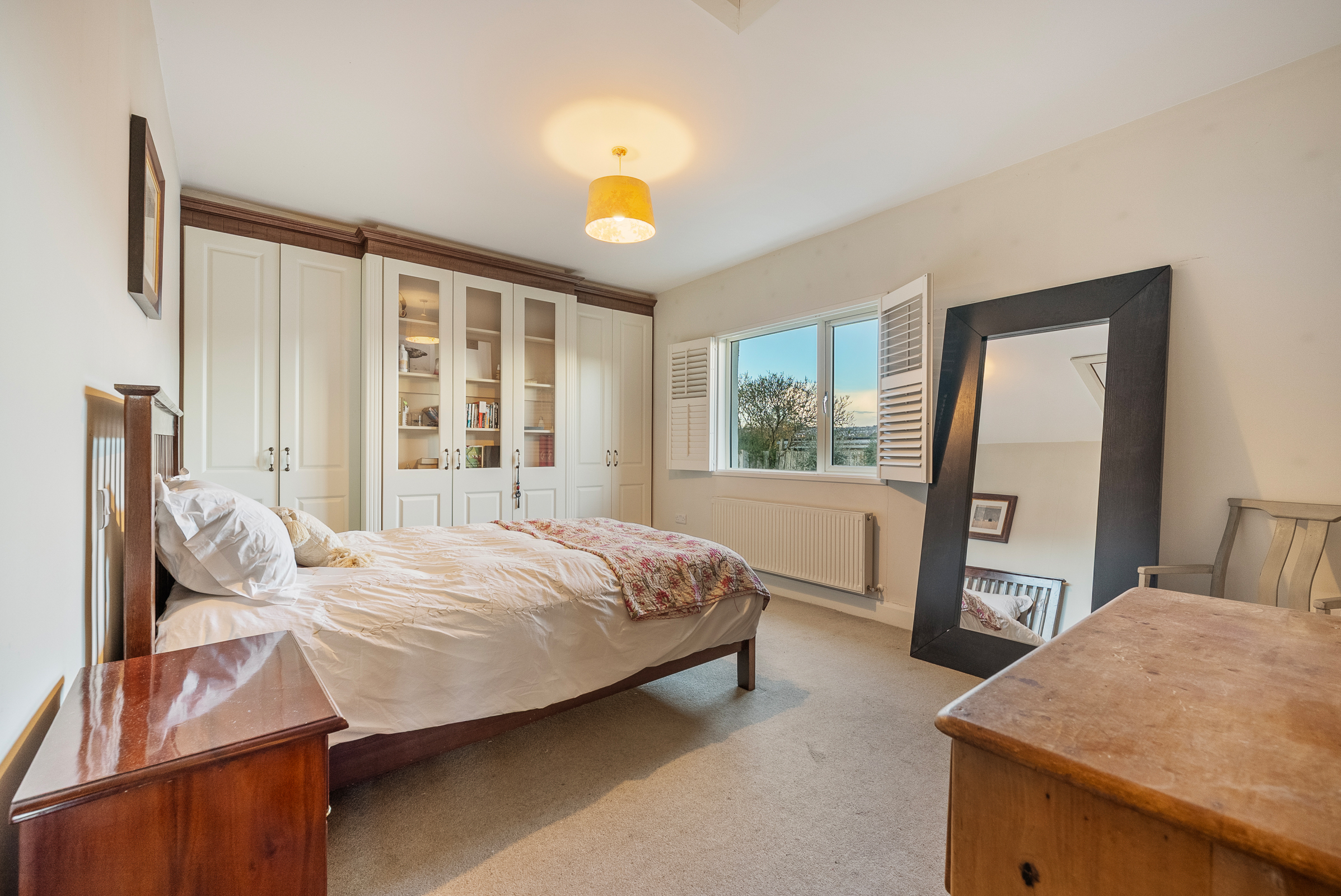 This large double bedroom has one window to the side of the property with plantation shutters, carpet flooring, an extensive array of built-in units from floor to ceiling, one centre light piece, one radiator, neutral décor, and an access hatch to the attic. A door allows access to the en suite bathroom.