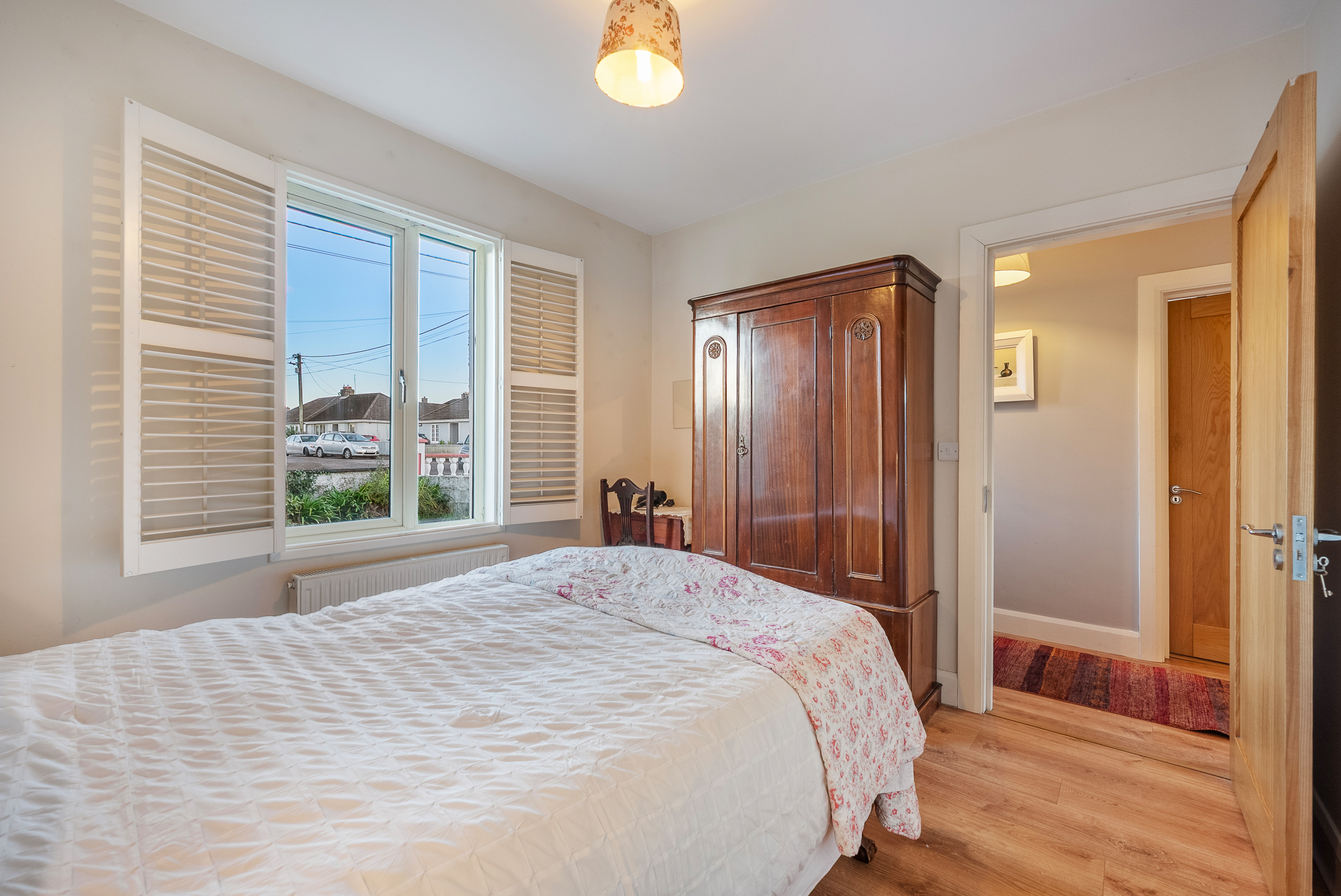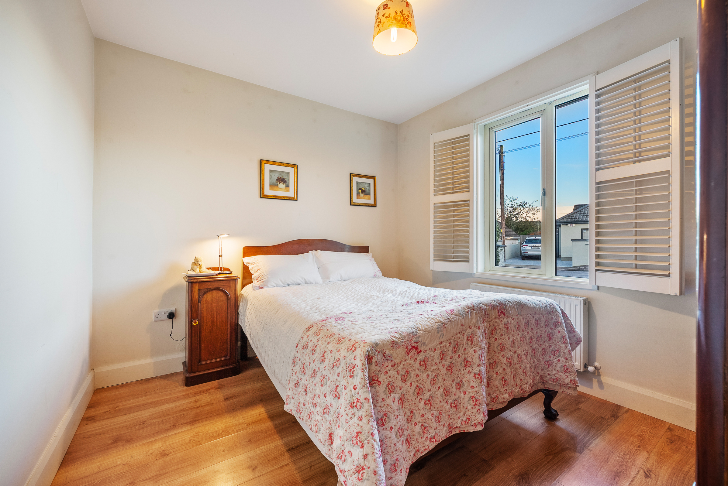 Another spacious double bedroom has one window to the front of the property with plantation shutters, laminate timber flooring, built-in wardrobe, one centre light piece, one radiator, neutral décor, and eight power points.