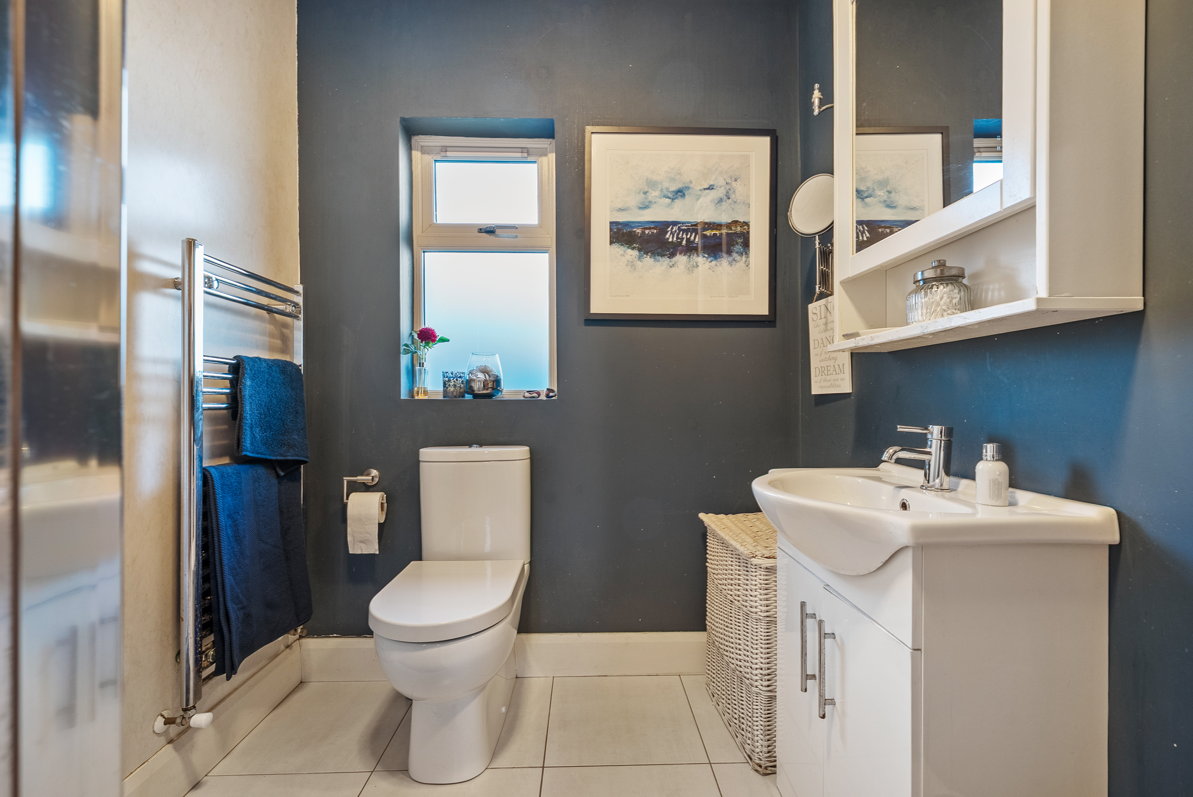 The main family bathroom features a three piece suite including a large corner shower area incorporating a pump shower, one frosted window to the side of the property, built-in vanity, a heated towel rail, modern tiling throughout, laminate splashback, and two wall-mounted light pieces.