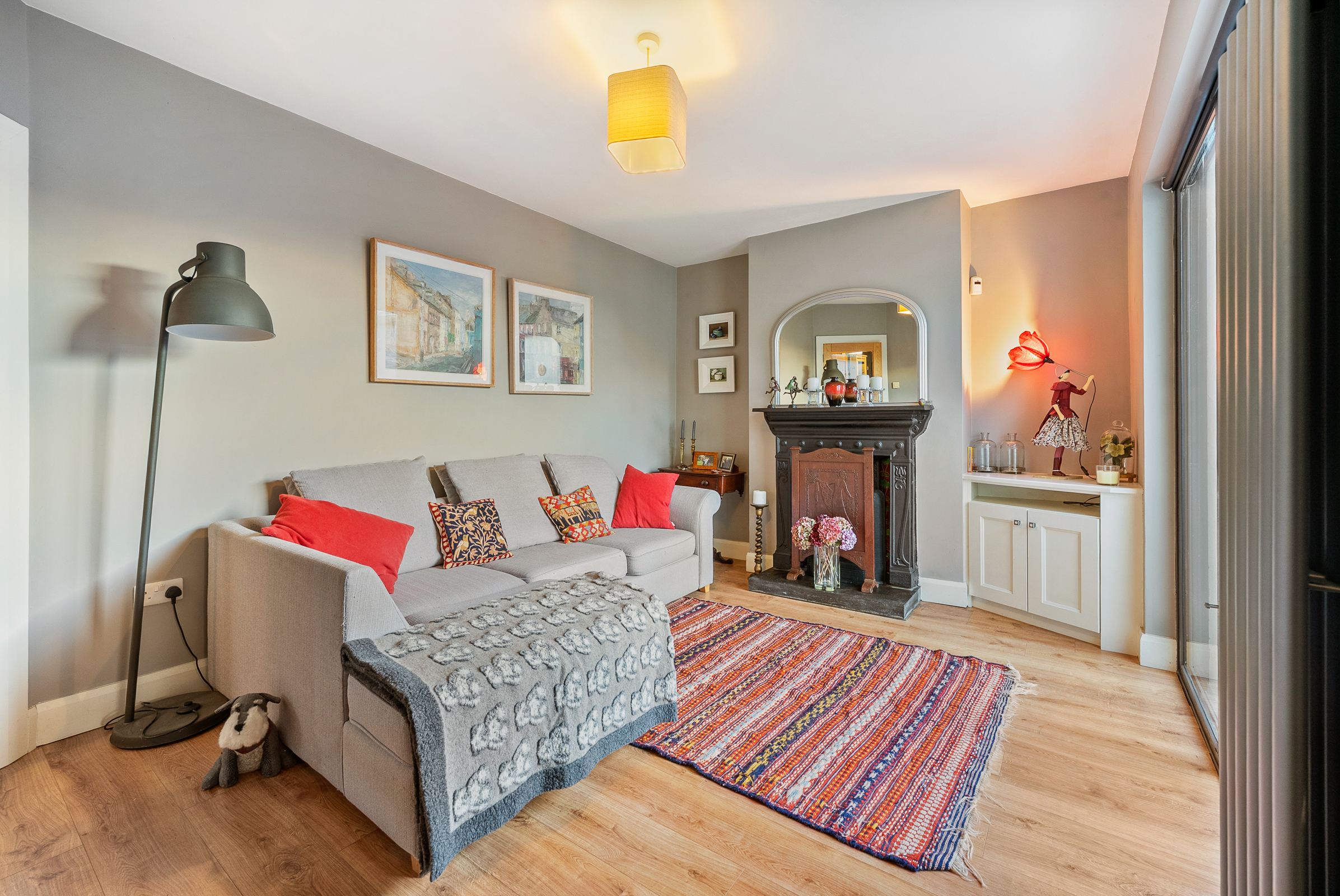 This superb main living room has sliding glass doors allowing access to the west facing rear garden and patio, flooding the area with extensive natural light. The area has high quality laminate timber flooring, attractive neutral décor, one centre light piece, a feature open fireplace, one radiator, and ample power points.