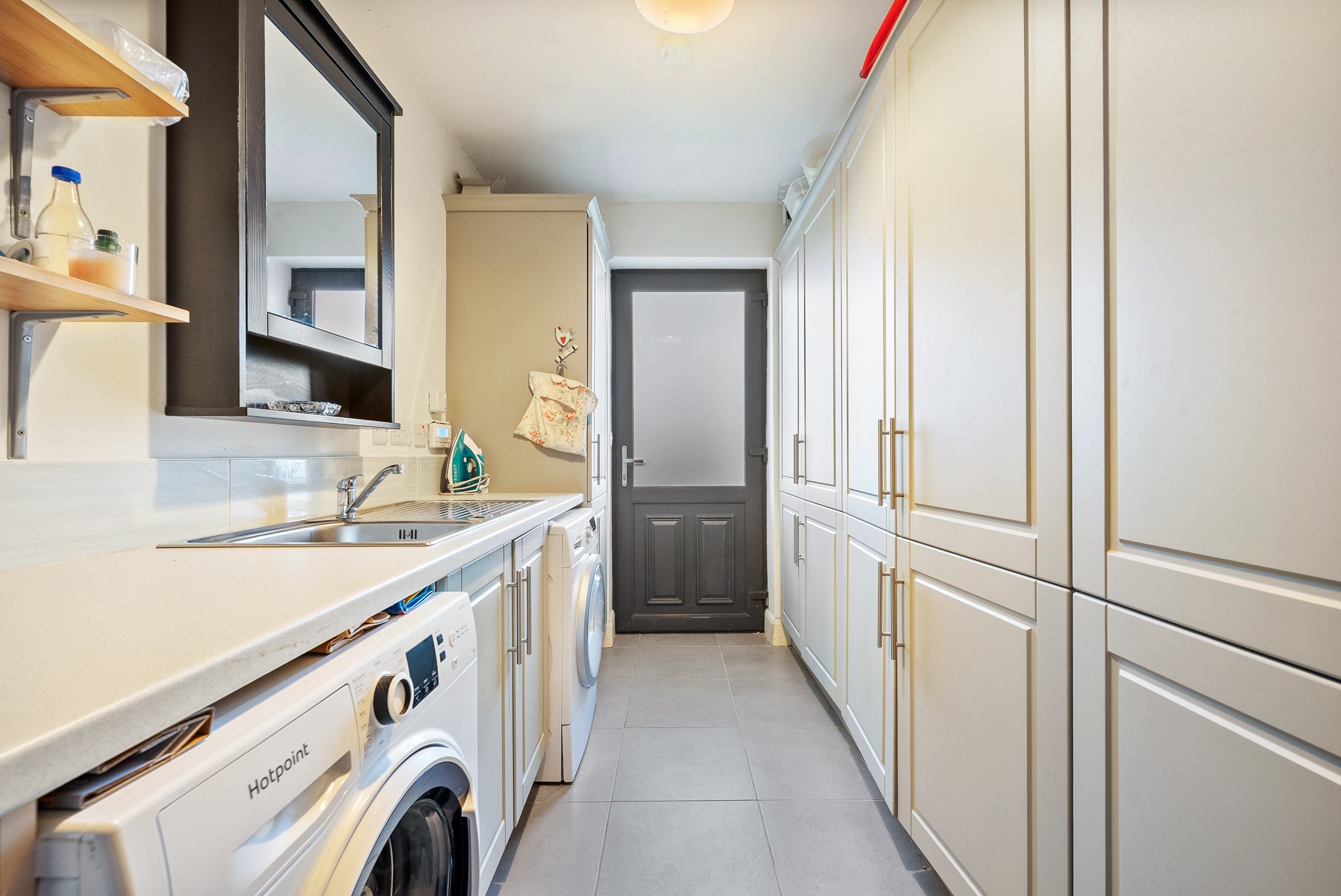 The utility room has tile flooring, a PVC door allowing access to the side of the property, ample storage space, worktop counter, neutral décor, plumbing for a washing machine, space for a dryer, a stainless steel sink, one centre light piece, and one radiator. The gas boiler and water tank are housed within the utility room.