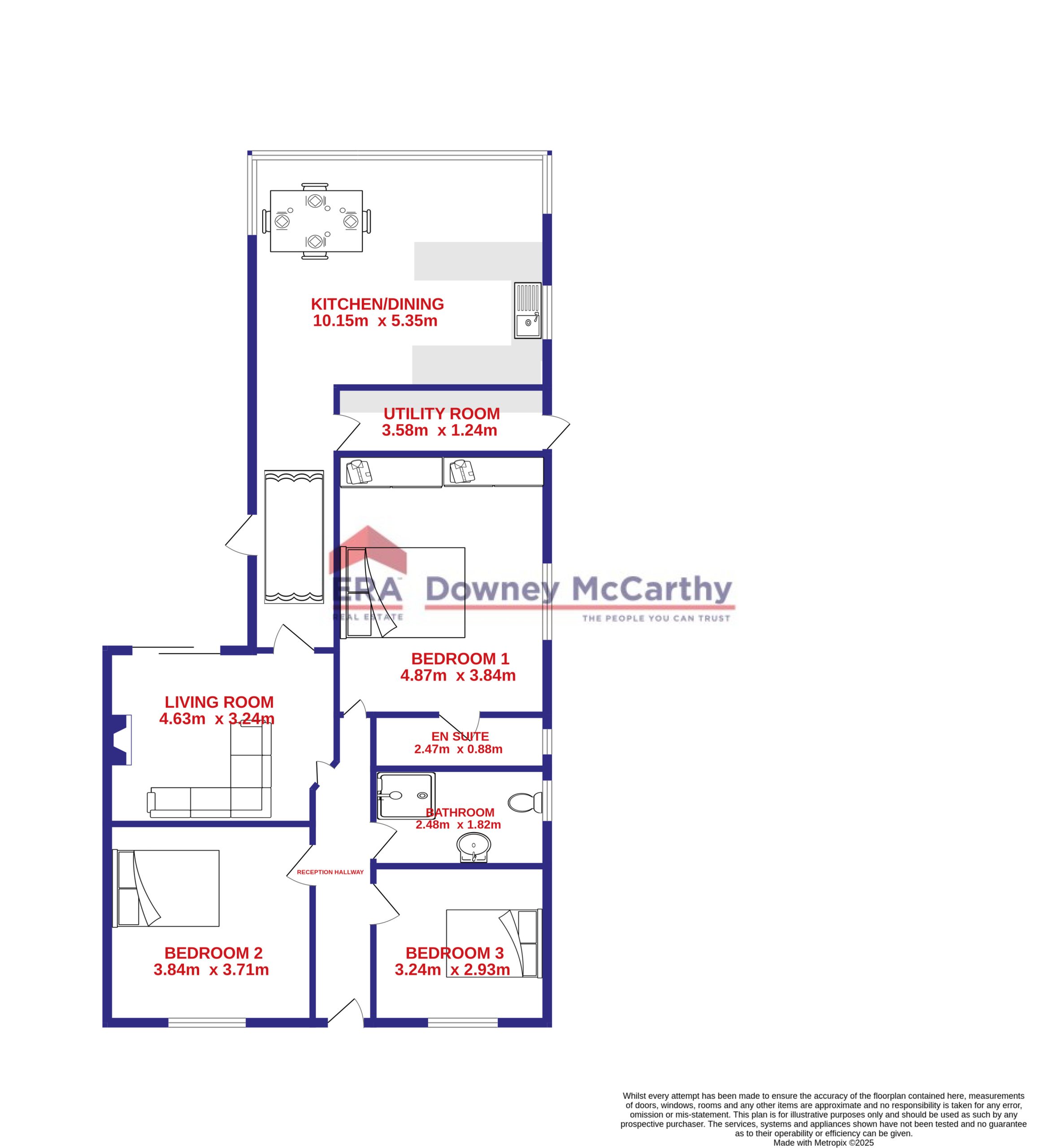 Accommodation consists of reception hallway, living room, extended kitchen/dining area, utility room, three spacious bedrooms, an en suite bathroom, and the main family bathroom.