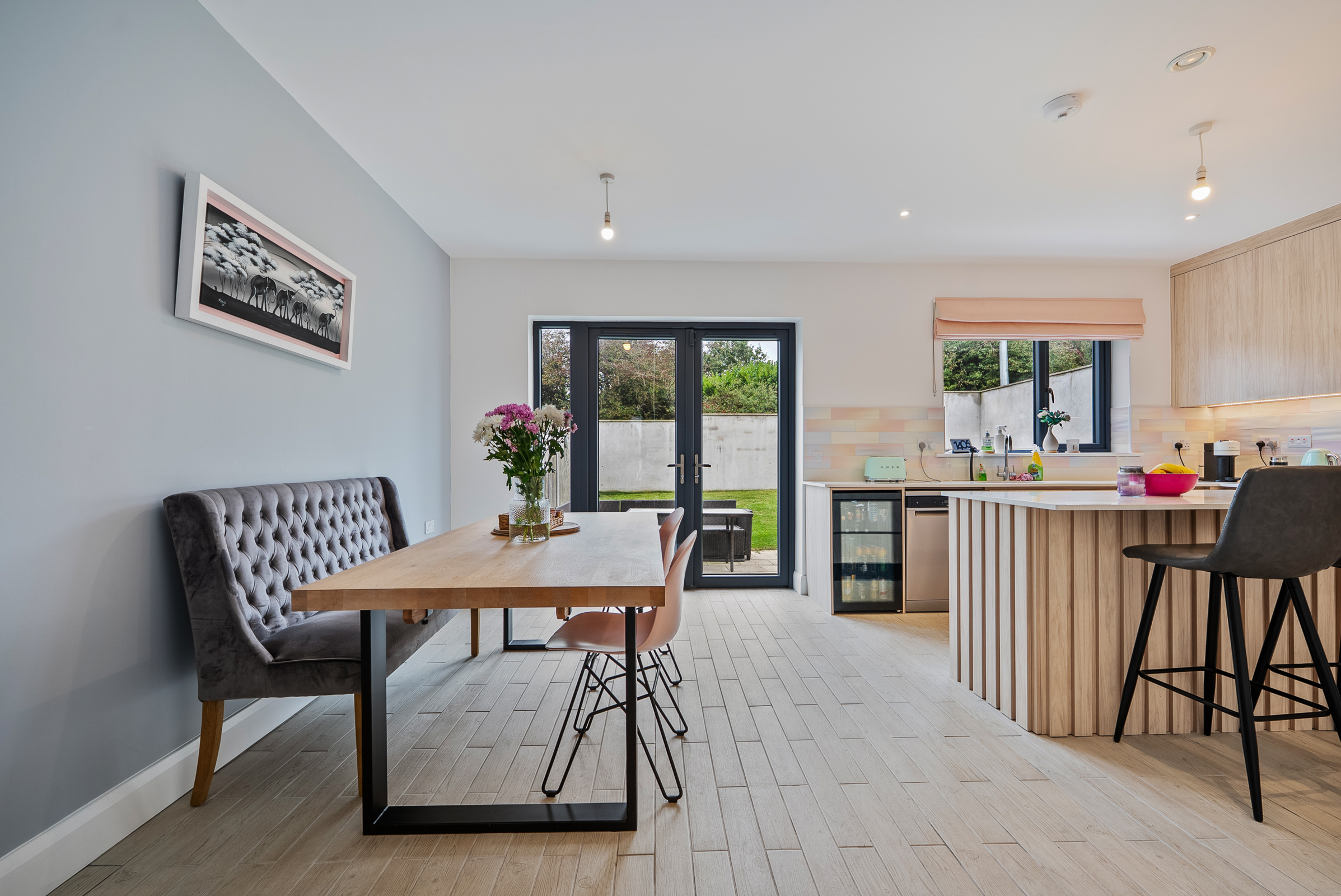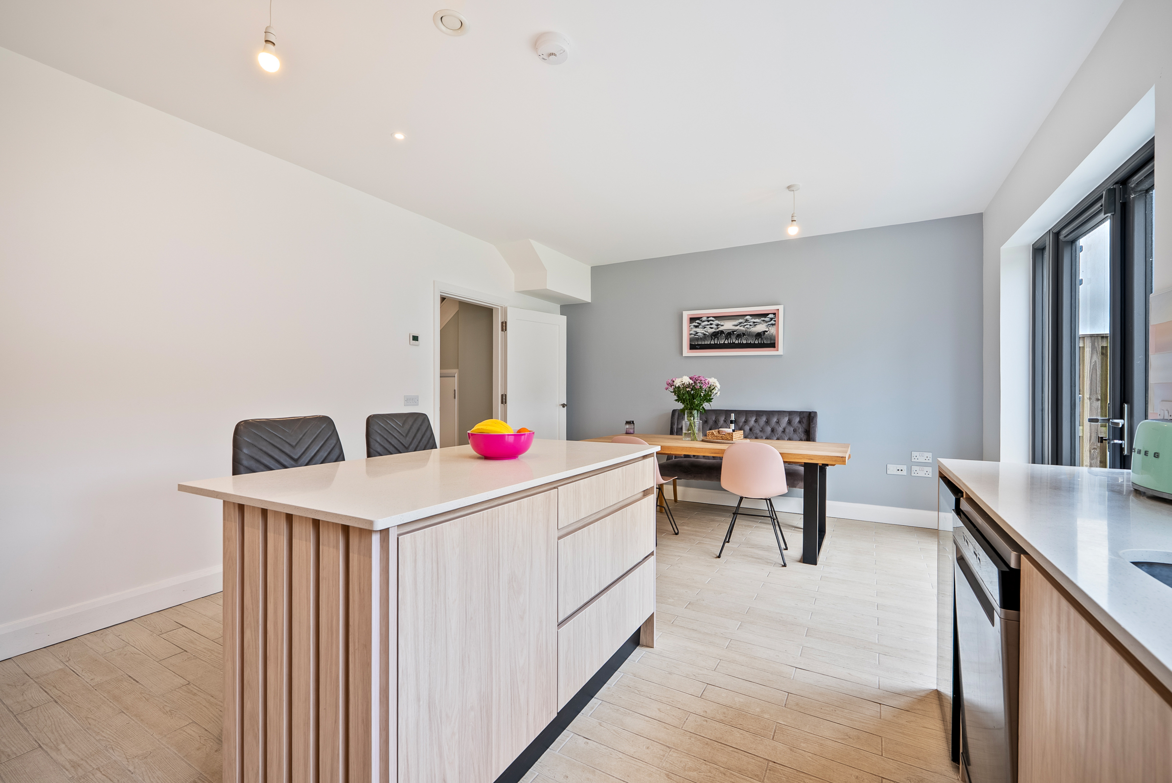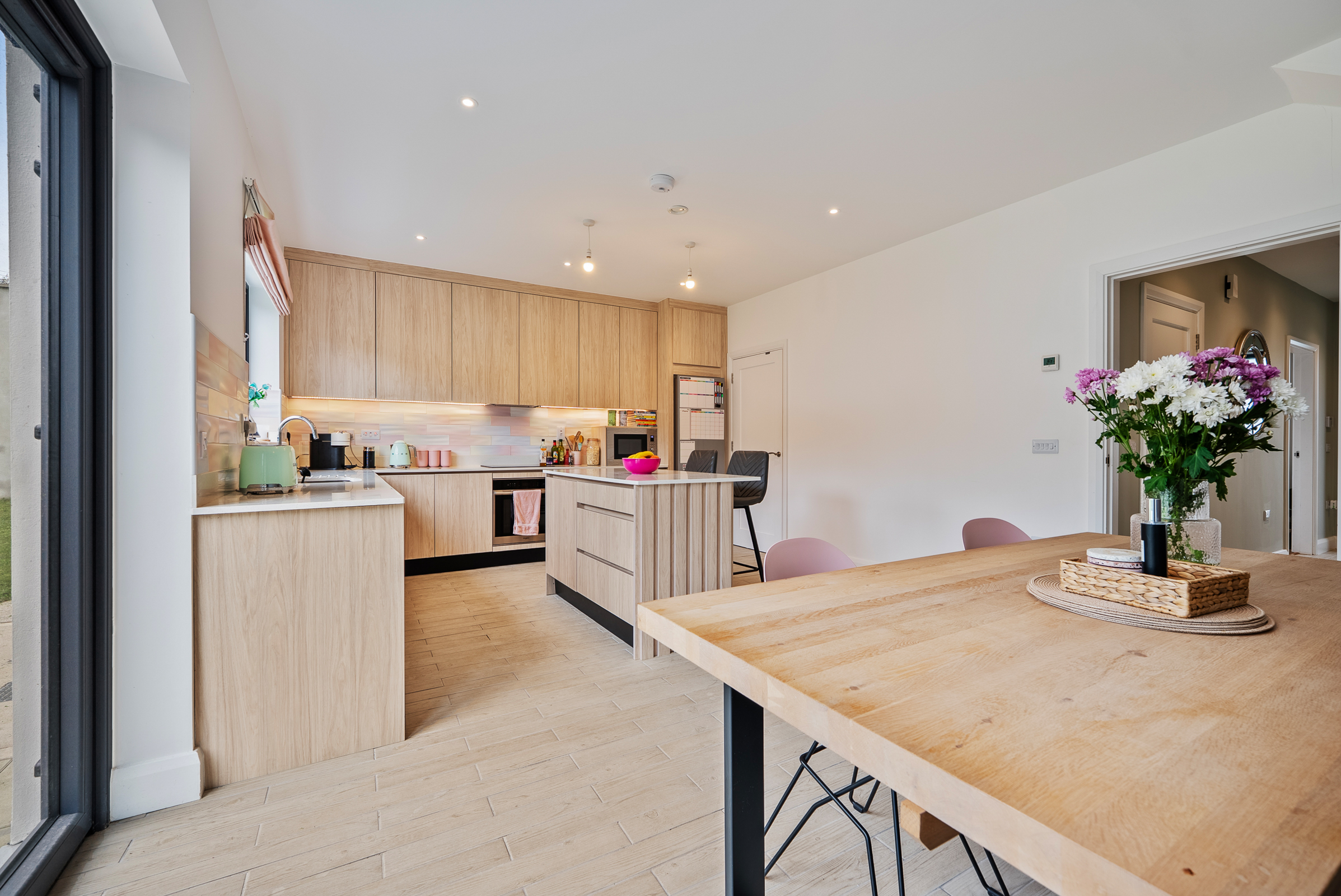 A beautifully presented and modern kitchen/dining area features high quality tile flooring, one window to the side of the property, two pendant light pieces, and recessed spot lighting throughout. The kitchen features attractive fitted handless units at eye and floor level to include soft self-closing mechanisms, extensive worktop counter, and tile splashback. There is a feature island unit and under counter lighting. There is an integrated oven/hob/extractor fan, space for a dishwasher, space for a fridge freezer, and space for a wine fridge. Glass double doors allow access to the south facing rear garden and patio area.