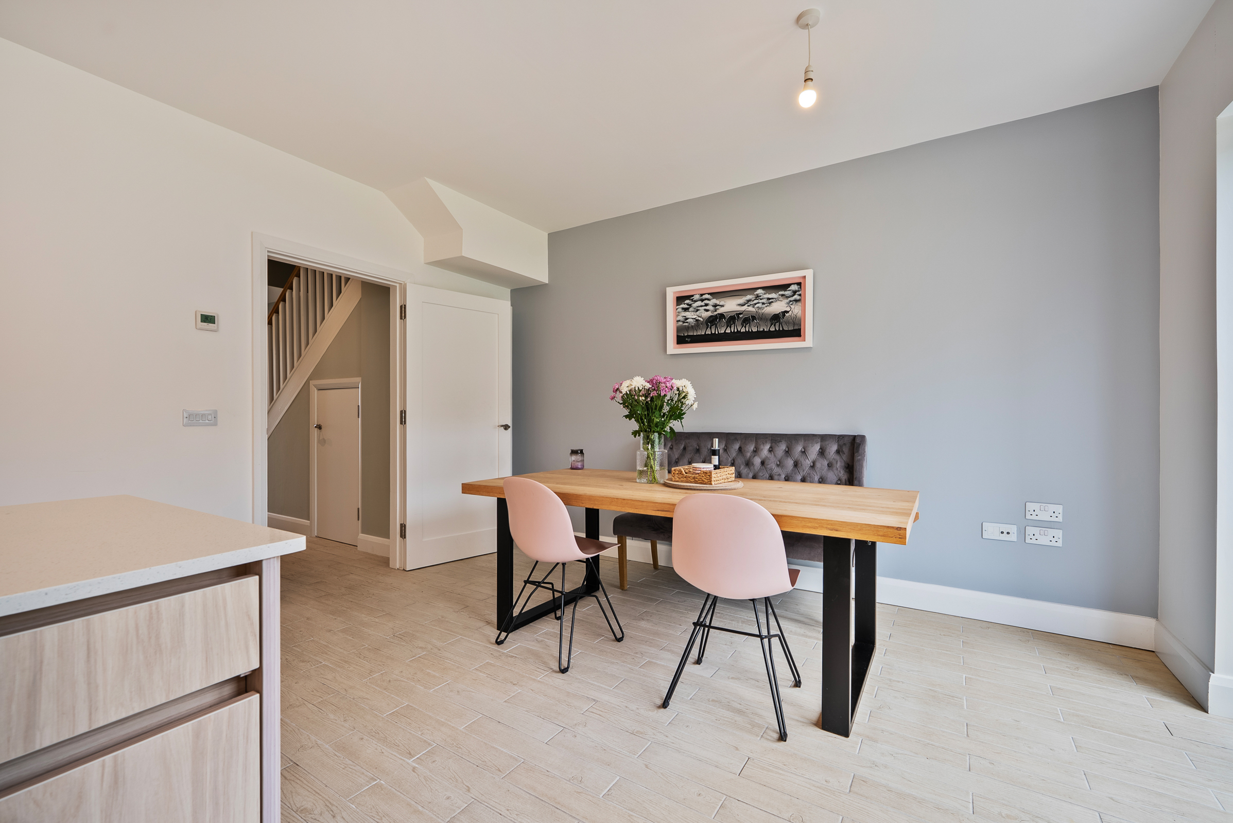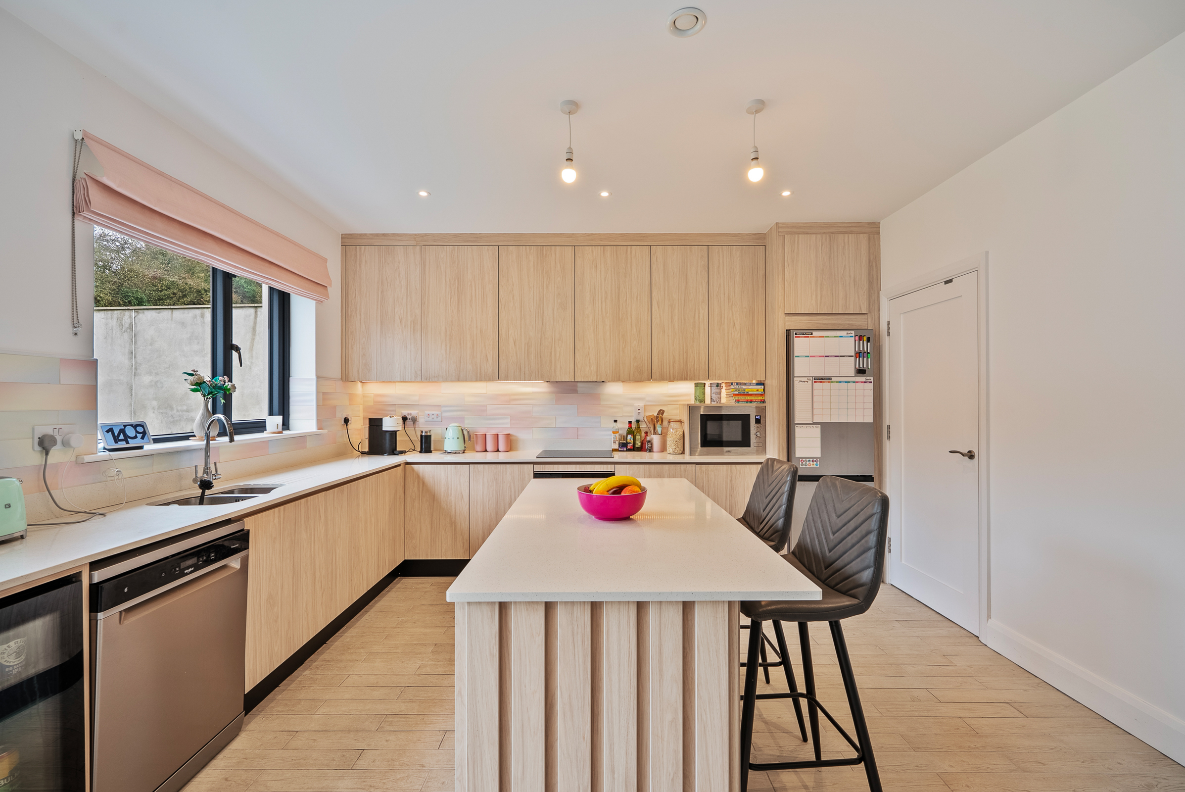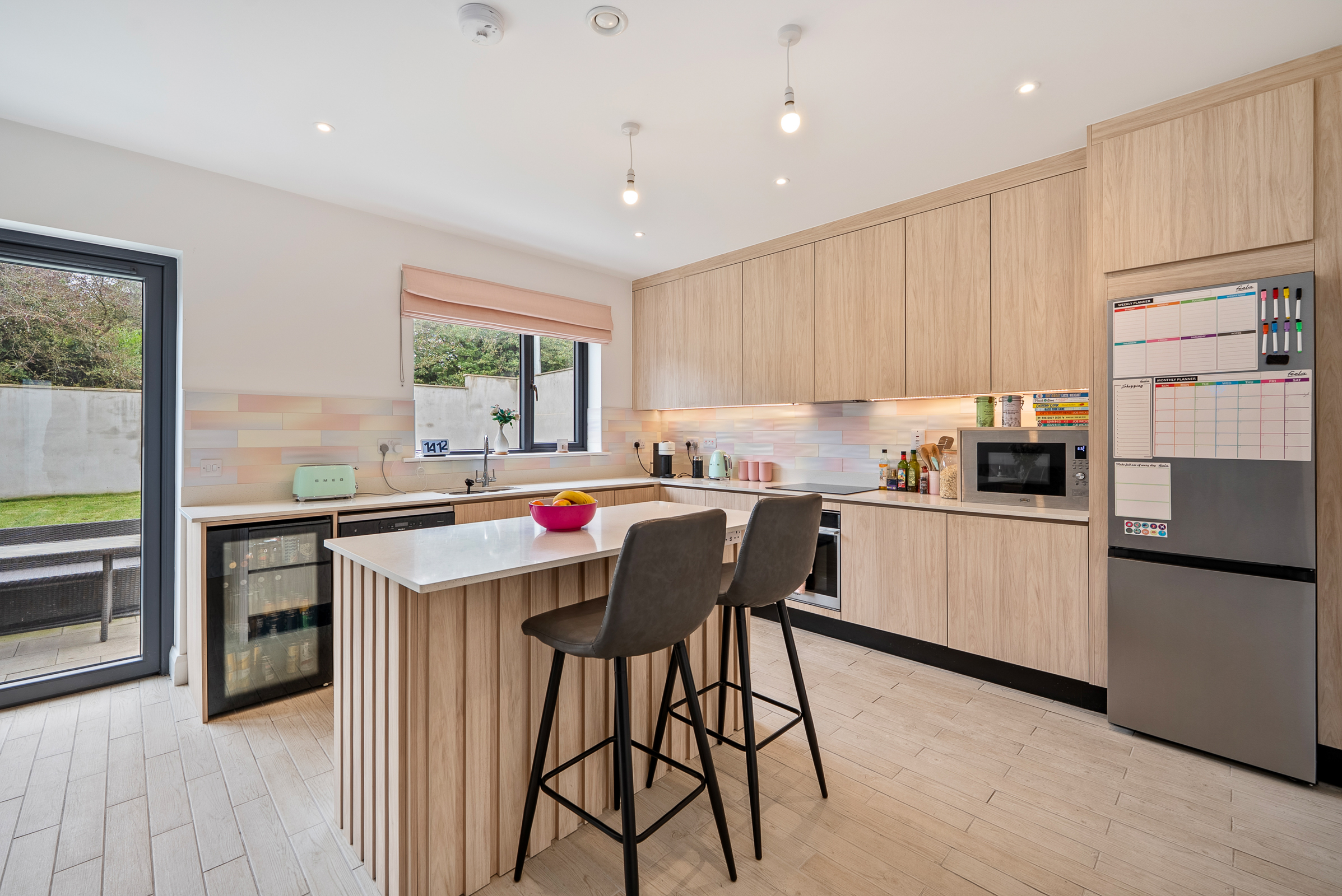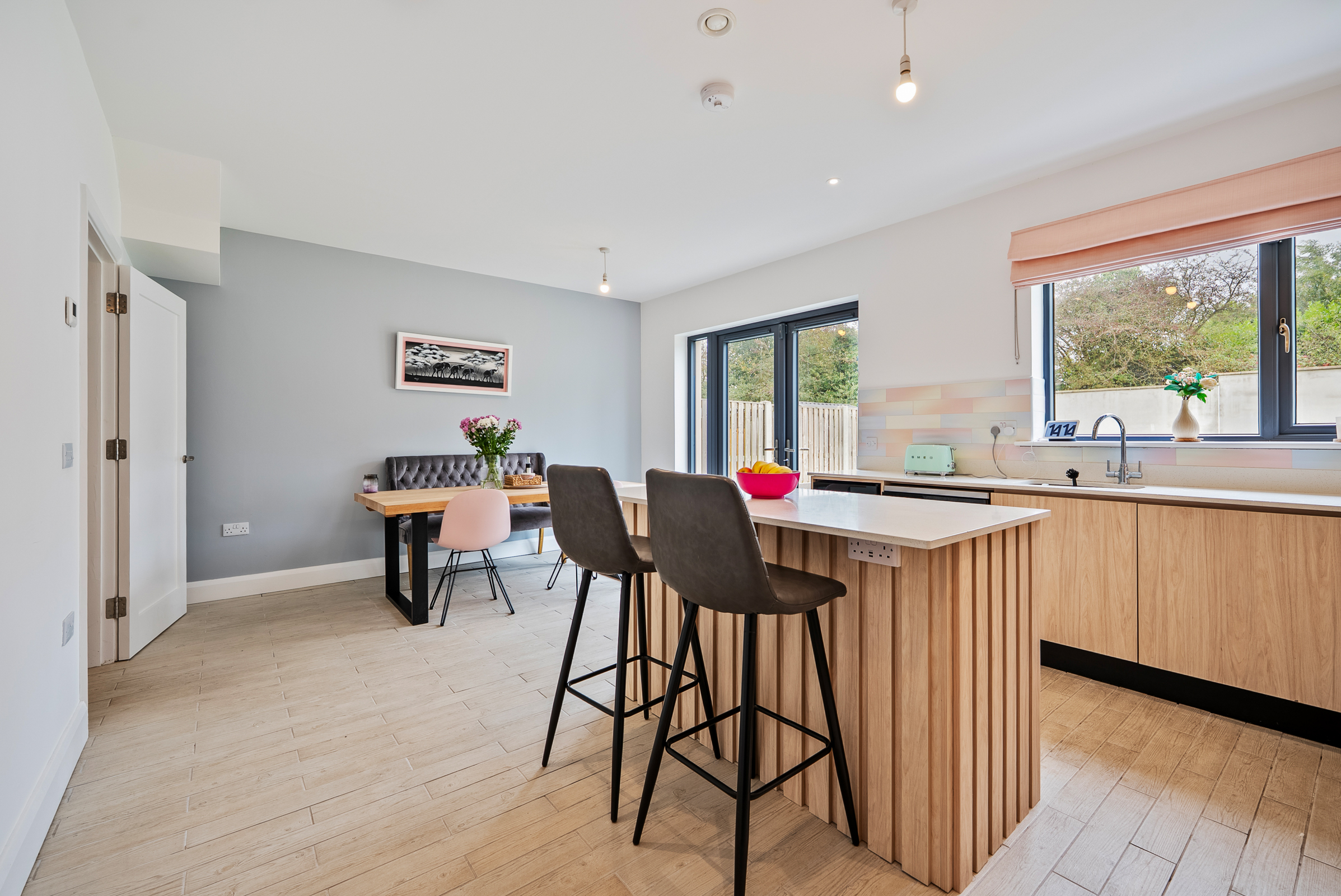 A beautifully presented and modern kitchen/dining area features high quality tile flooring, one window to the side of the property, two pendant light pieces, and recessed spot lighting throughout. The kitchen features attractive fitted handless units at eye and floor level to include soft self-closing mechanisms, extensive worktop counter, and tile splashback. There is a feature island unit and under counter lighting. There is an integrated oven/hob/extractor fan, space for a dishwasher, space for a fridge freezer, and space for a wine fridge. Glass double doors allow access to the south facing rear garden and patio area.