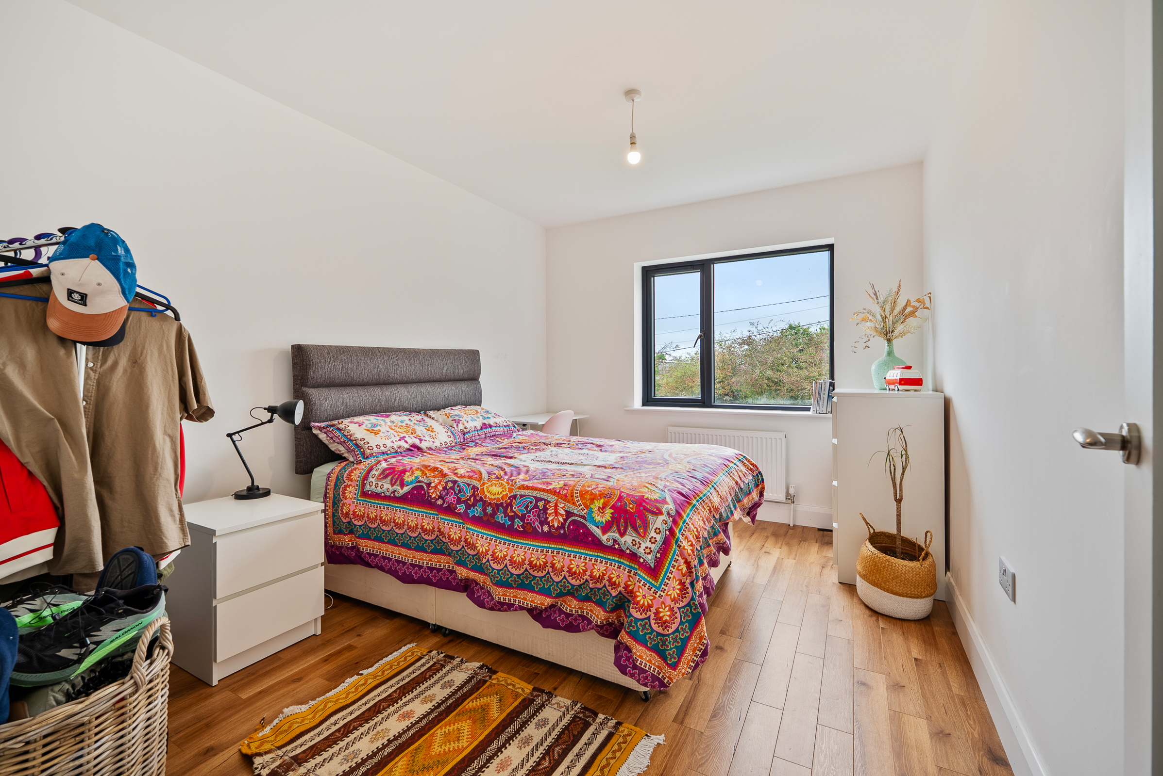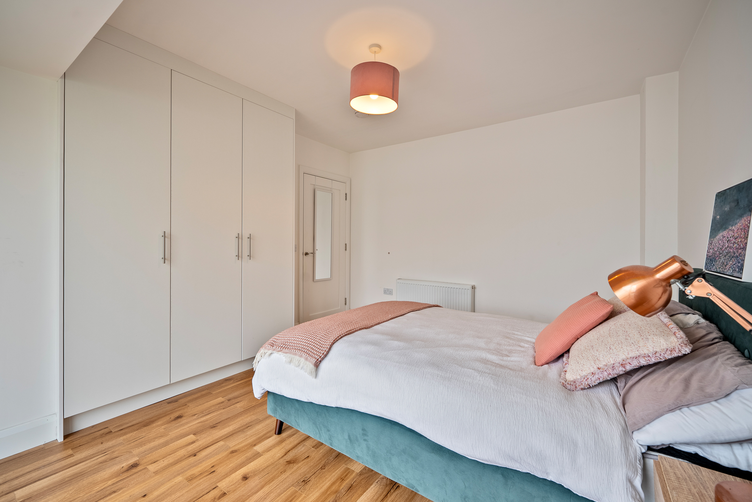 This large double bedroom features one feature bay window to the front of the property, high quality laminate timber flooring, attractive neutral décor, built-in wardrobe units for storage, one radiator, one centre light piece, and ample power points.