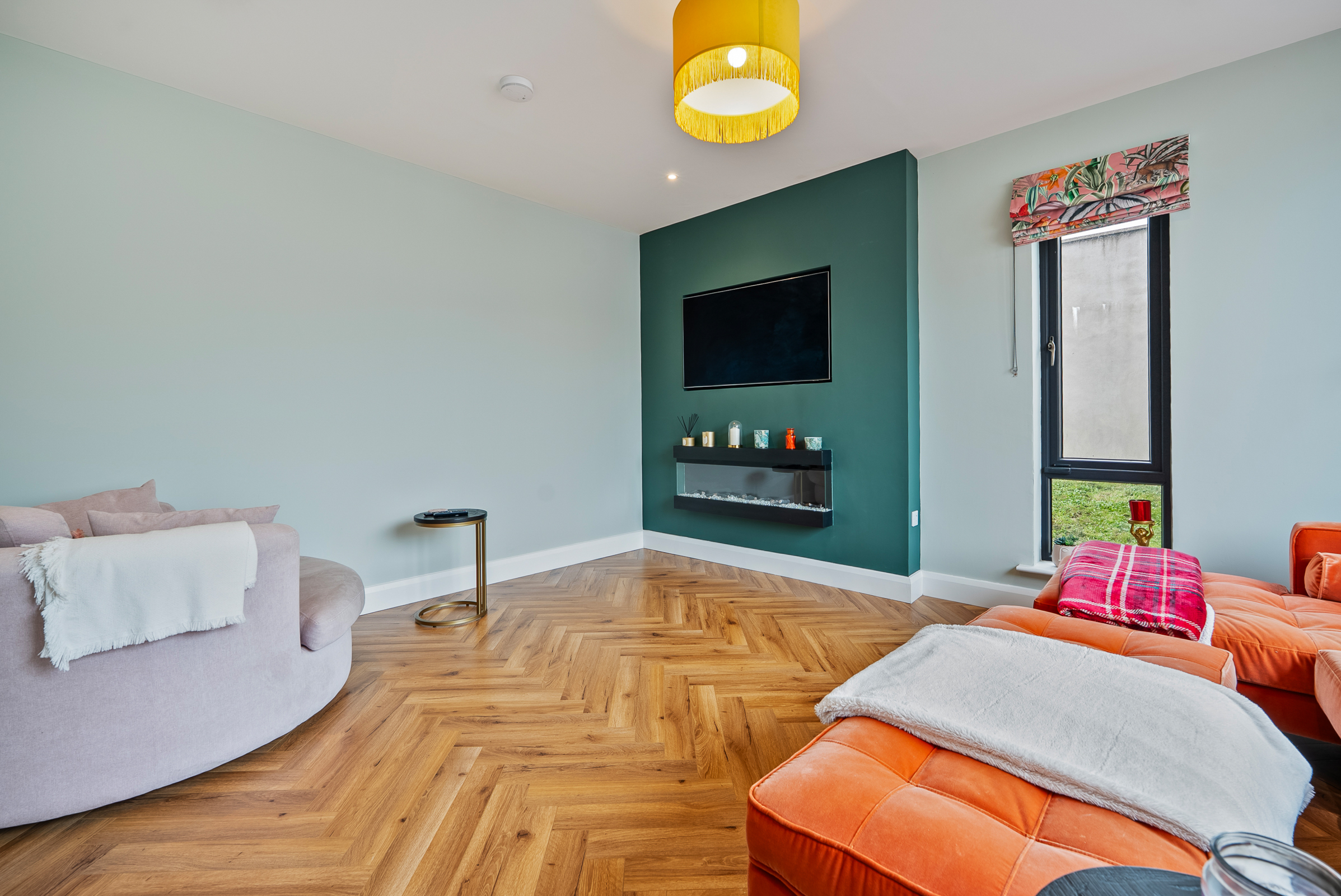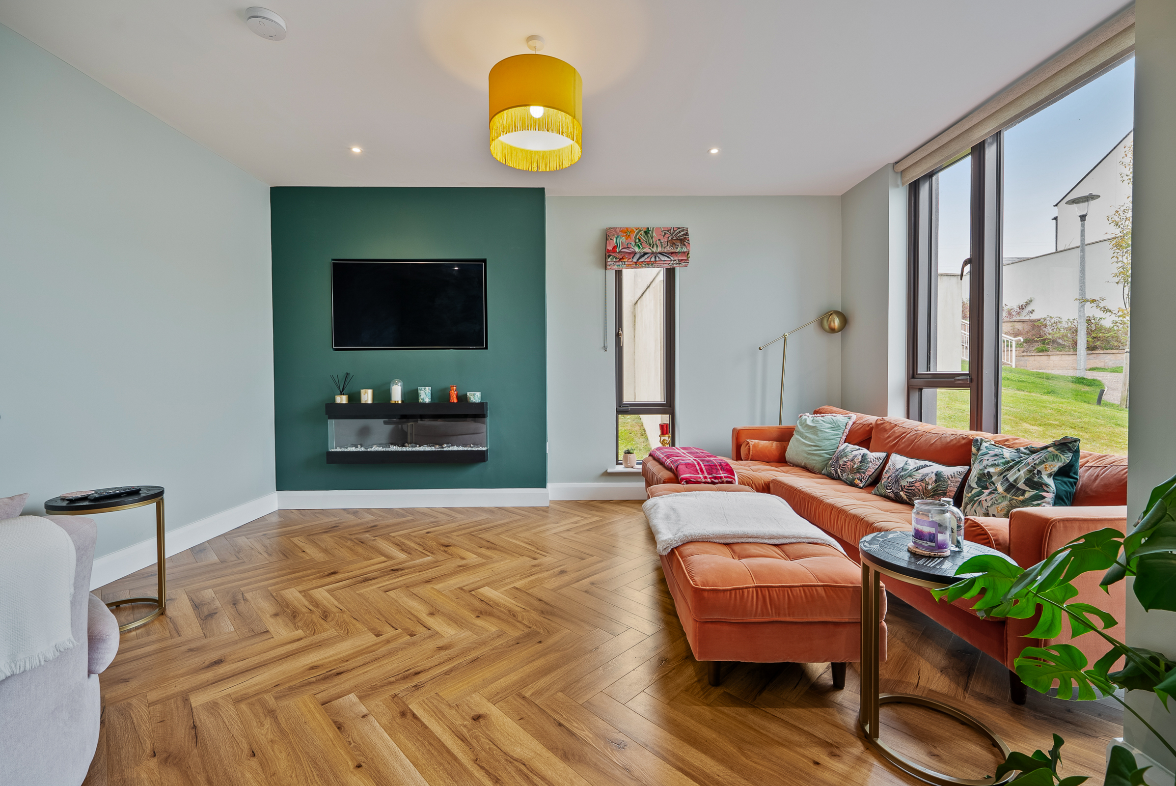 A superb main living room is dual aspect with one large floor to ceiling bay window overlooking the front of the property and one window to the side, allowing extensive natural light to flood the room. The area has high quality laminate timber flooring, attractive colour palette, a feature media wall with space for a mounted TV and modern inset electric fireplace, recessed spot lighting, one centre light piece, one radiator, and ample power points.