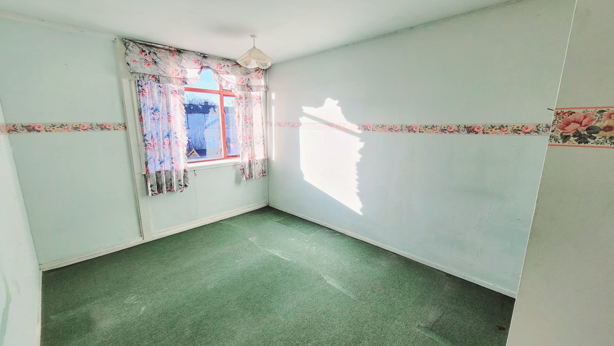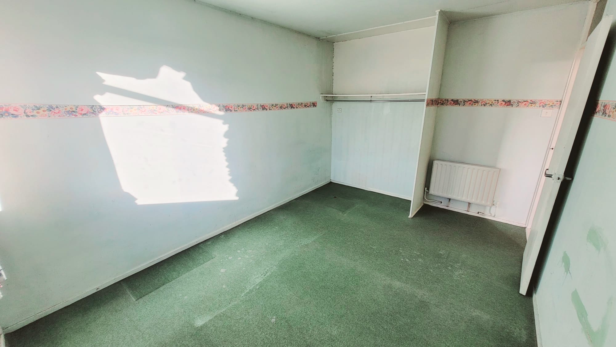 A spacious double bedroom has one window to the rear of the property, including a curtain rail. The room has carpet flooring, one radiator, one centre light piece, two power points, shelving and rails for storage.
