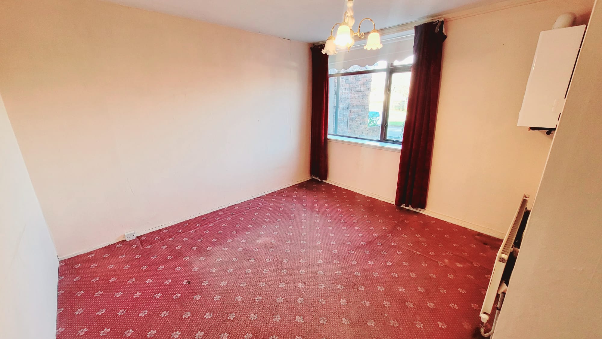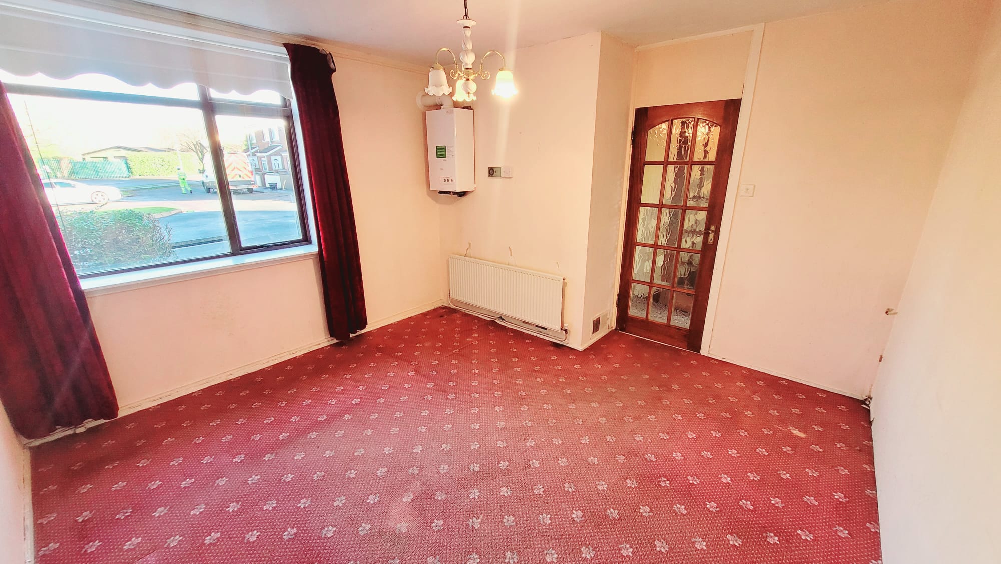 The living room has one large window to the front of the property, including a roller blind, a curtain rail and curtains. The room has carpet flooring, one radiator, one power point, one centre light piece, and access to the gas boiler which is housed within this room.