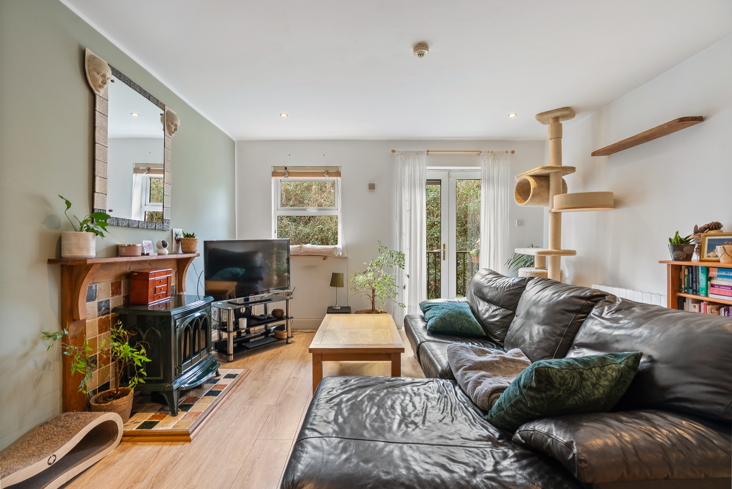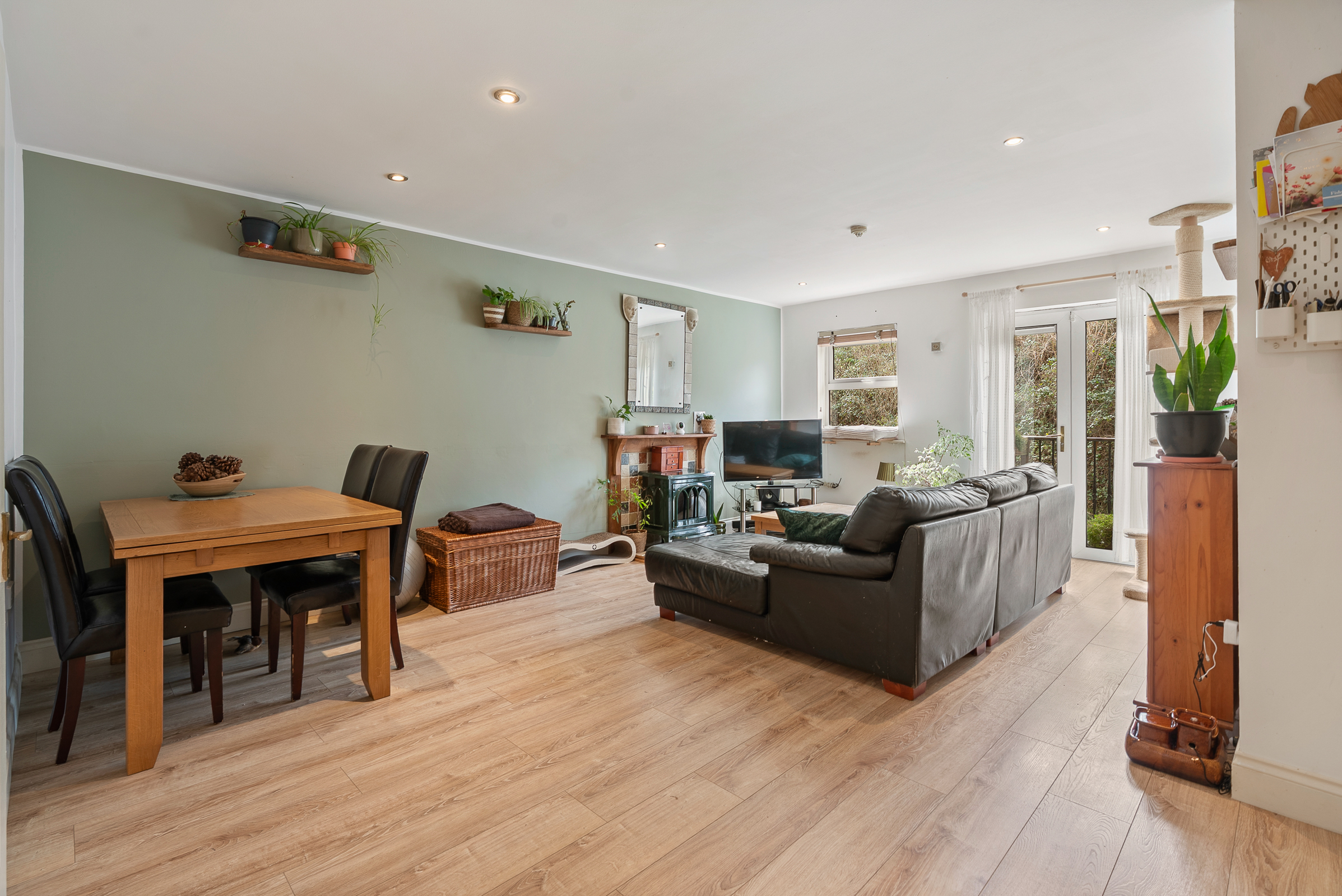 This superb and spacious open plan kitchen/dining/living area has one window to the side of the property, and double doors allow access to a lovely balcony area. There is ample dining and living space, high quality wooden flooring, recessed spot lighting, attractive neutral décor, and a fireplace with feature stone insert.