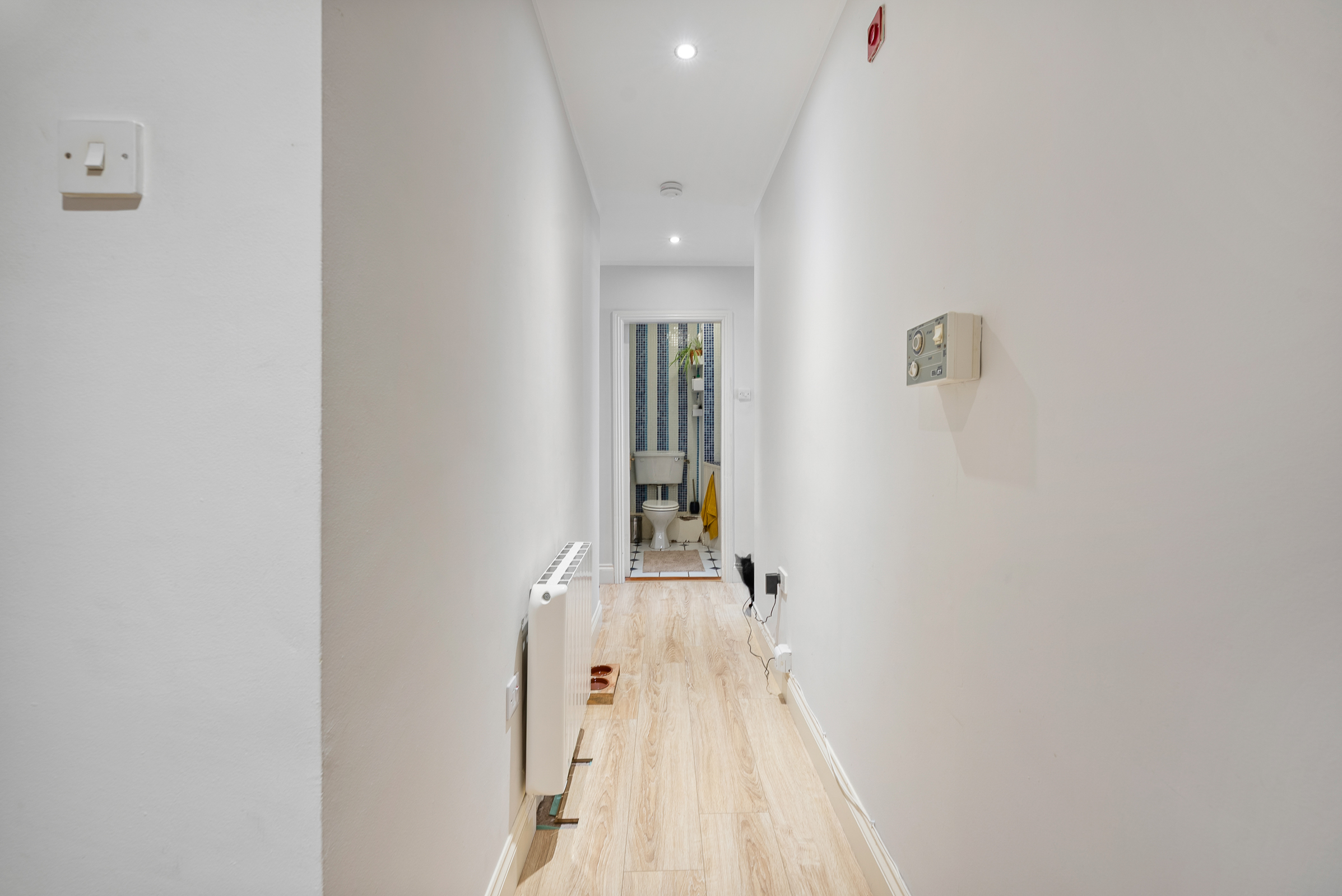The hallway has wooden flooring, access to the hot press, recessed spot lighting, and one electric radiator.