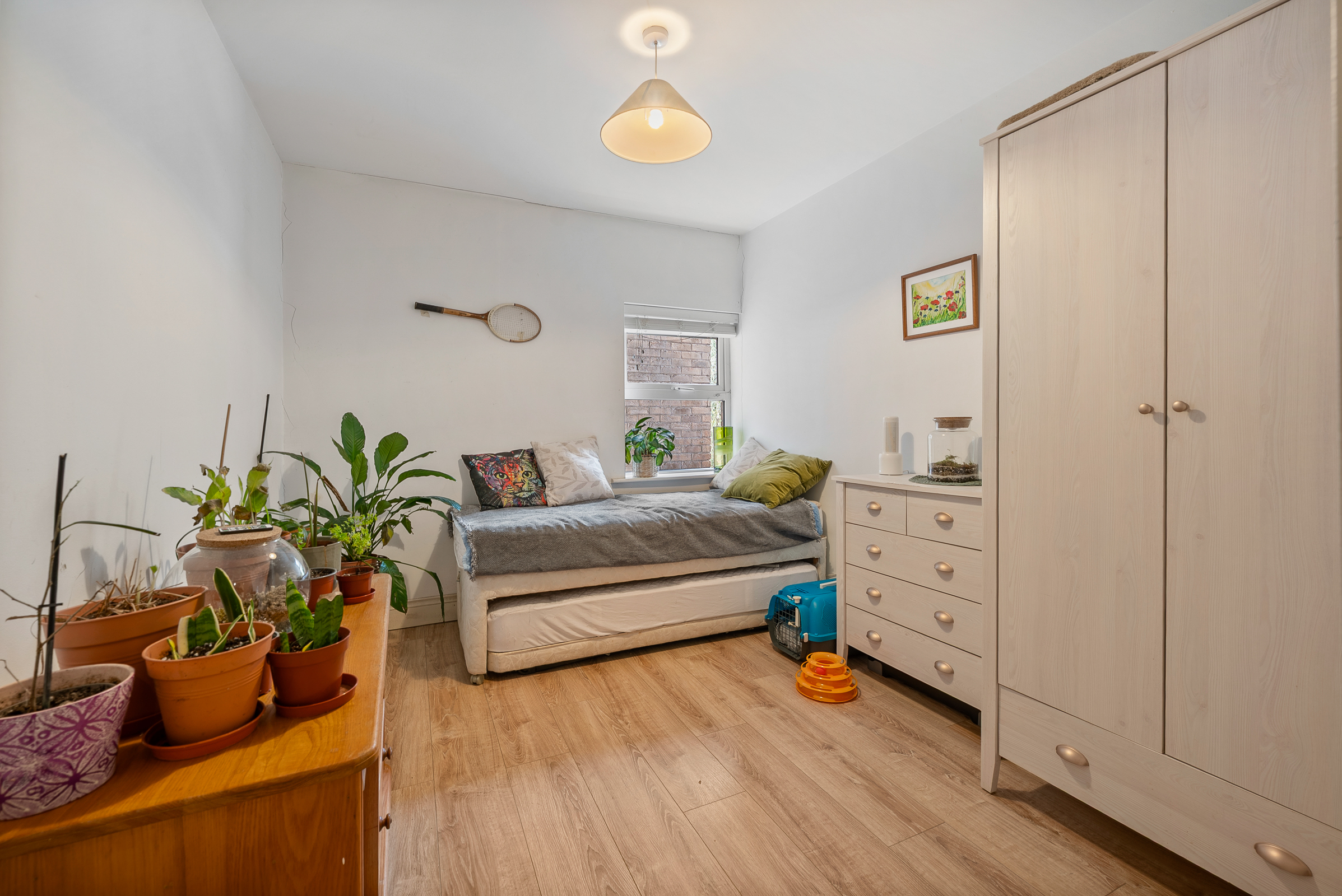 Another spacious double bedroom has one window overlooking the side of the property, timber flooring, one electric radiator, and one centre light fitting.