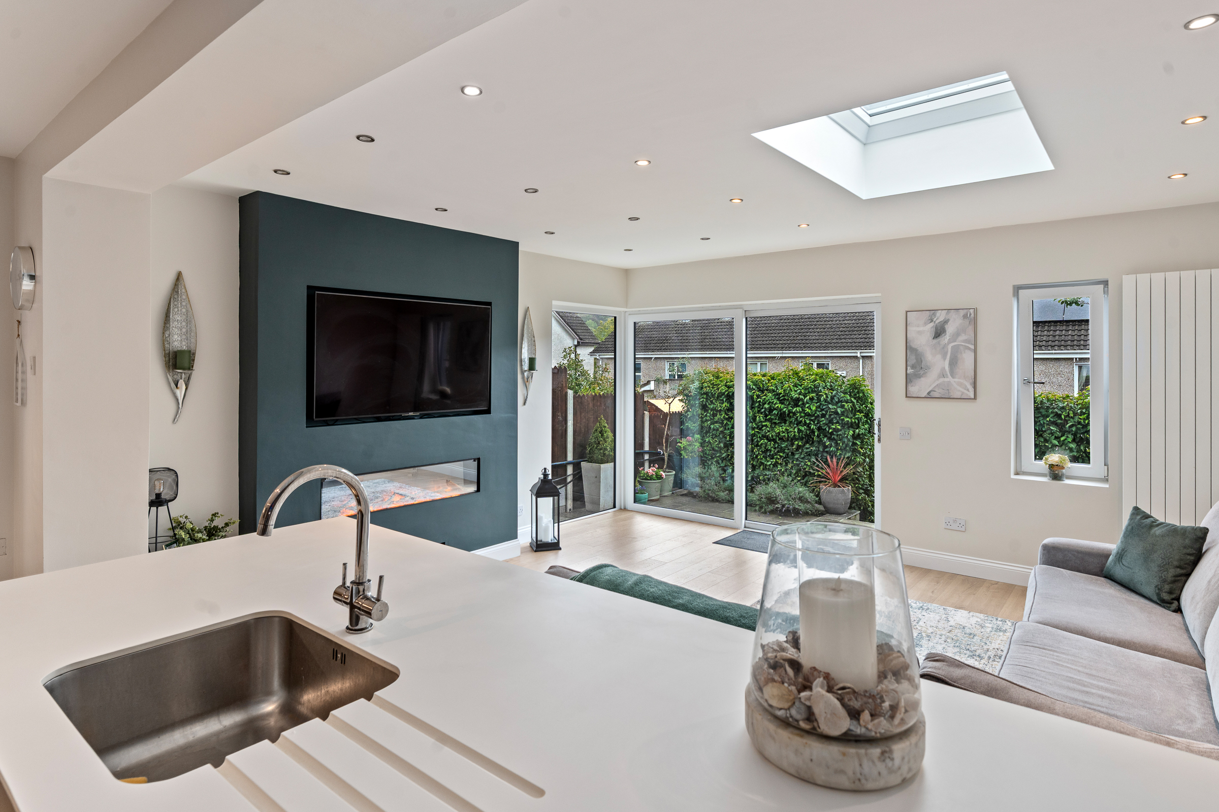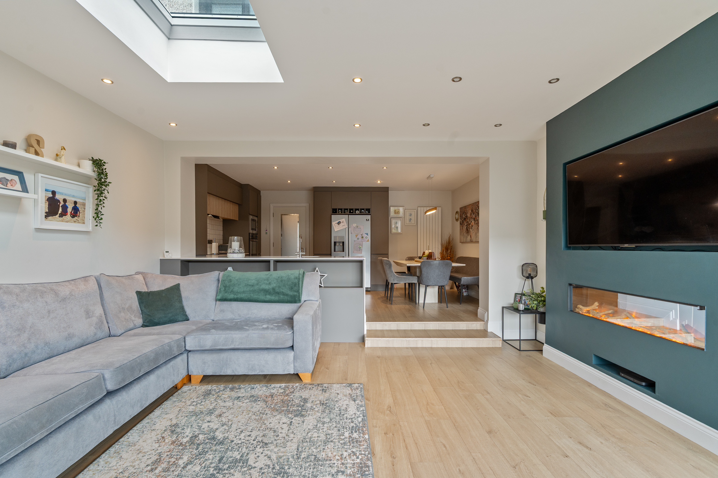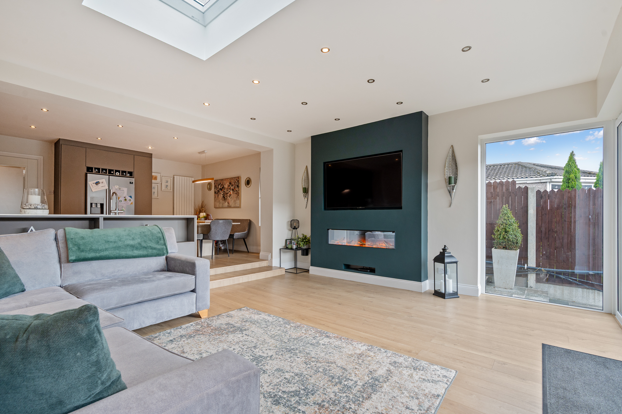 This spectacular rear extension is flooding with natural light owning to its mainly glazed rear wall, its strategic corner window and a Velux window. The room which is the heart of the home is finished with laminate timber flooring, recessed spot lighting and a bespoke media wall with an integrated electric fireplace. There are ten power points, and one television point and a sliding door from the room allows access to the rear patio area.