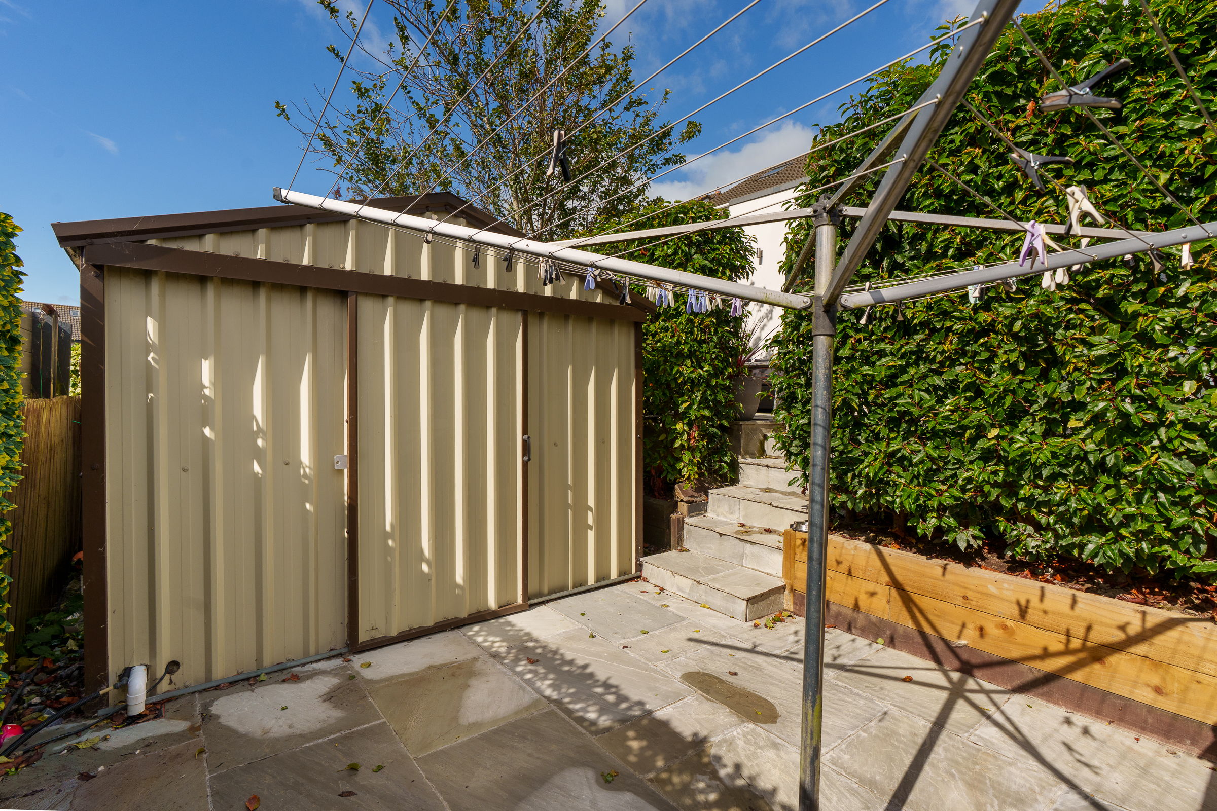 The rear of the property has been newly remodelled and is set across two levels. Steps from the main kitchen/dining/living area allow access to a limestone patio, ideal for summer entertaining, owing to the property’s sunny south facing rear aspect. Steps from the raised tier lead to a lower yard area, incorporating a Steeltech shed with plumbing, heating, electric supply, and water supply.