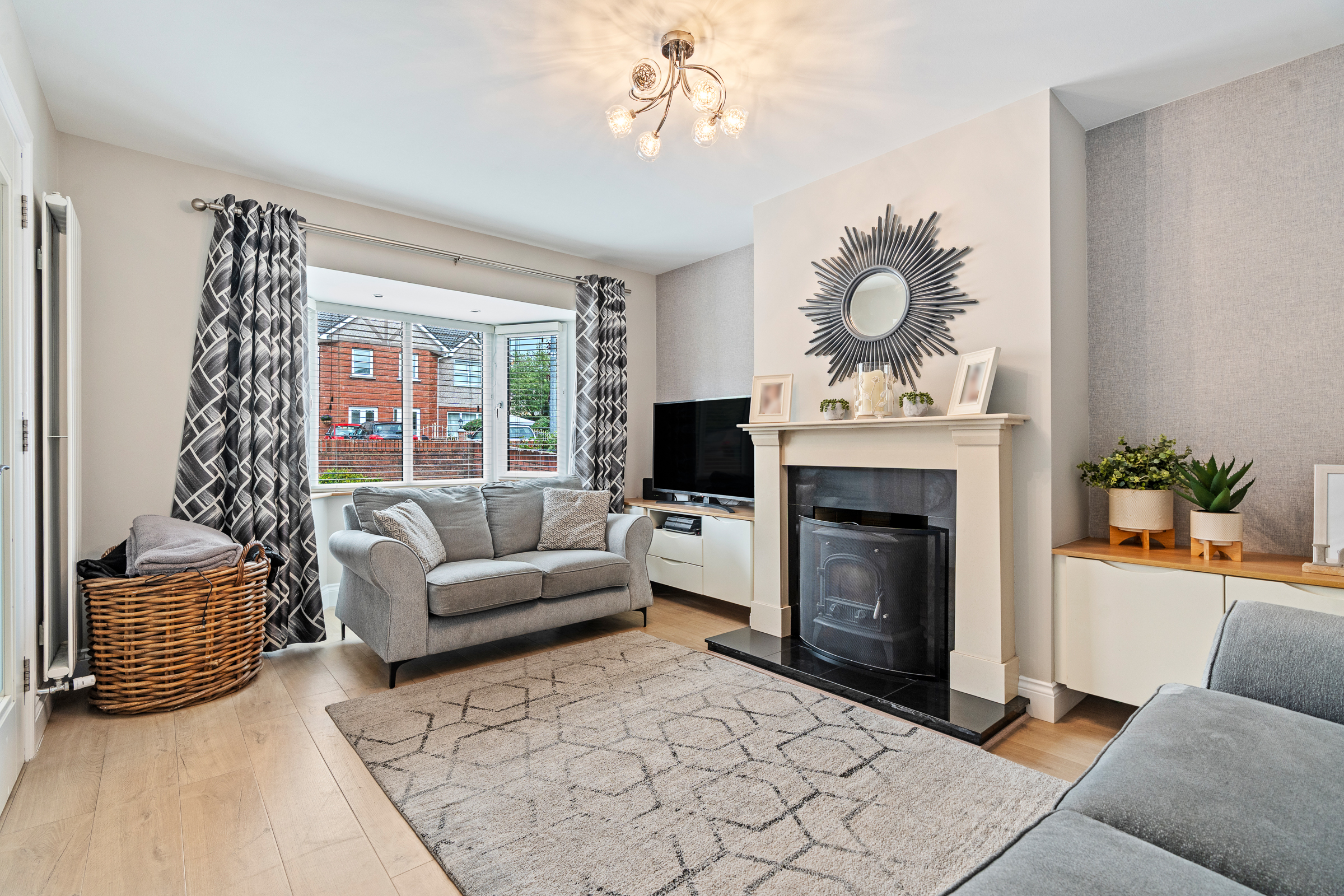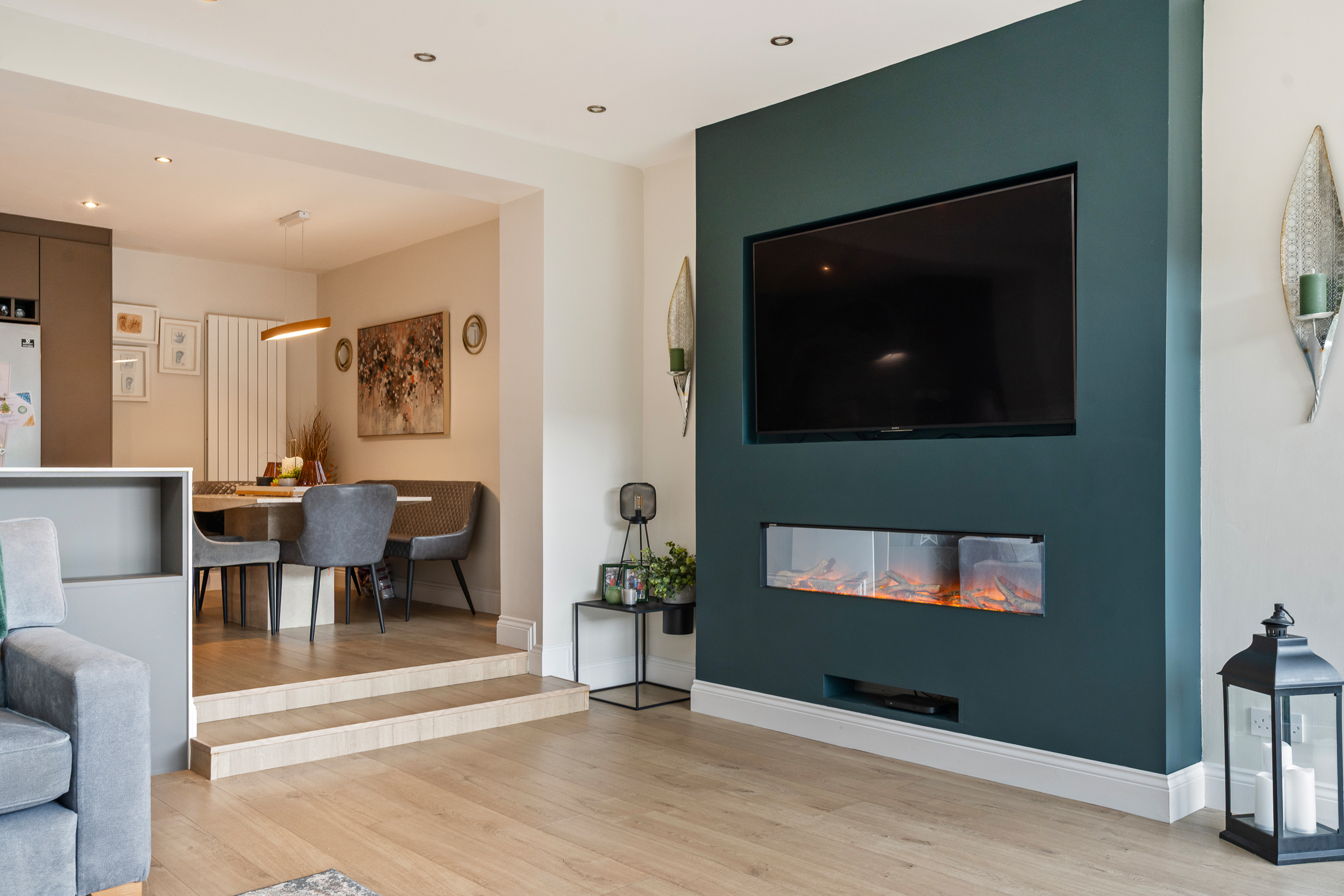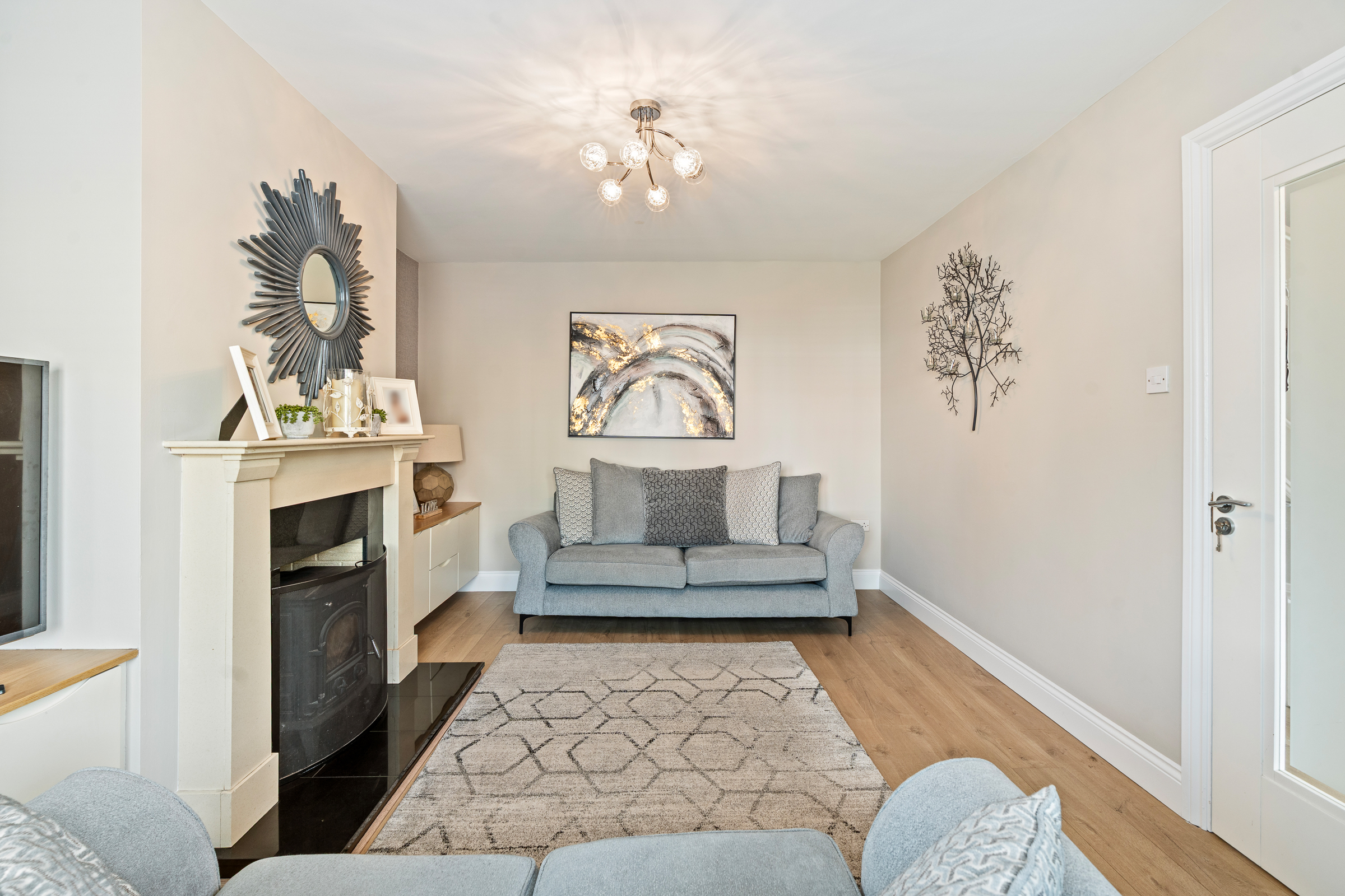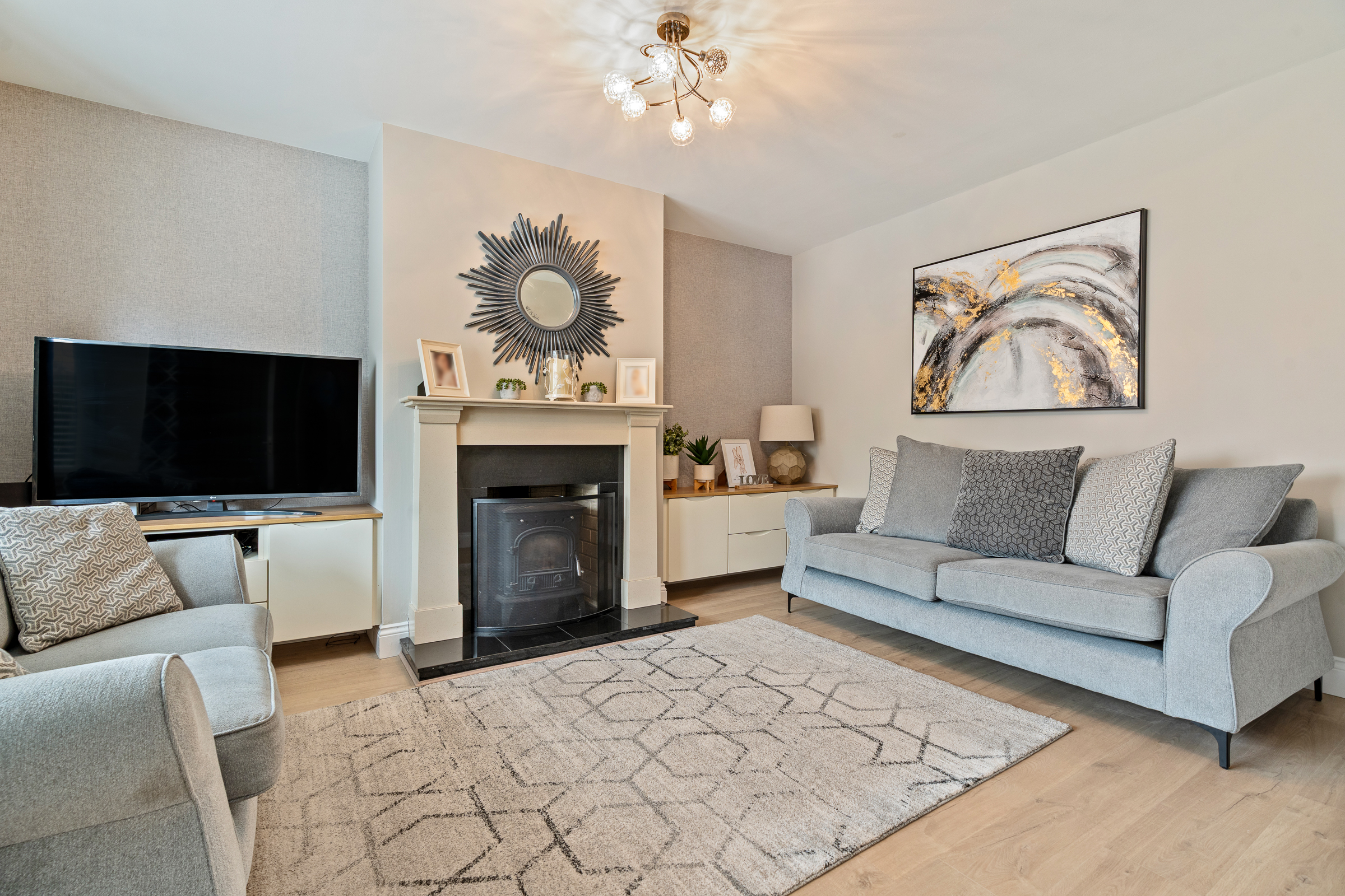 A superb living room has a feature bay window to the front of the property, including a Venetian blind, a curtain rail, curtains, and recessed lighting within the pelmet. The room has high quality laminate timber flooring, attractive décor, and a solid fuel stove. There is one centre light piece, one vertical radiator, bespoke built-in storage, six power points, and two television points.