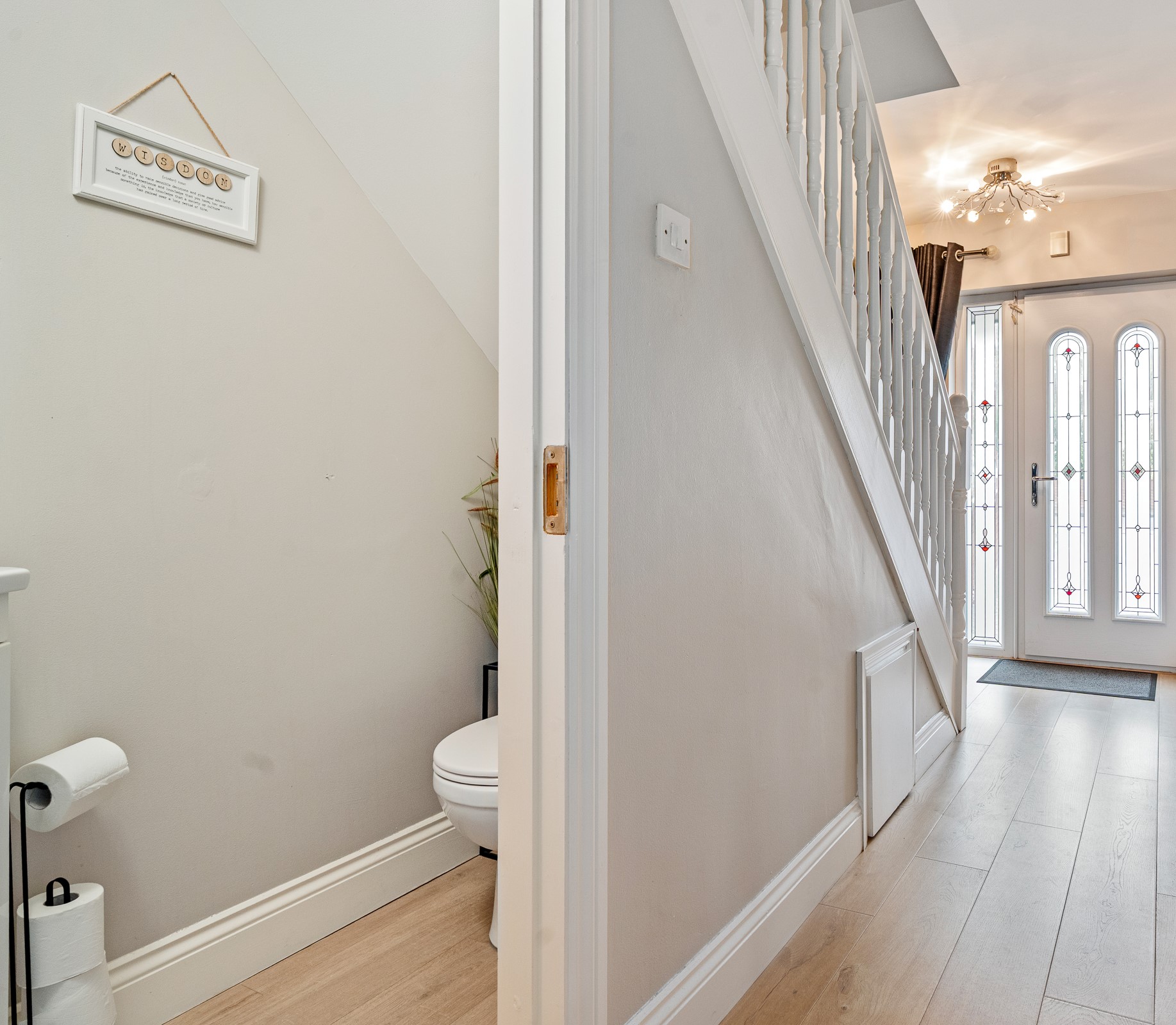 A palladio composite door with attractive stain glass centre panelling allows access to the main reception hallway. The bright and spacious reception hallway offers attractive decor and high quality laminate timber flooring. There is one centre light piece, one radiator enclosed behind a radiator cover, two power points, two telephone points, and under stair storage. A door allows access to the guest w.c.