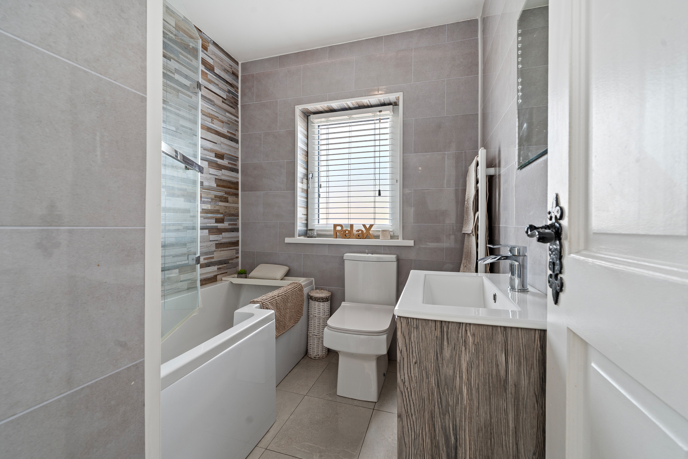 The spectacular main family bathroom has been recently refurbished and features modern tile flooring, PVC panelled walls, and an impressive P-shaped bath with a mains operated shower overhead. There is one window to the front of the property with a Venetian blind, one centre light piece, a heated towel rail, and integrated storage.