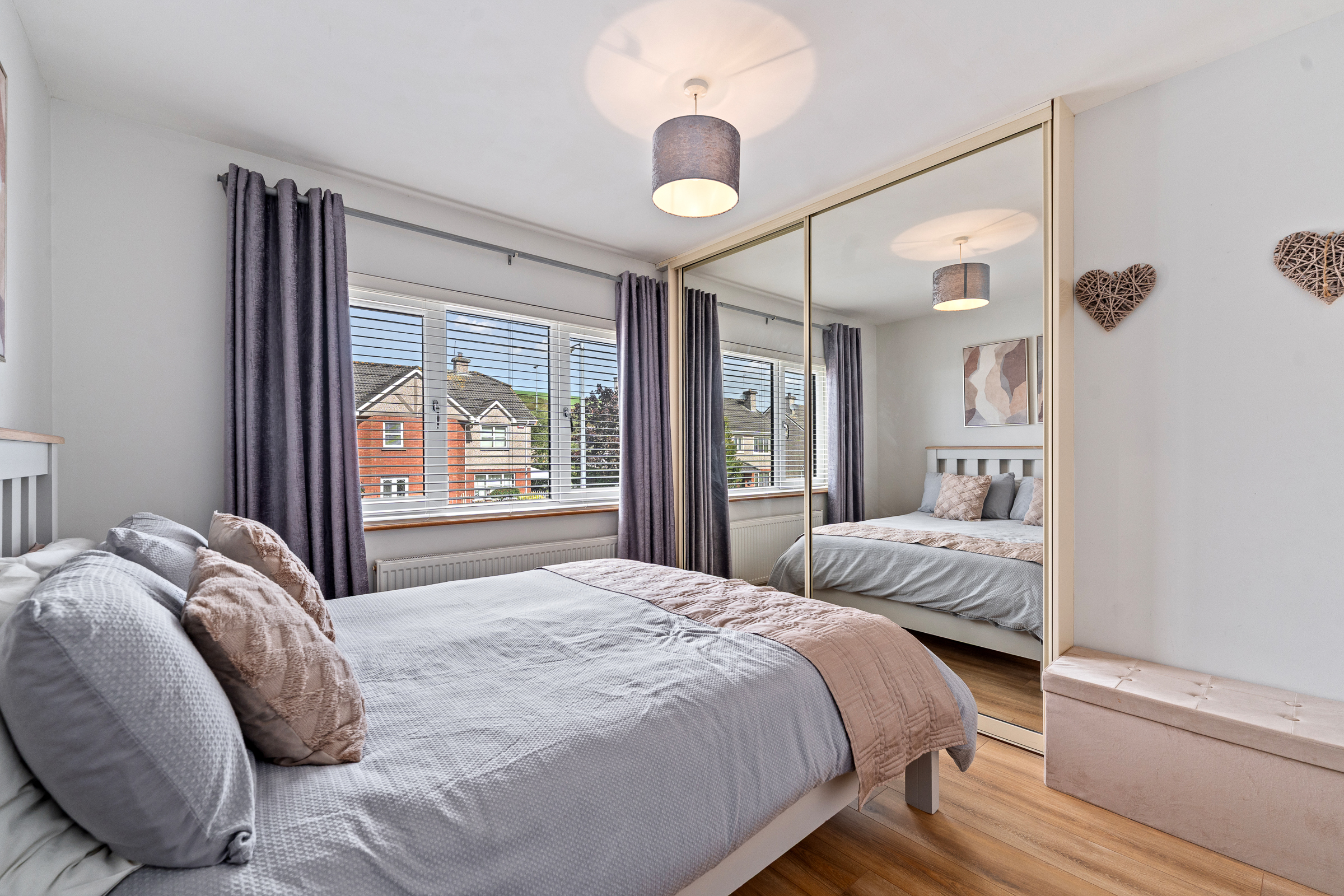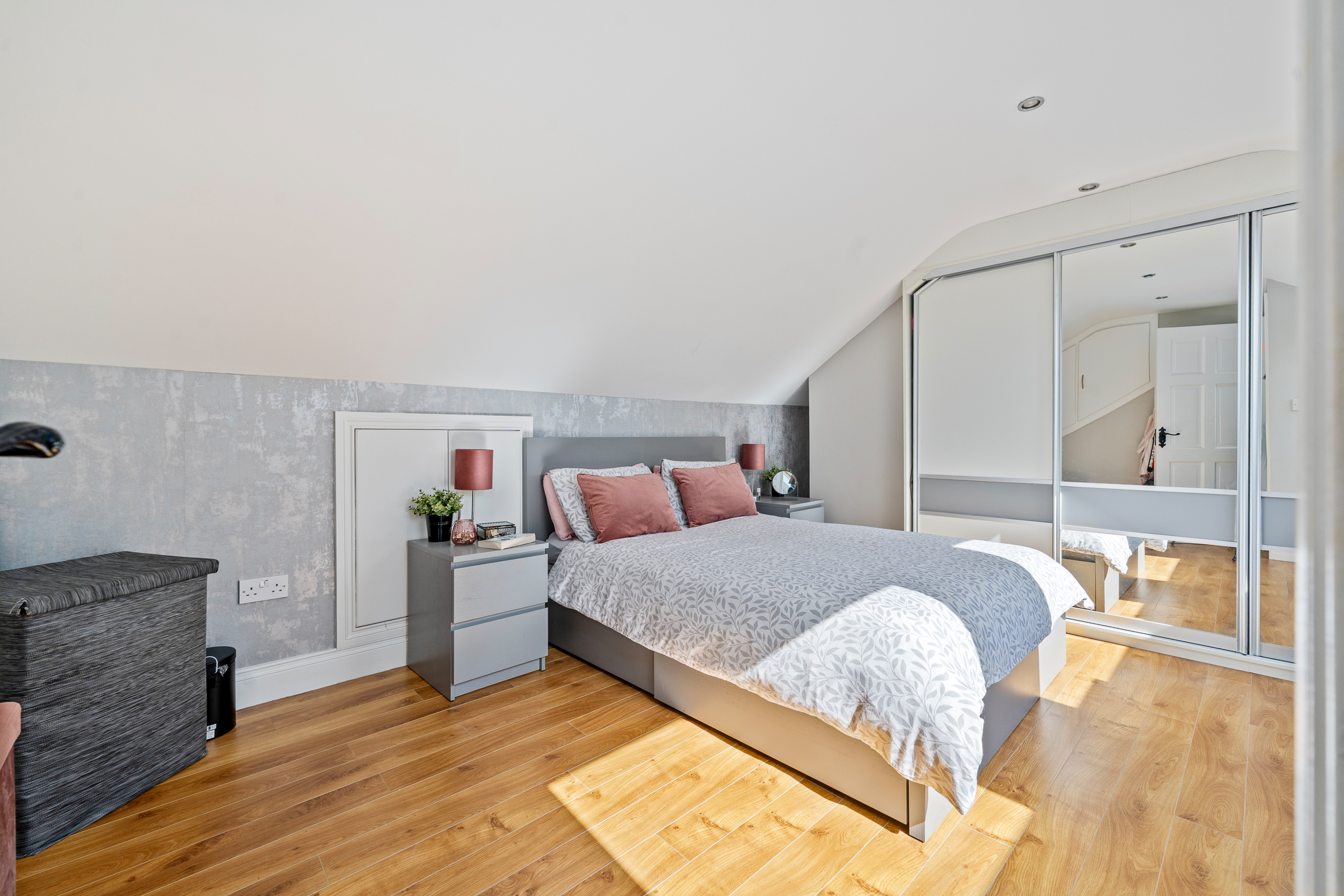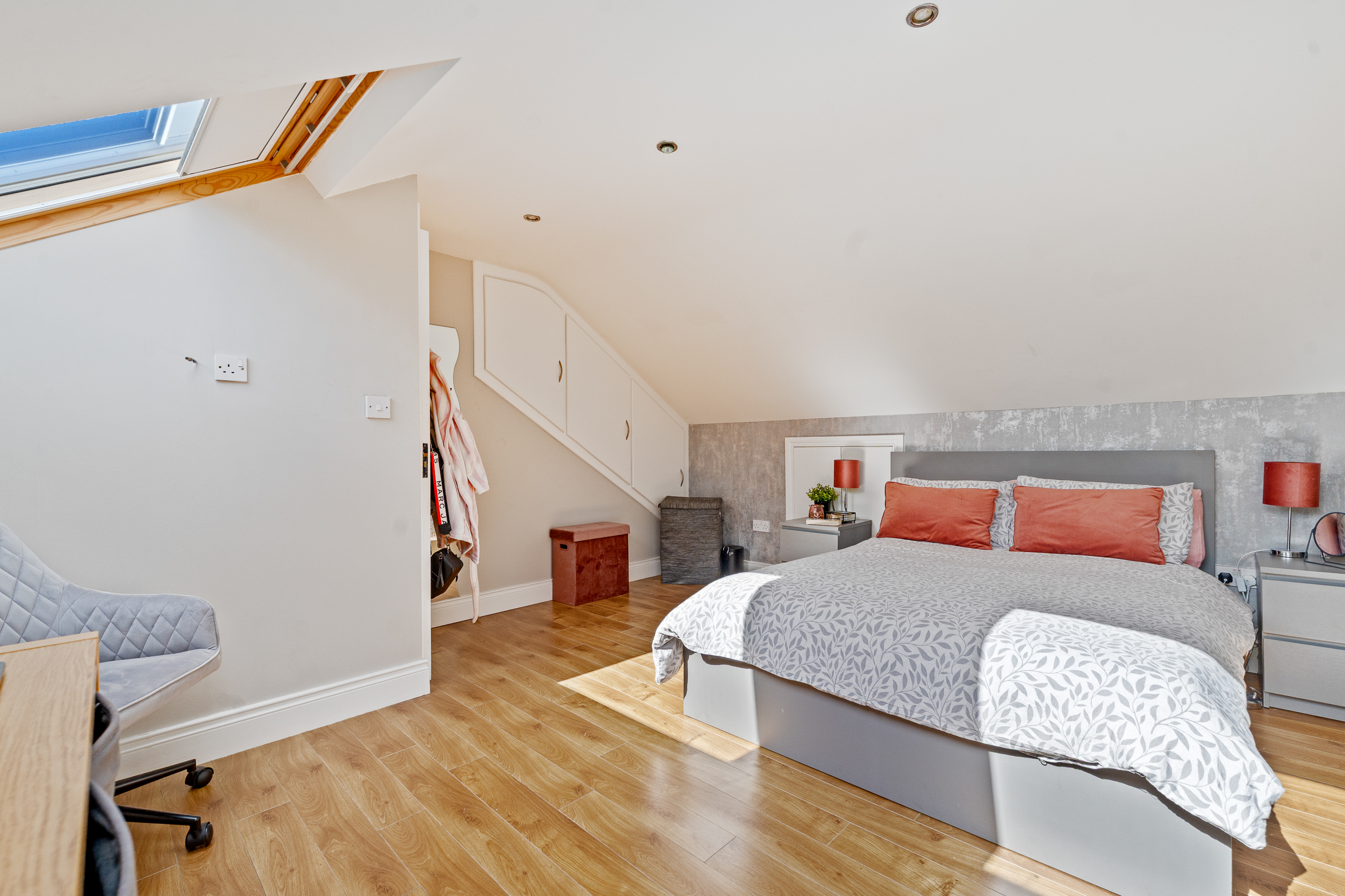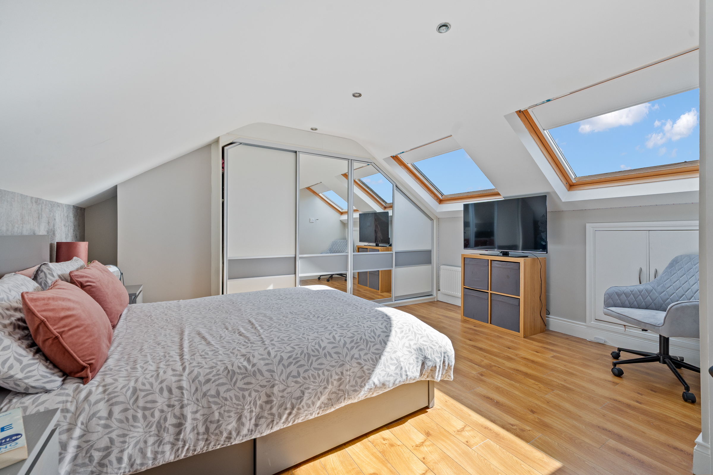This superb attic conversion features two large Velux windows to the rear, which flood the area with natural light. The room has laminate timber flooring, bespoke Sliderobe fitted units, additional storage space and access to the eaves. There is one radiator, recessed spot lighting, and seven power points.