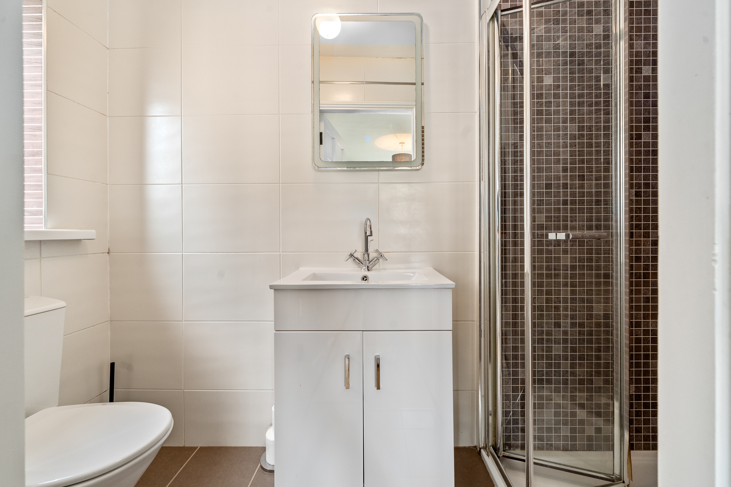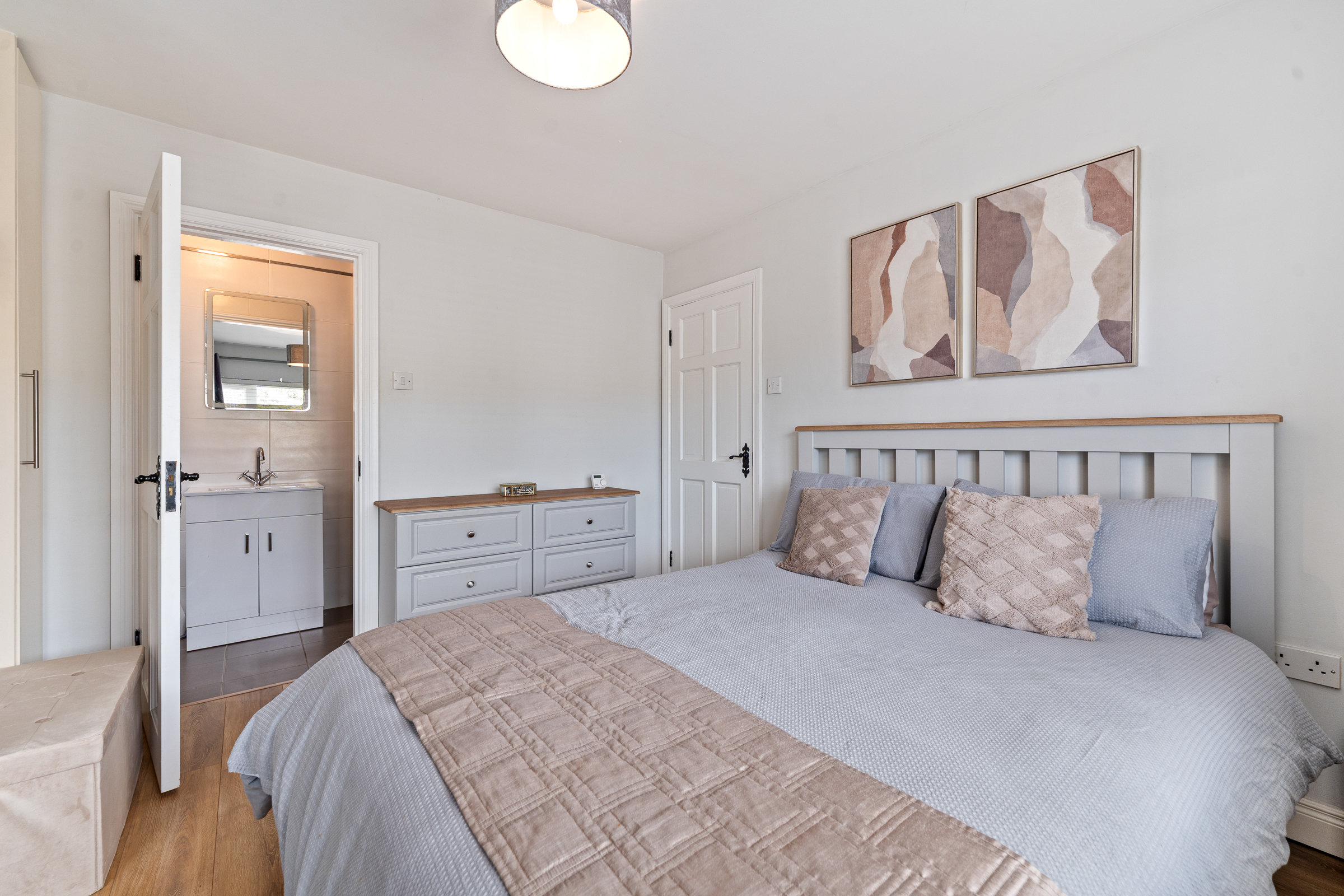 The en suite bathroom features a three piece suite including a double corner shower area incorporating a mains operated shower. There is impressive floor and wall tiling, one window to the side of the property, one centre light piece, and a heated towel rail.