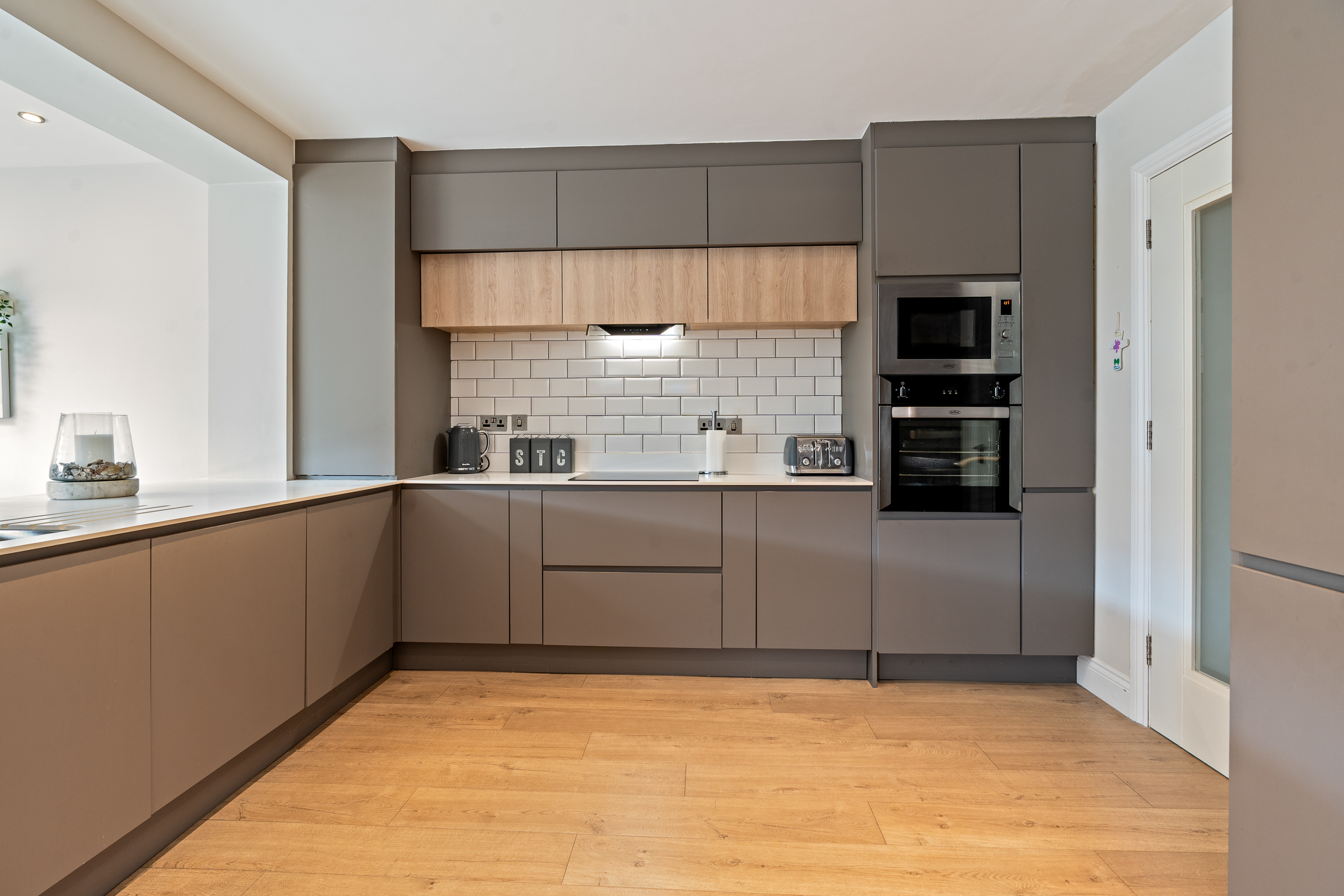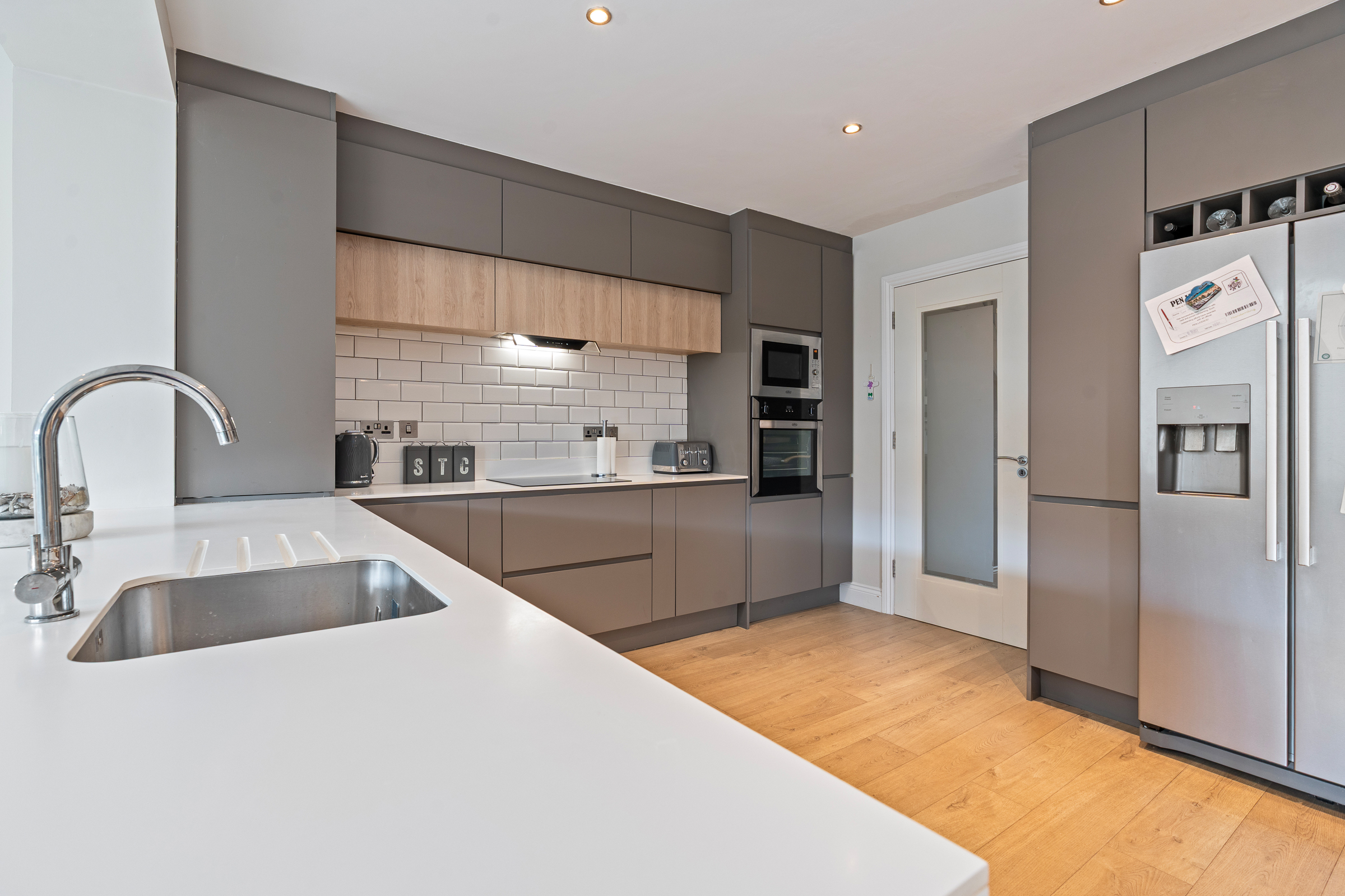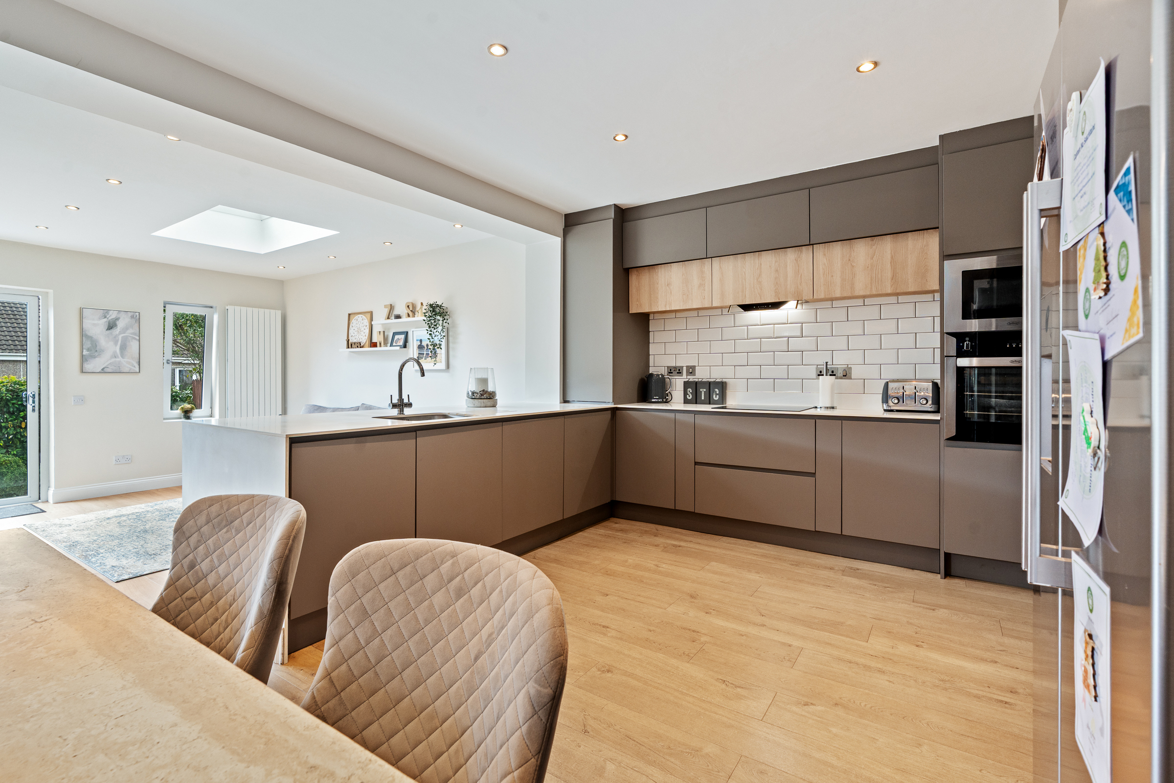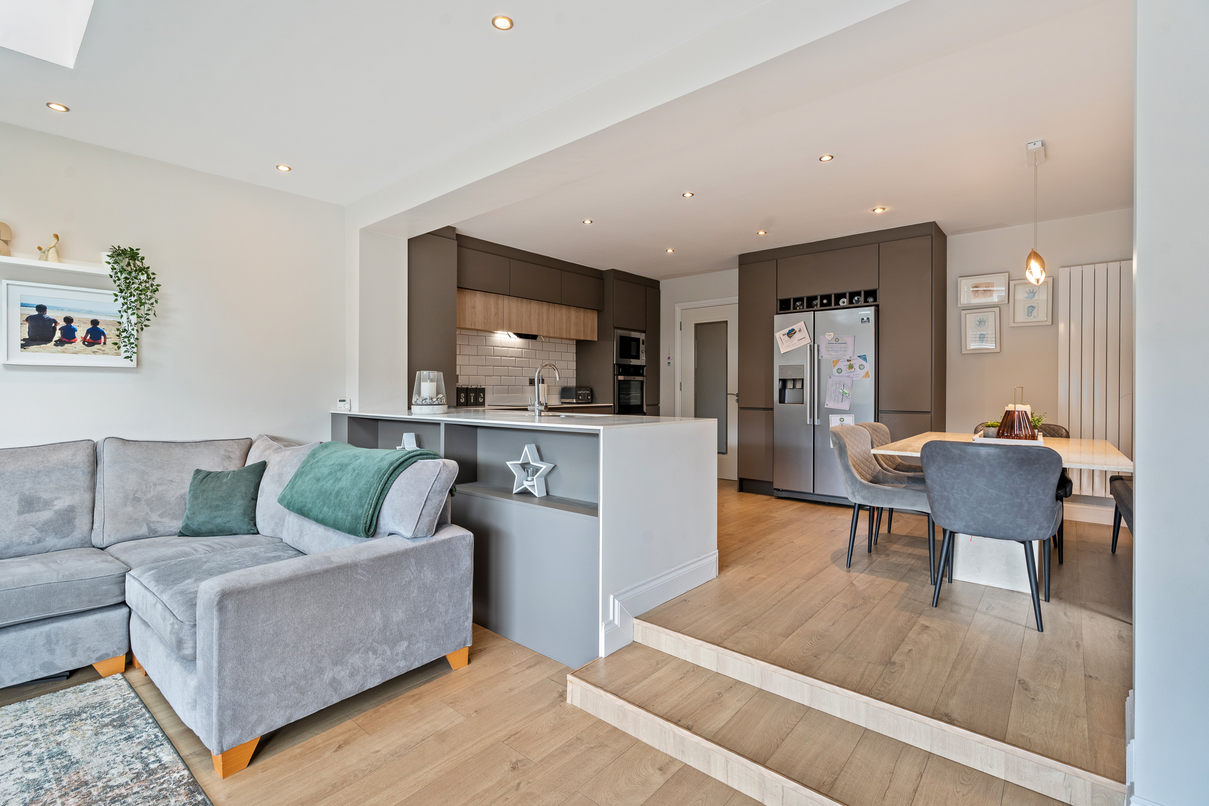 The kitchen features modern fitted units at eye and floor level in an L-shape with extensive worktop counter, and tile splashback. The kitchen includes an integrated oven/hob/extractor fan, microwave, dishwasher, washing machine and bins. The area has laminate timber flooring, recessed spot lighting, one vertical radiator, a feature centre light piece, and an open arch allows access to steps leading down to the superb rear extension which lends itself to a second living space.