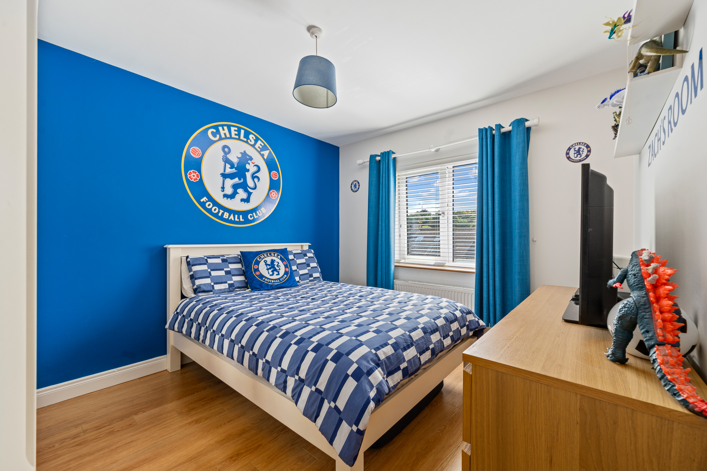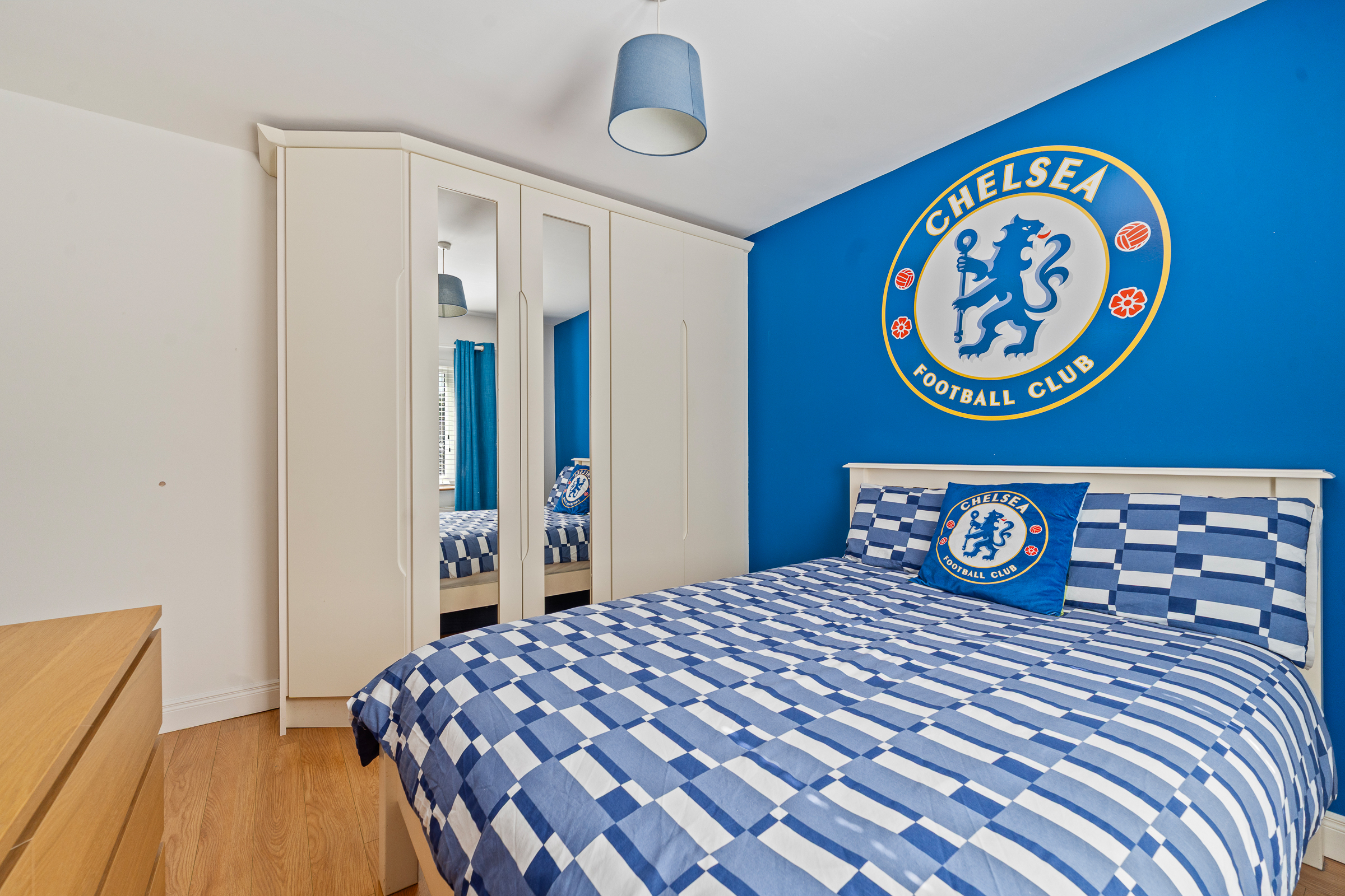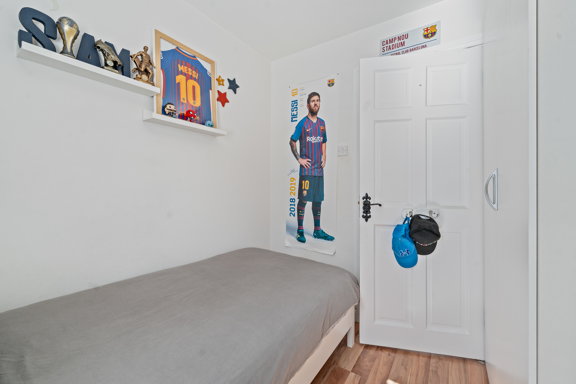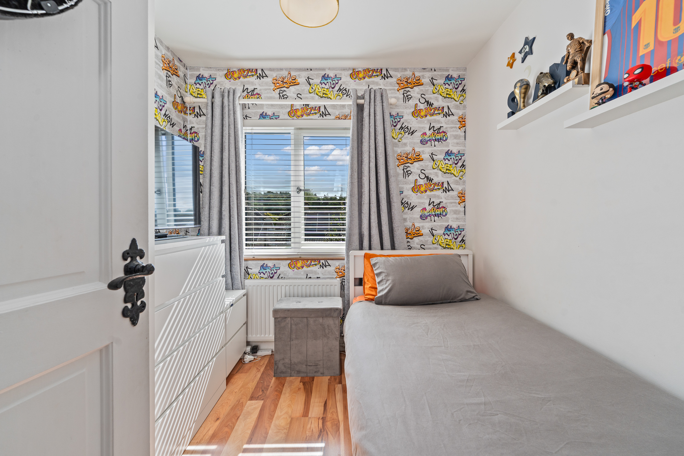A spacious single bedroom has one window to the rear of the property, including a Venetian blind, a curtain rail and curtains. The room has laminate timber flooring, modern children’s décor, one centre light piece, one large radiator, and two power points.