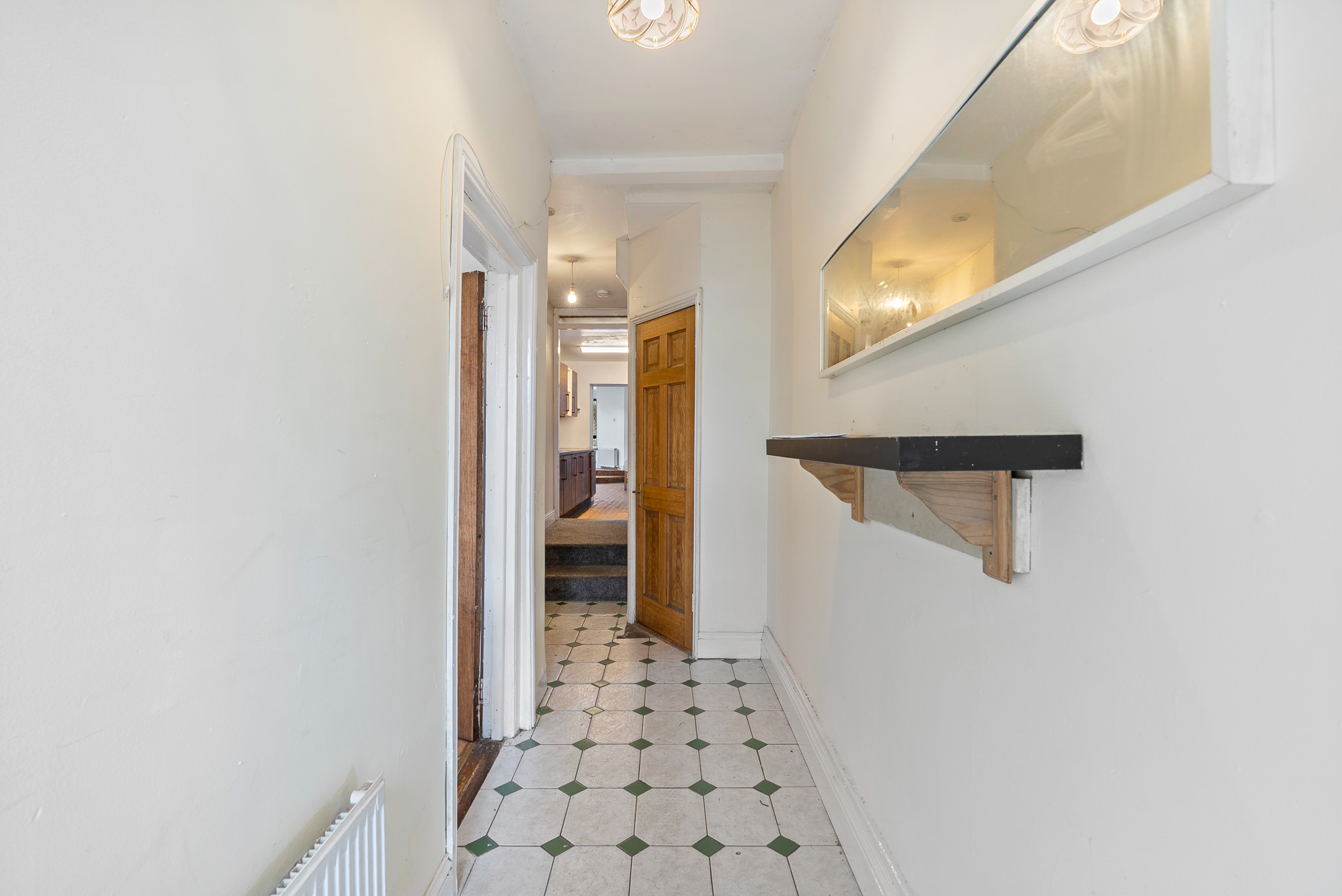 A PVC door with frosted glass panelling allows access into the main reception hallway. The spacious hallway has tile flooring, one centre light fitting, one radiator, and access to storage.