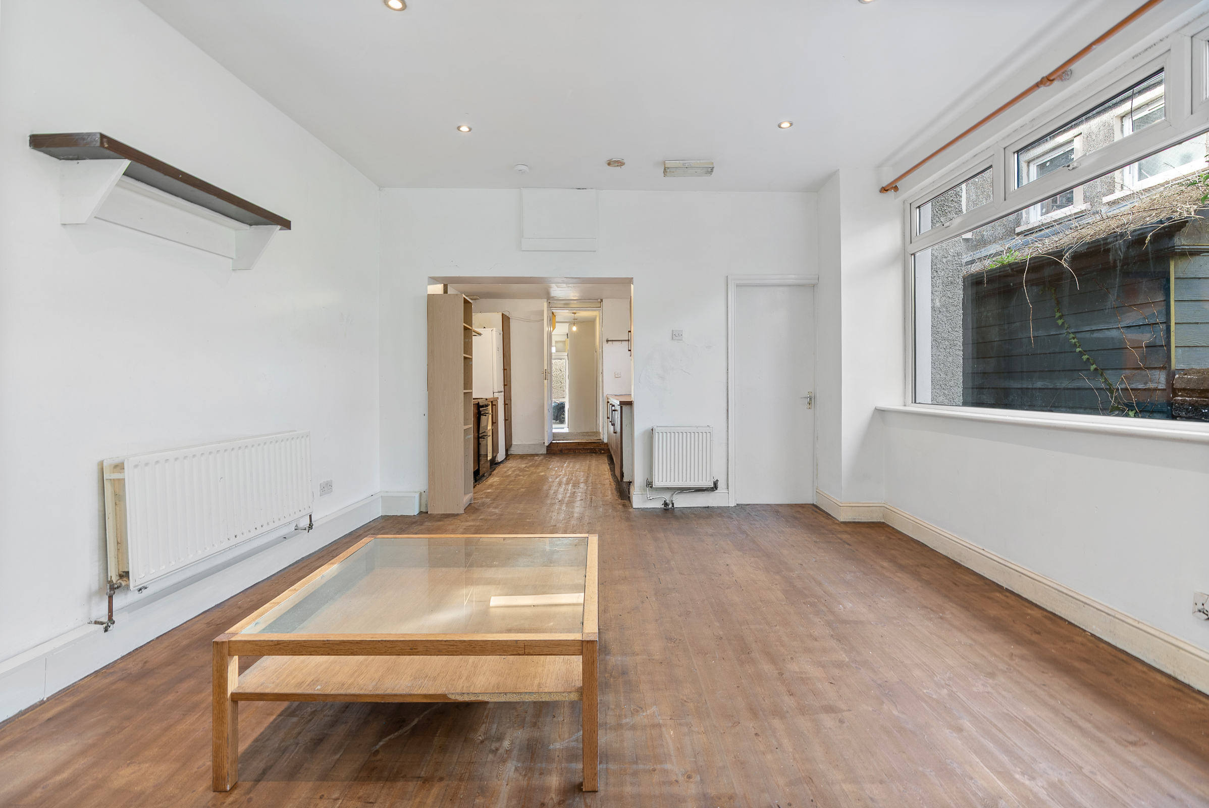 The dining/living area is bright and spacious with feature large windows to the side. There is recessed spot lighting, timber flooring, one radiator, and the gas boiler is housed here. Double glass doors allows access to the rear garden.