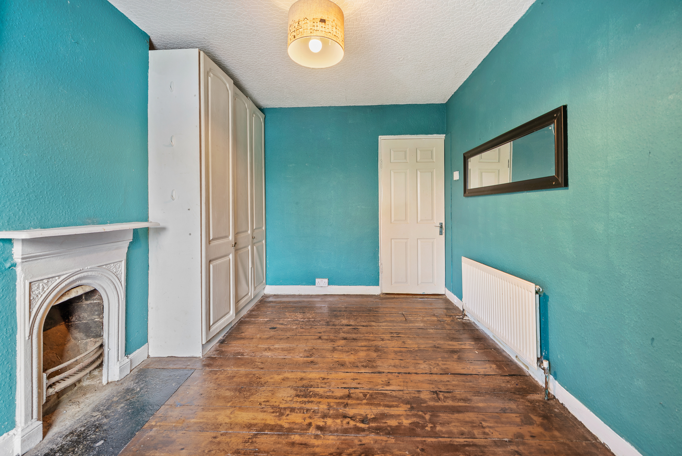 This double bedroom has one window overlooking the Lough to the front of the property, built-in units for storage, radiator, centre light fitting, open fireplace and wooden timber flooring.
