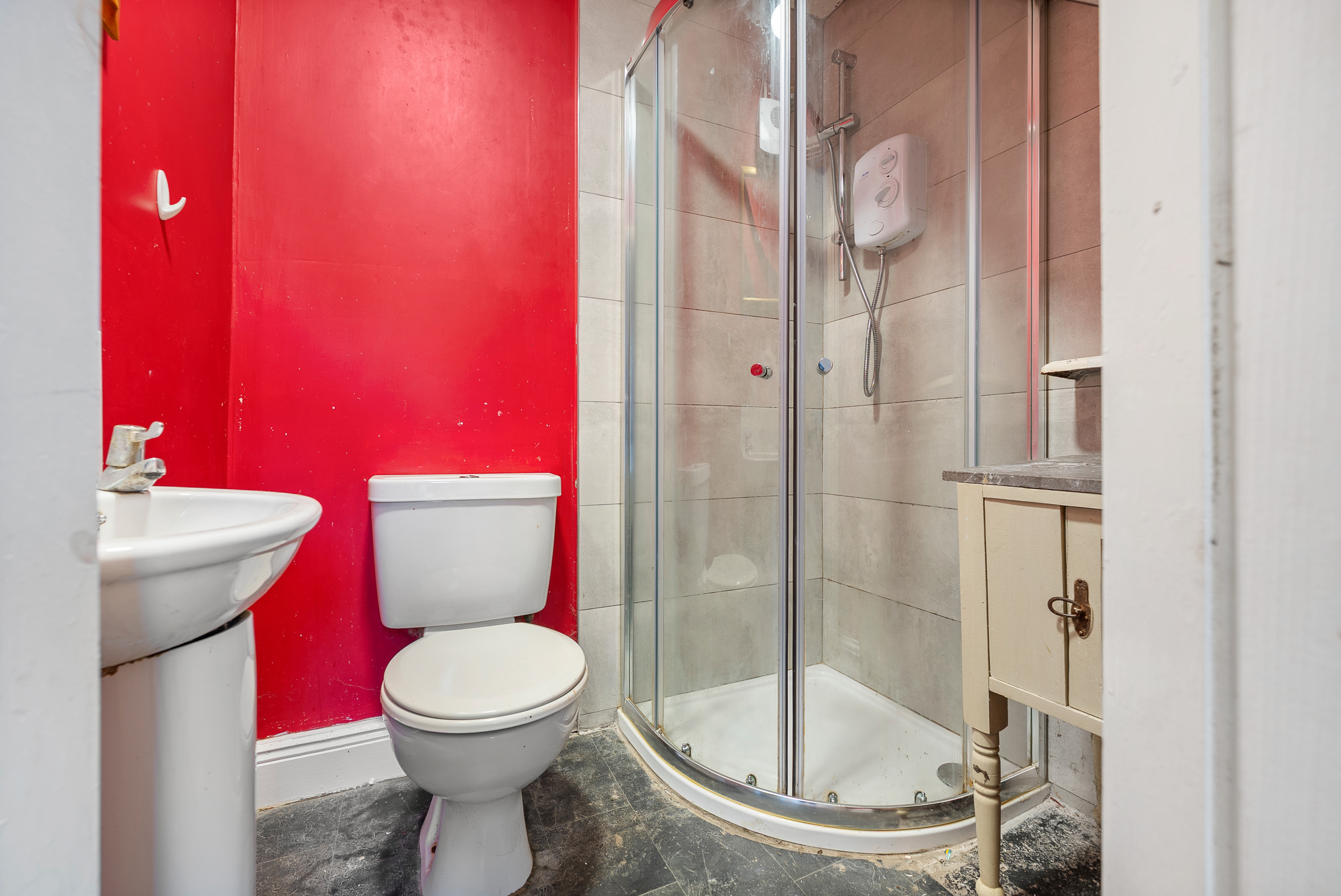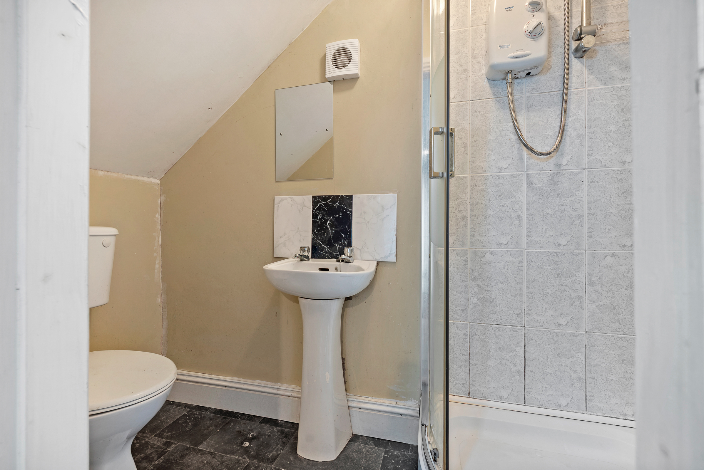 The bathroom features a three piece suite including a built-in shower cubicle incorporating a Triton T80 SI electric shower, one frosted window to the rear, one radiator.