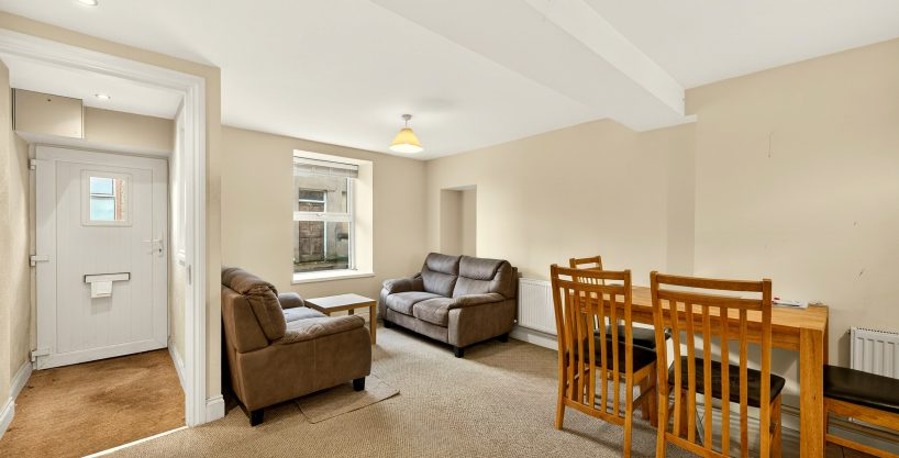 The living area has carpet flooring, one window to the front of the property, a large radiator, neutral décor, and one centre light fitting.