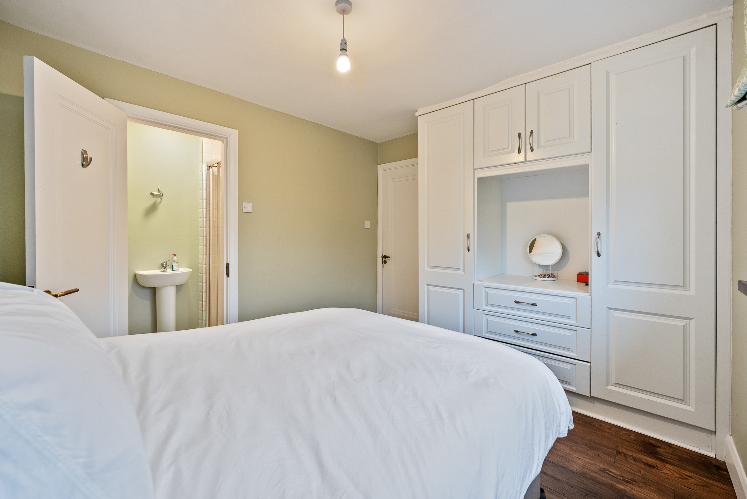 The newly refurbished en suite bathroom features a three piece suite. The area has impressive tiling throughout including modern subway tiling to the shower area. There is one centre light piece, one window to the side of the property, one extractor fan, one wall-mounted heater, and wiring for a wall-mounted light piece.