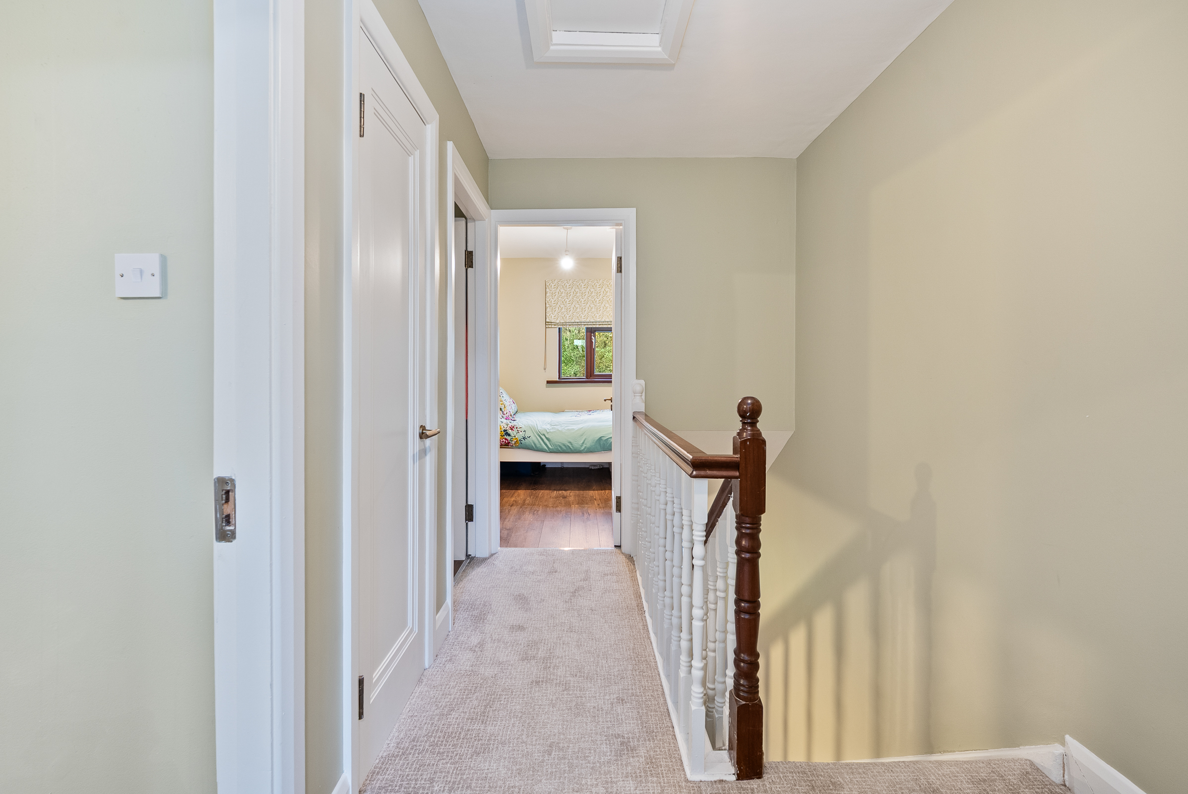 The stairs and landing are fitted with high quality carpet flooring. At the top of the landing there is one centre light piece, a mains operated smoke alarm, a hot press area which is shelved for storage, a feature wall-mounted light piece and an access hatch to the attic.