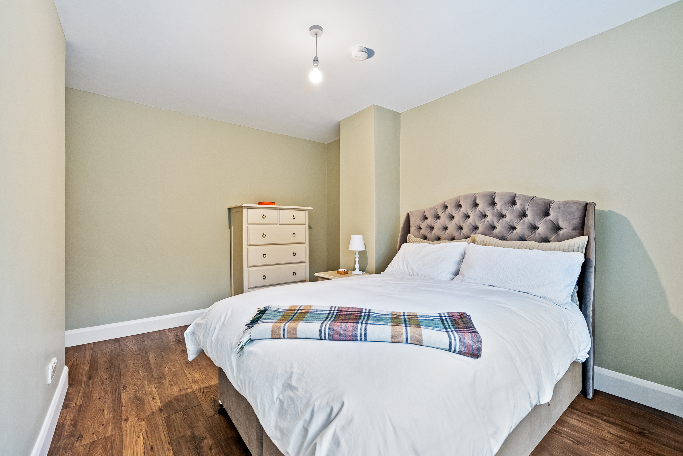 A spacious double bedroom has one window to the front of the property including a Roman blind. The room has high quality laminate timber flooring, superb décor, one centre light piece, one large radiator, and six power points.