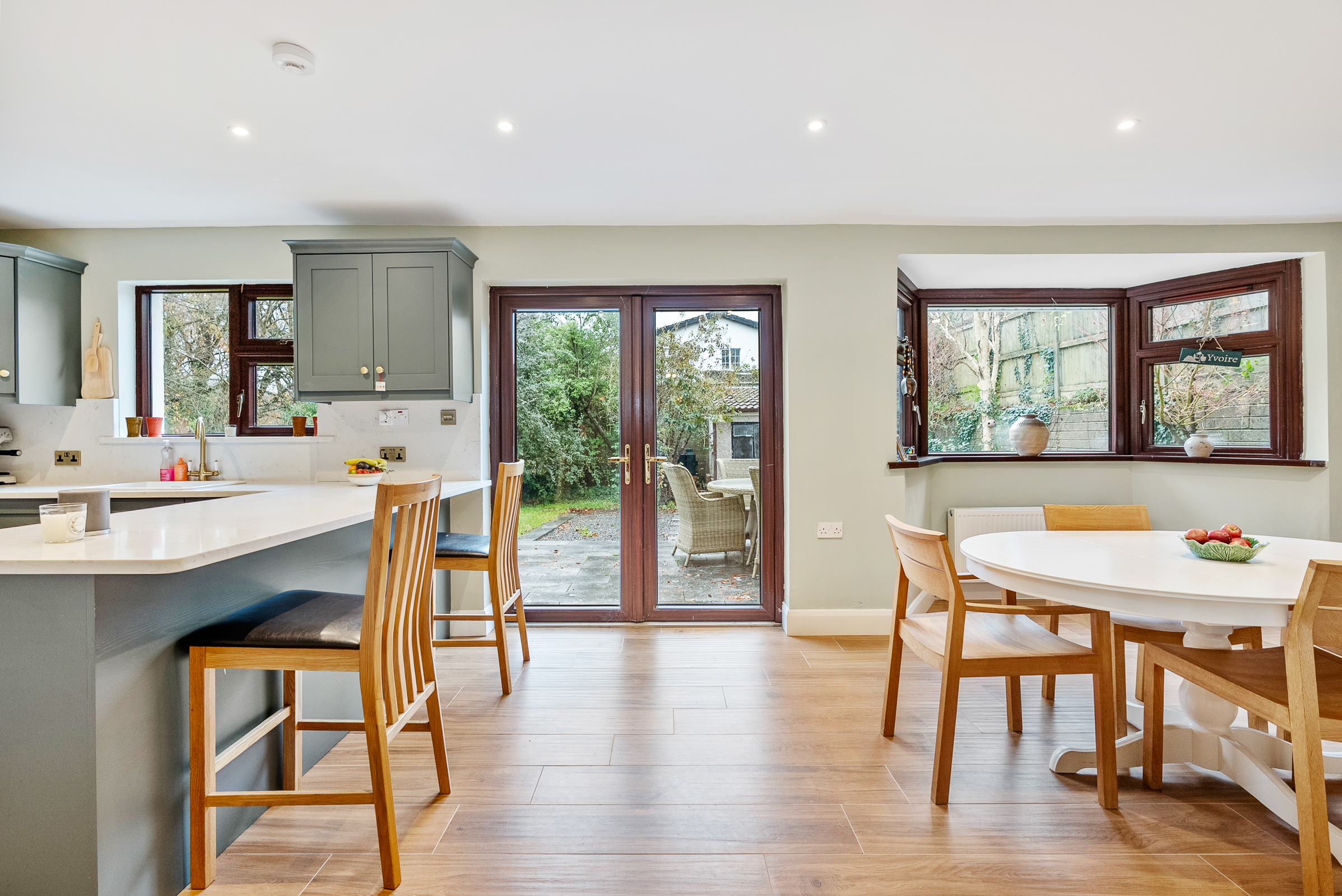 The open plan kitchen/dining area features modern fitted kitchen units at eye and floor level in a U-shape, with granite worktop and splashback. The kitchen includes an integrated double oven, hob, extractor fab, fridge freezer, dishwasher and bins together with a generous breakfast bar. The room is finished recessed spot lighting, timber effect tile flooring, one window to the rear, and double doors allowing access to a superb patio area.