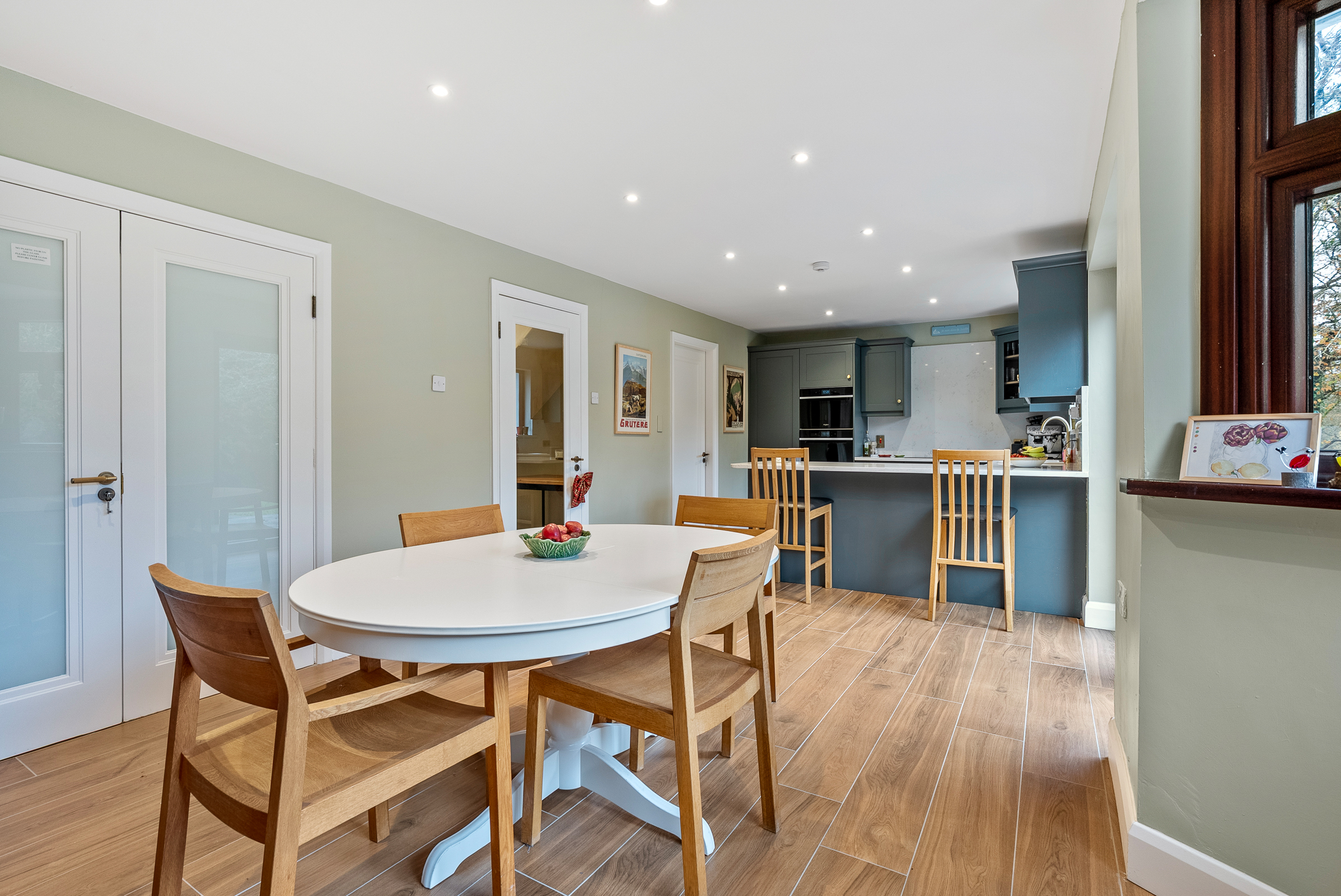 A spectacular main living room boasts superb high quality décor throughout, and offers a large feature bay window to the front of the property including Roman blinds. The area has solid timber flooring, a solid fuel inset stove, one centre light piece, two wall-mounted light pieces, one large radiator, seven power points, and one television point. Double doors with frosted glass panelling allow access to the open plan kitchen/dining area.