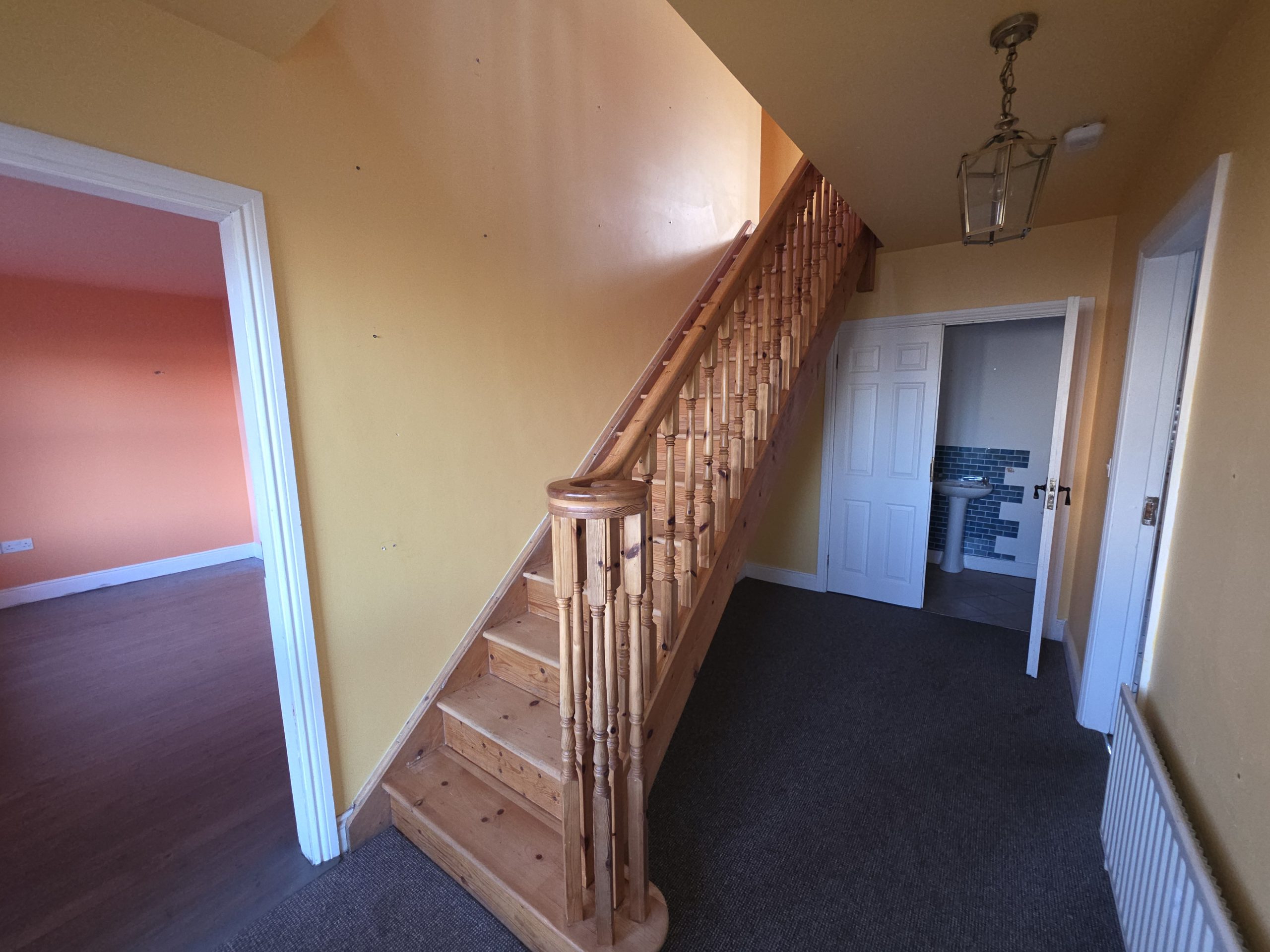 A part glazed panel door allows access to the main reception hallway. The hallway features one centre light piece, carpet flooring, one wall-mounted radiator and under stair storage.