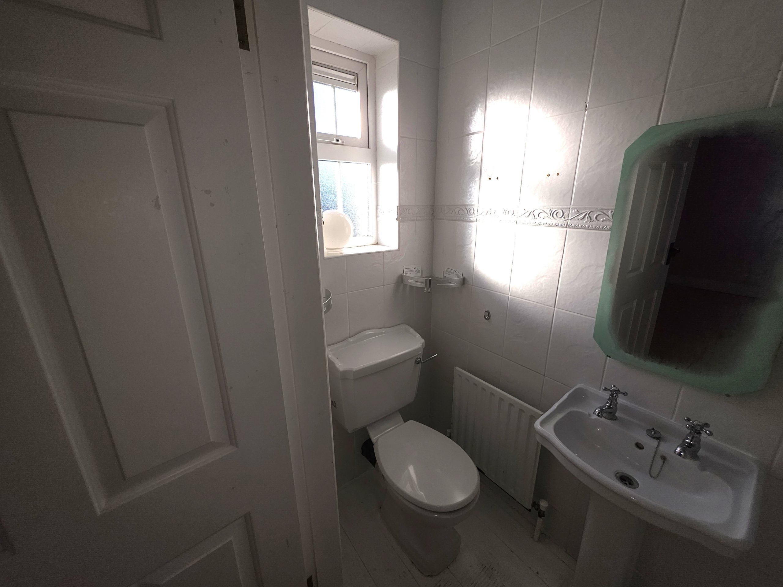 The guest w.c features a two piece suite, tile flooring, one centre light piece and one wall-mounted radiator.