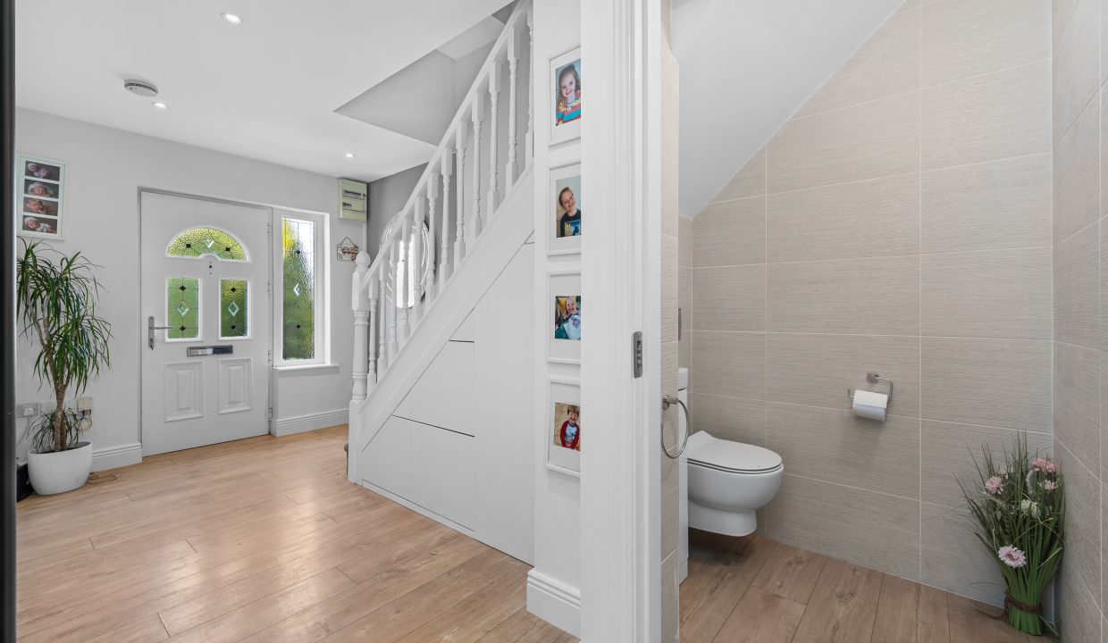 A composite door with stain glass centre panelling and a side window allows access to the reception hallway. The bright and well-proportioned hallway features attractive décor with high quality laminate timber flooring. The area has recessed spot lighting, smart storage within the staircase, four power points, one telephone point, a thermostat control for the heating, and a modern vertical radiator. A door with glass panelling allows access to the guest w.c.