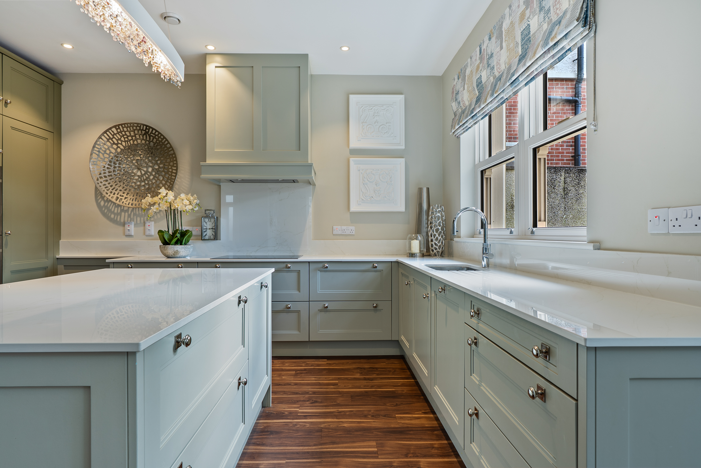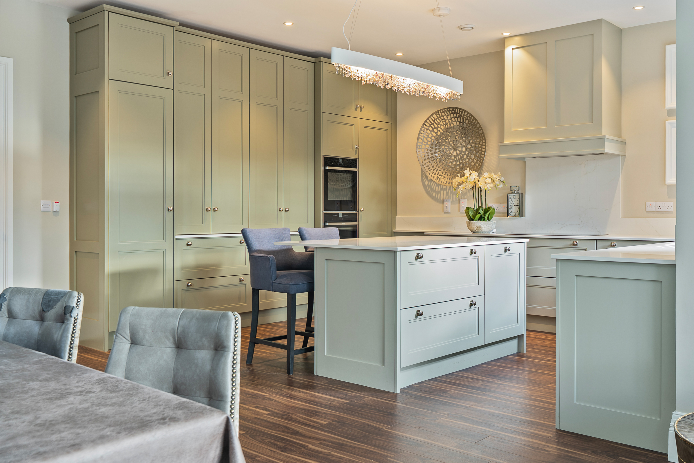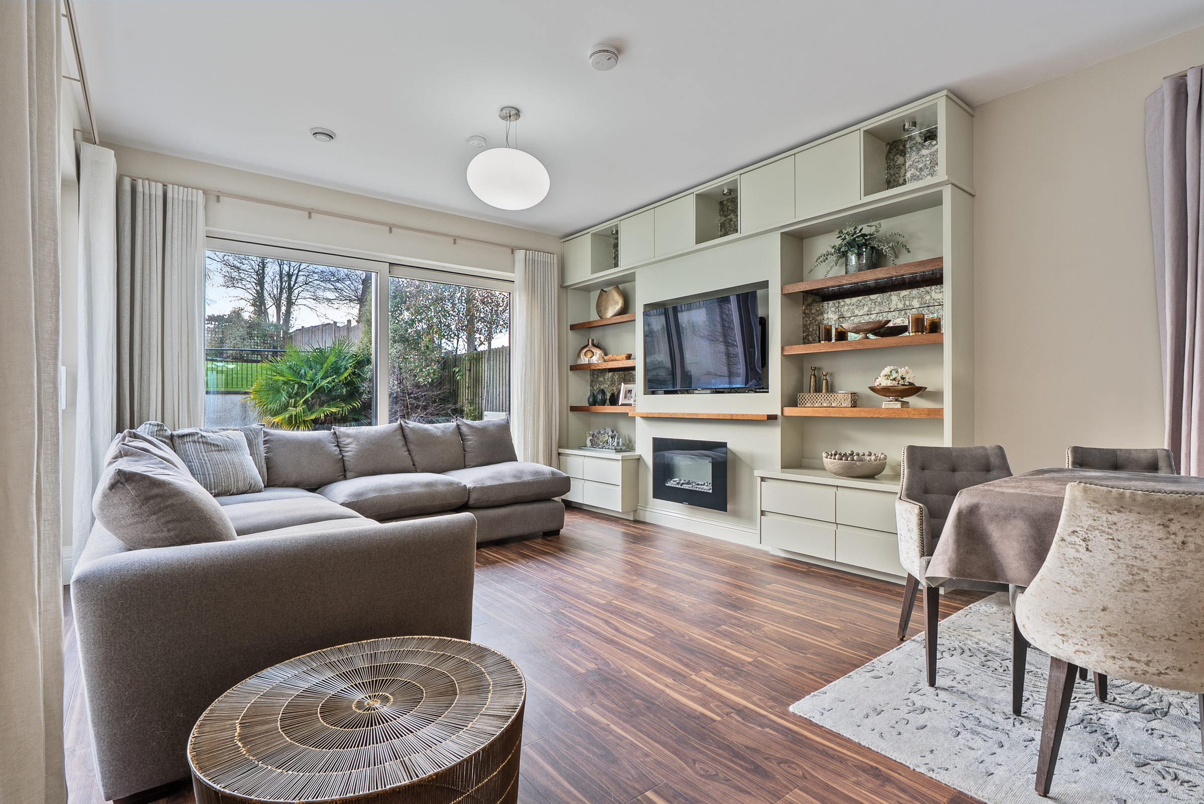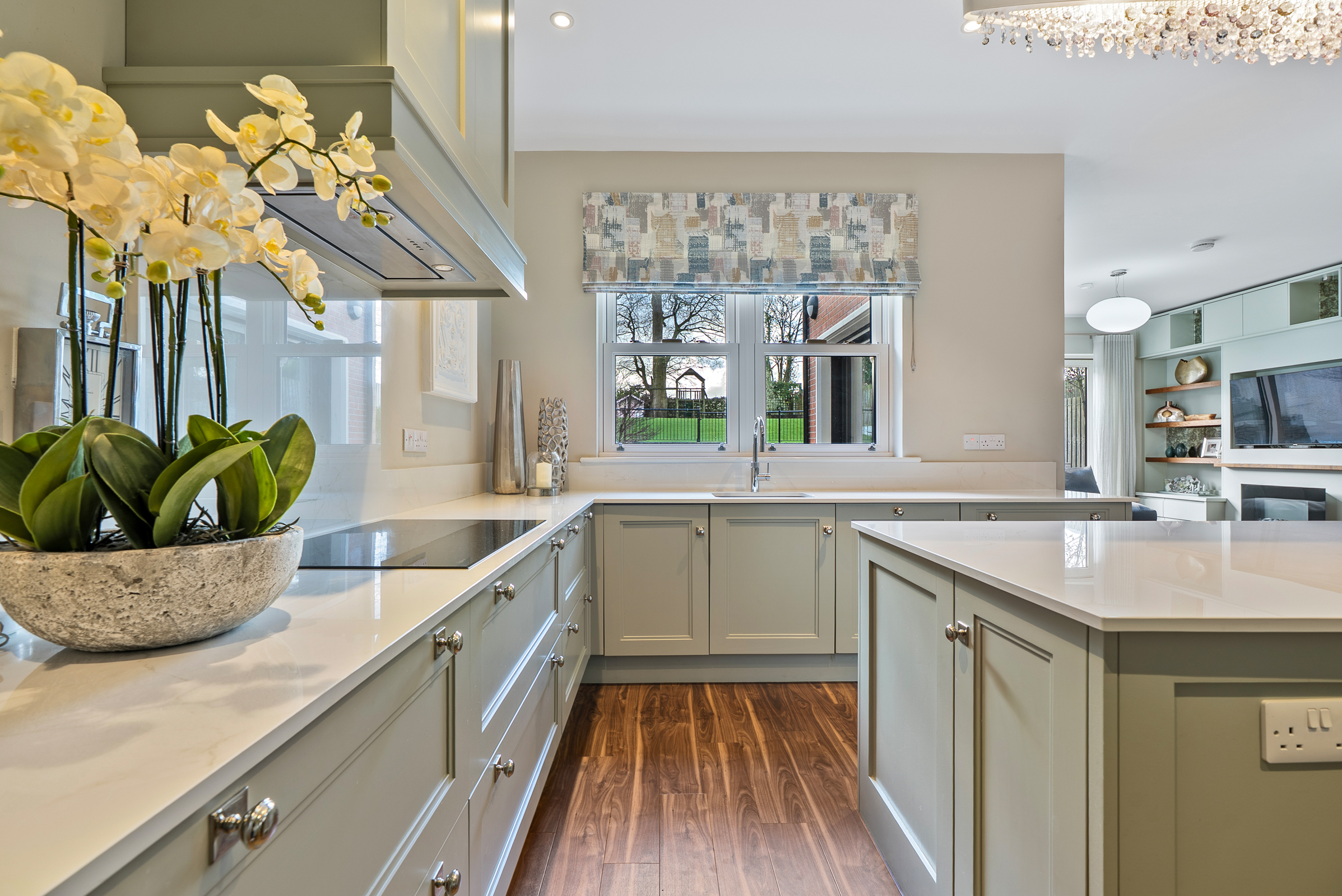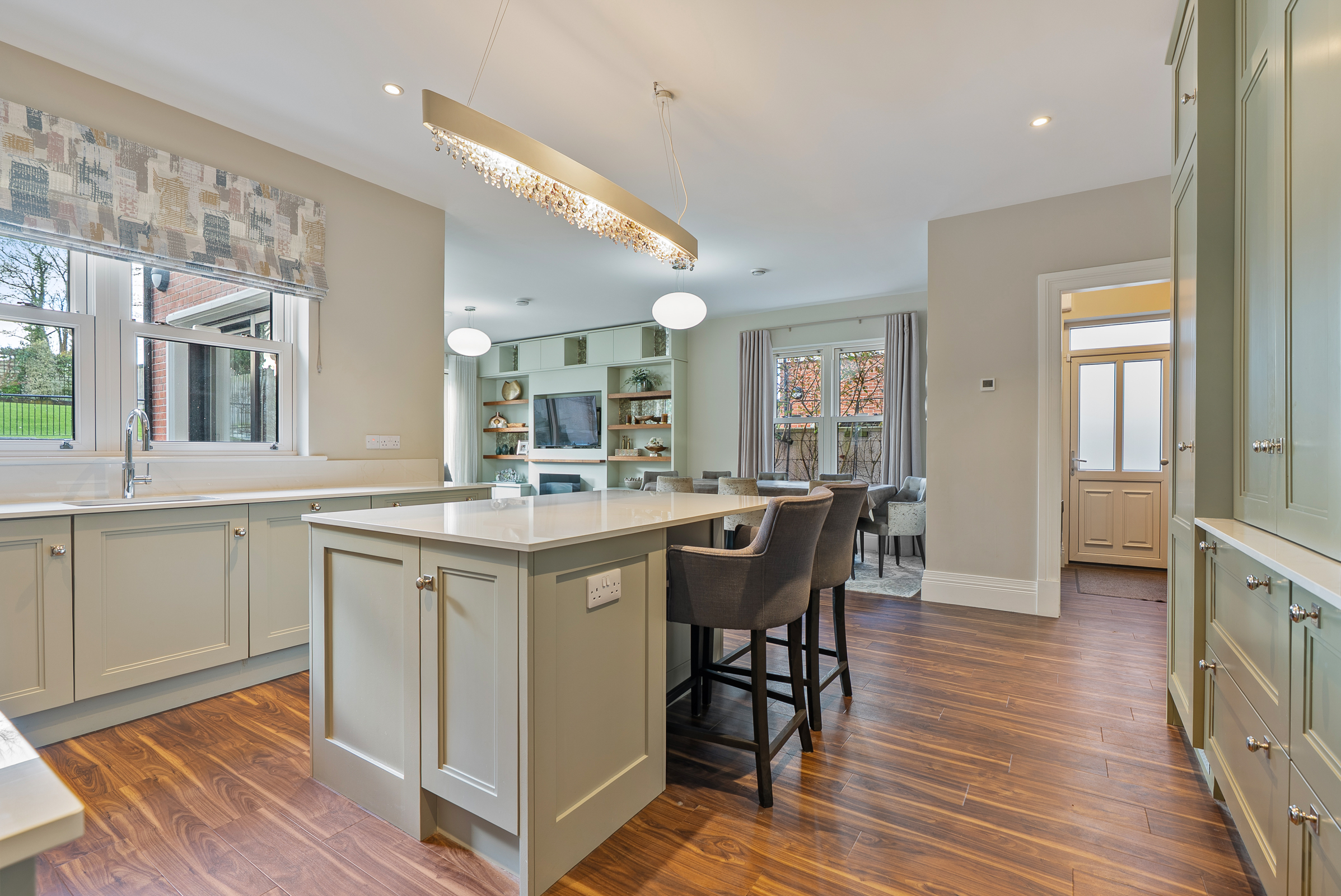 The kitchen has high quality fitted floor to ceiling cabinetry along one wall, incorporating the integrated fridge, the freezer and two electric ovens, with floor level cabinets wrapping round the other two walls, housing the integrated dishwasher and induction hob, which allows for plenty of storage. The extractor is discreetly hidden in an eye level cabinet complimenting the other cabinetry. The extensive worktop counters and splash backs are manufactured from premium Dekton sintered stone. The superb island unit complies of further storage and a seating area, with a feature light fitting overhead. Recessed spot lighting and a window overlooking the back garden, keeps the kitchen bright throughout the day and evening.
