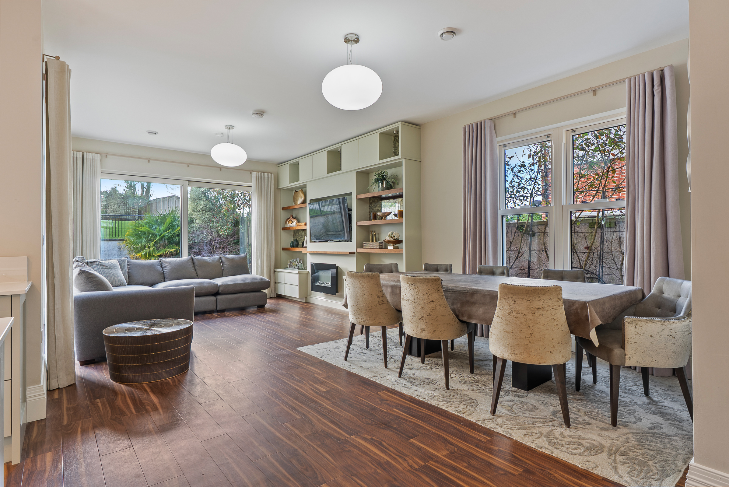 This spacious area has extensive dining space with ample room for a large table and chairs and it leads onto a living area with ample space for a suite of furniture, sliding doors allow access out to the rear patio and onto the garden.